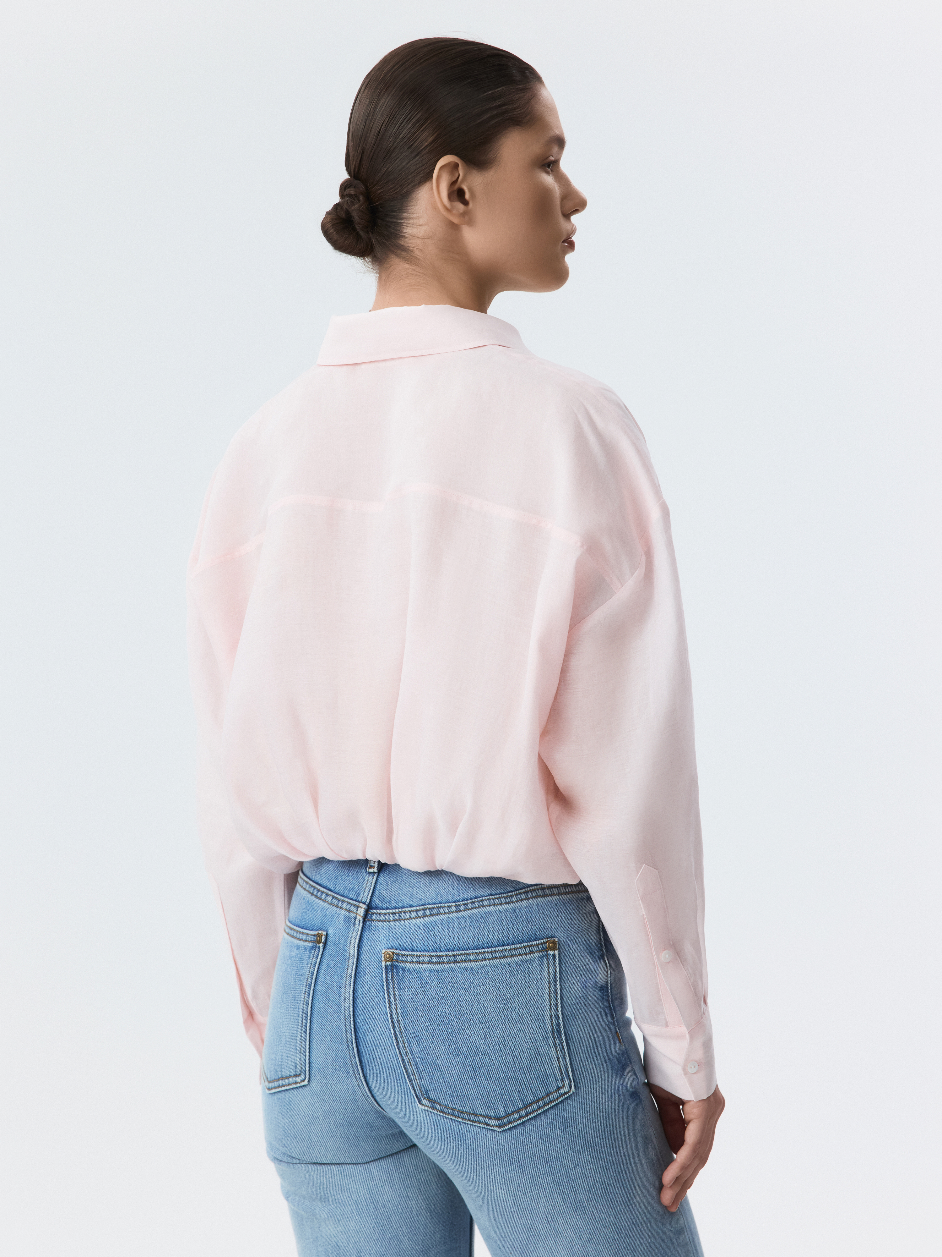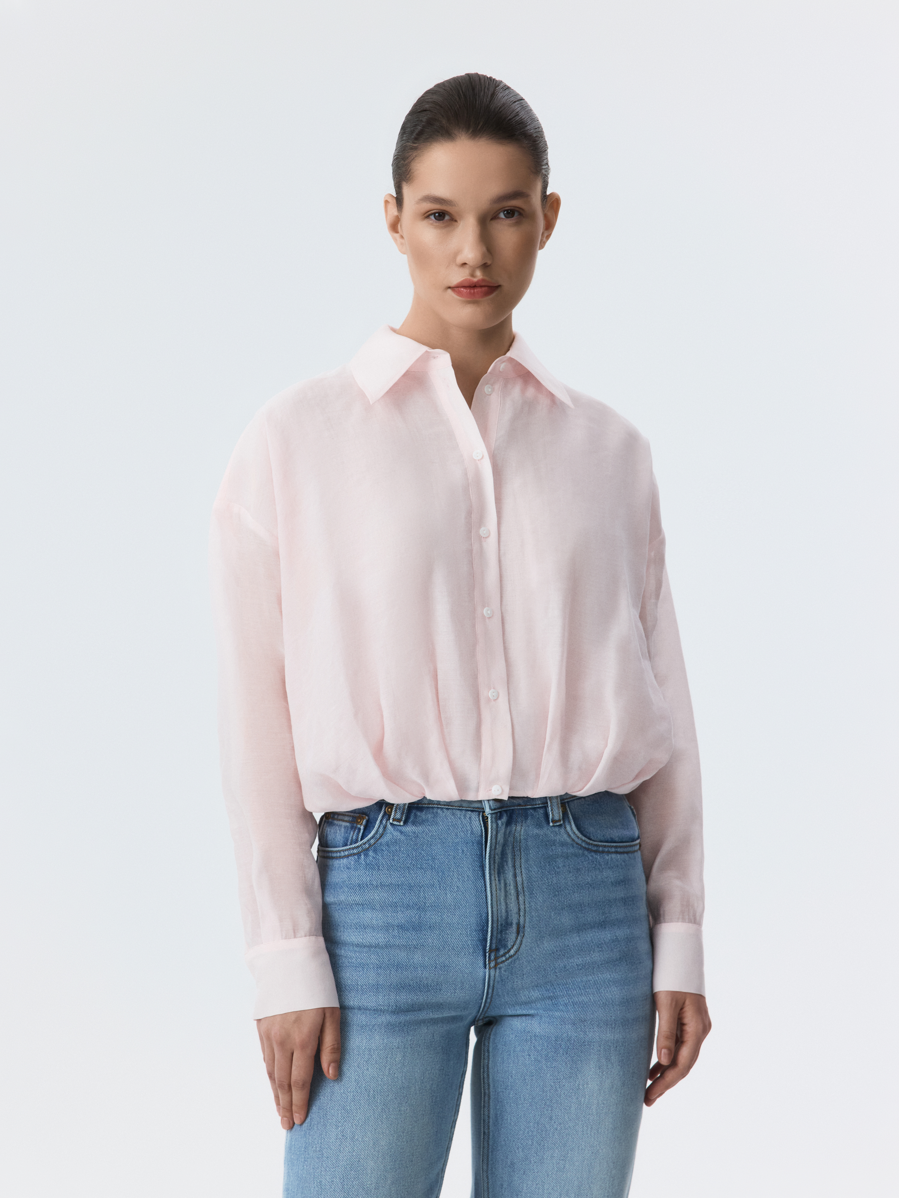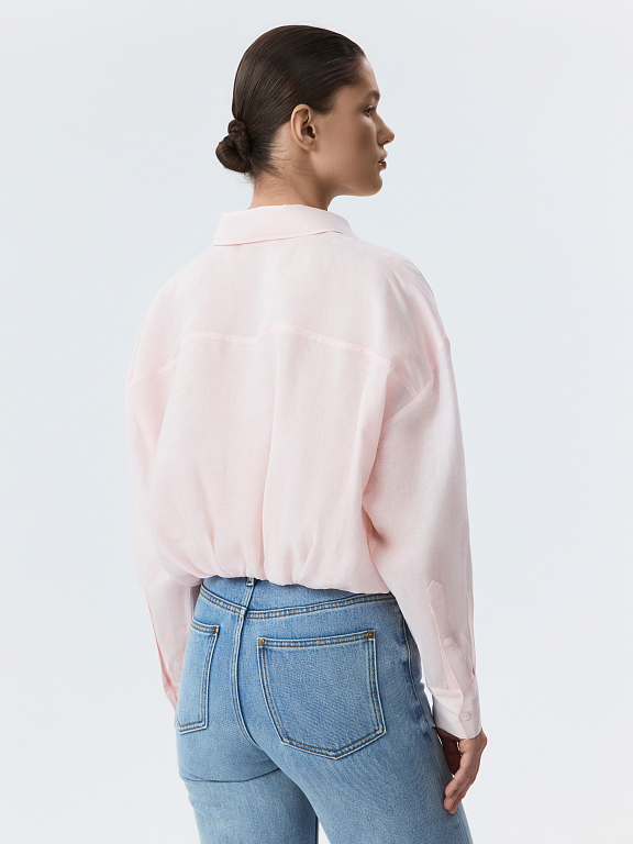 Укороченная блуза с защипами – это современная интерпретация классического предмета гардероба, которая придает образу свежесть и актуальность.  Тонкий полупрозрачный текстиль на основе лиоцелла (волокна целлюлозы) хорошо пропускает воздух и дарит комфорт.