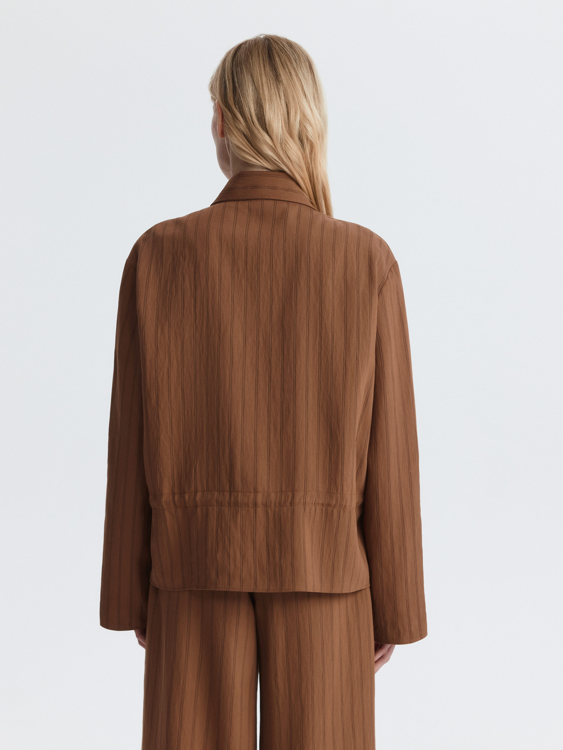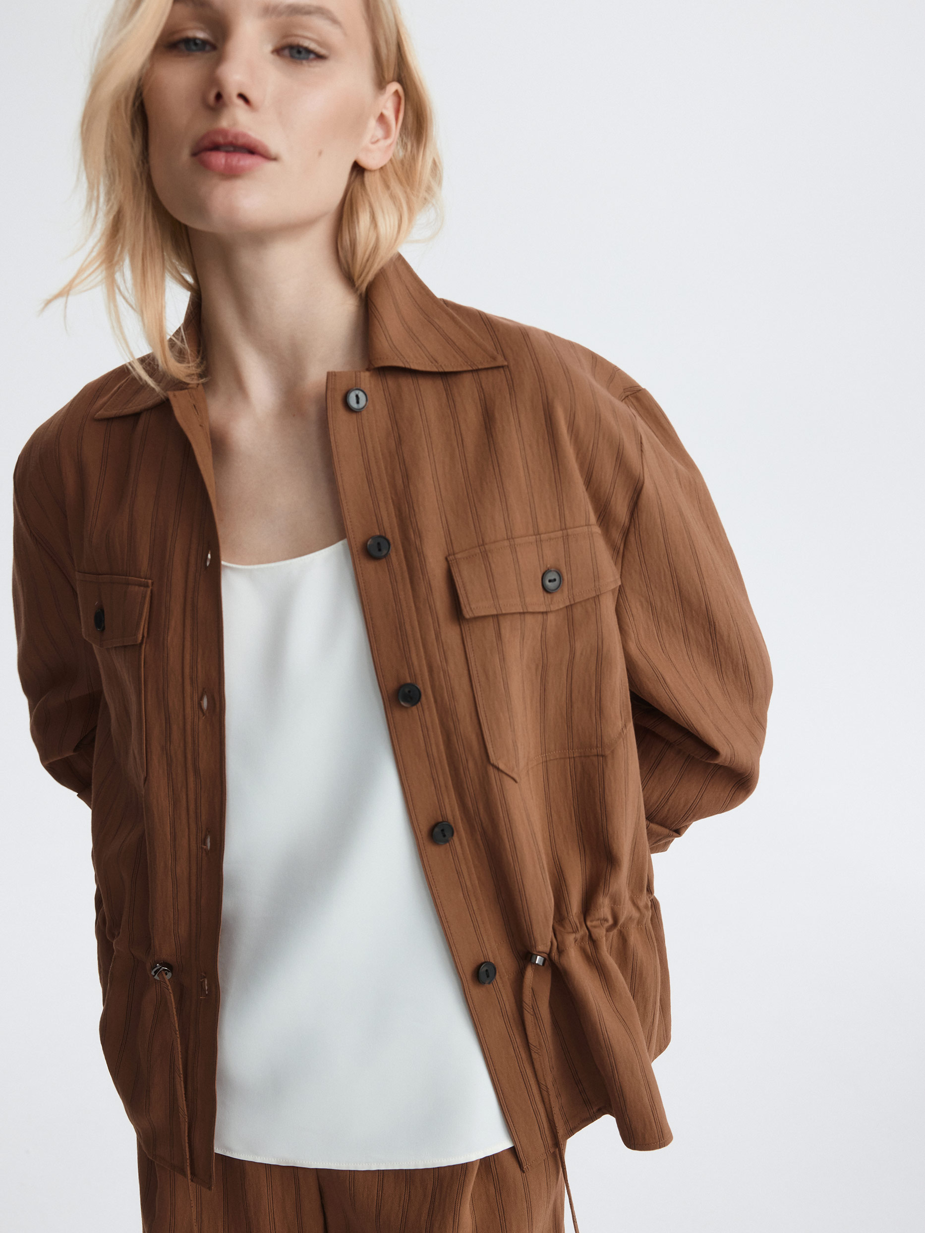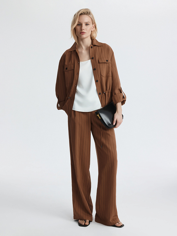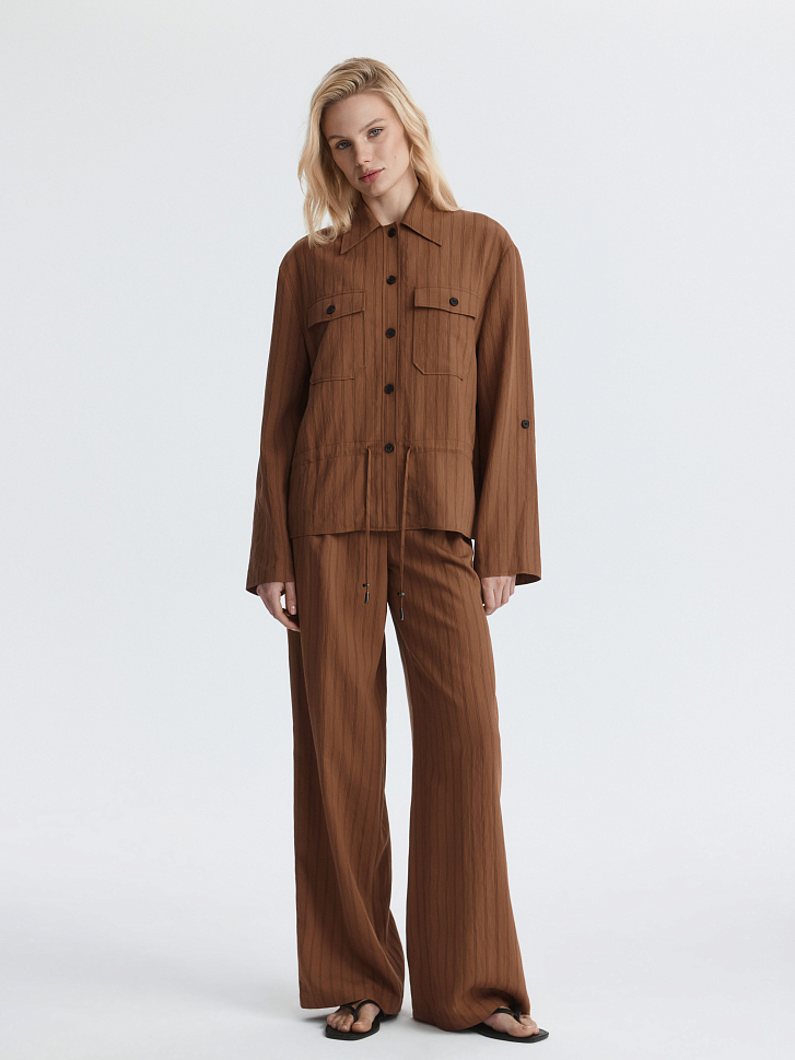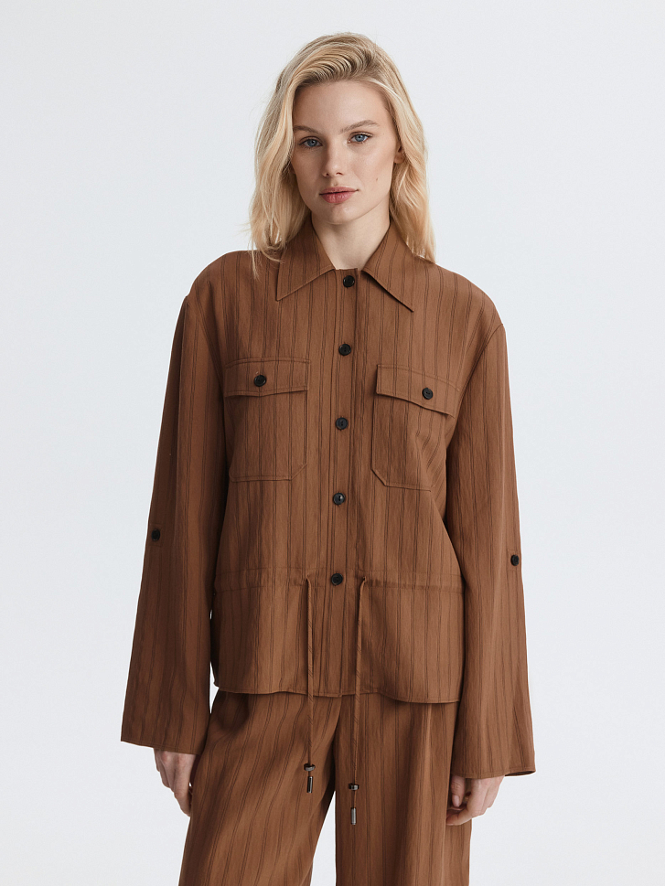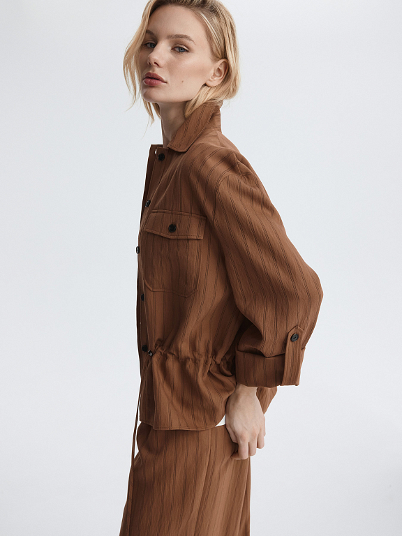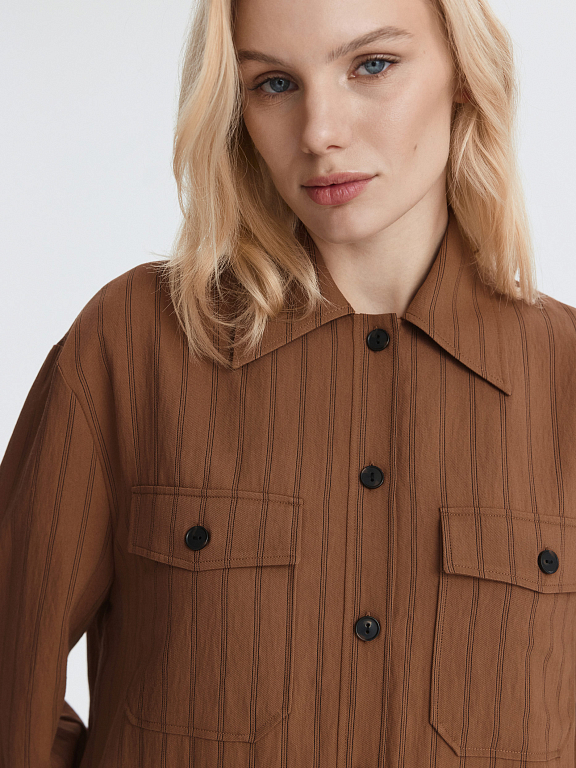 Укороченная рубашка в полоску – удобная и практичная база на каждый день. Тонкий текстиль на основе вискозы легко струится и комфортно прилегает к телу. Модель расслабленно сидит по фигуре, а для более приталенного силуэта можно завязать кулиску.
