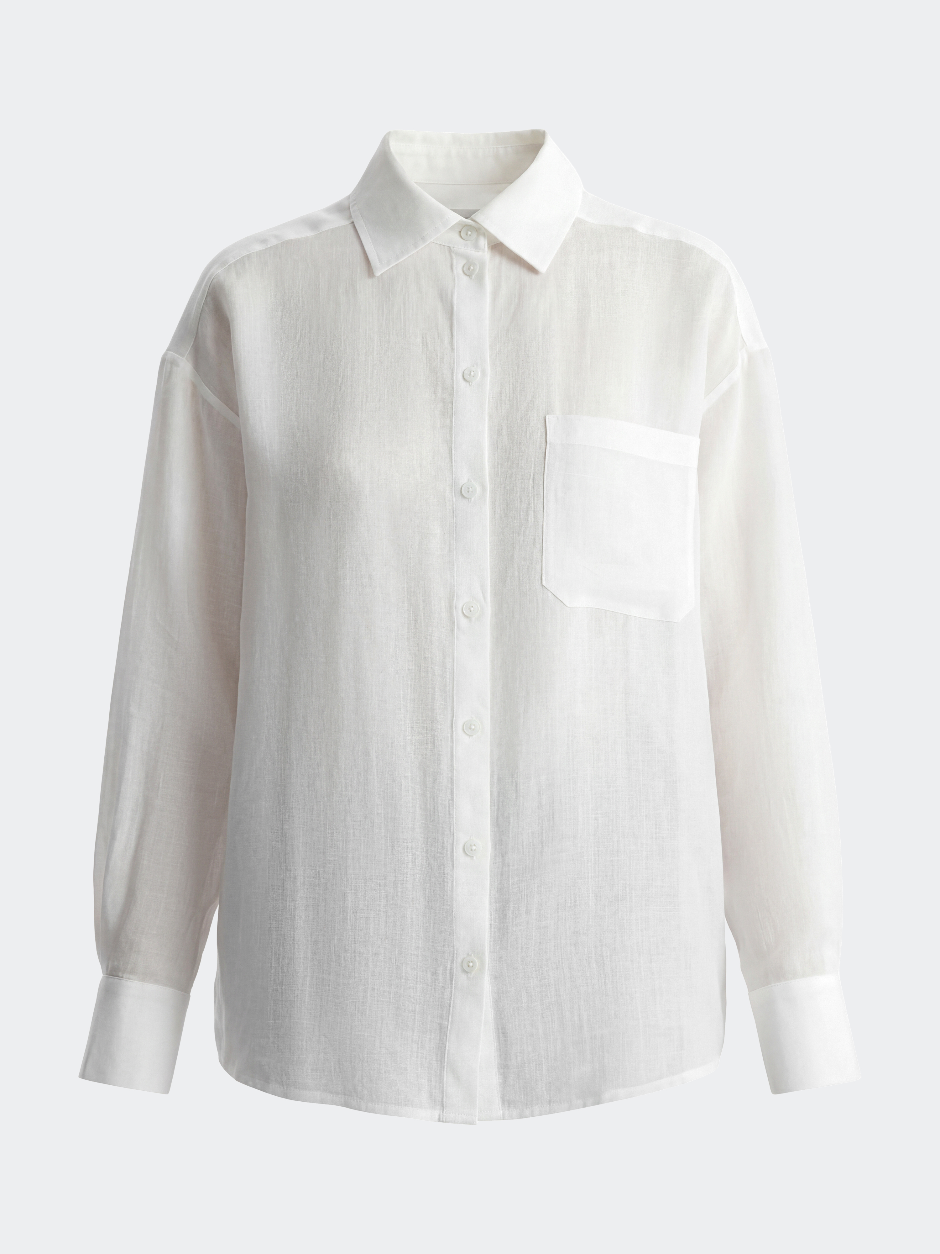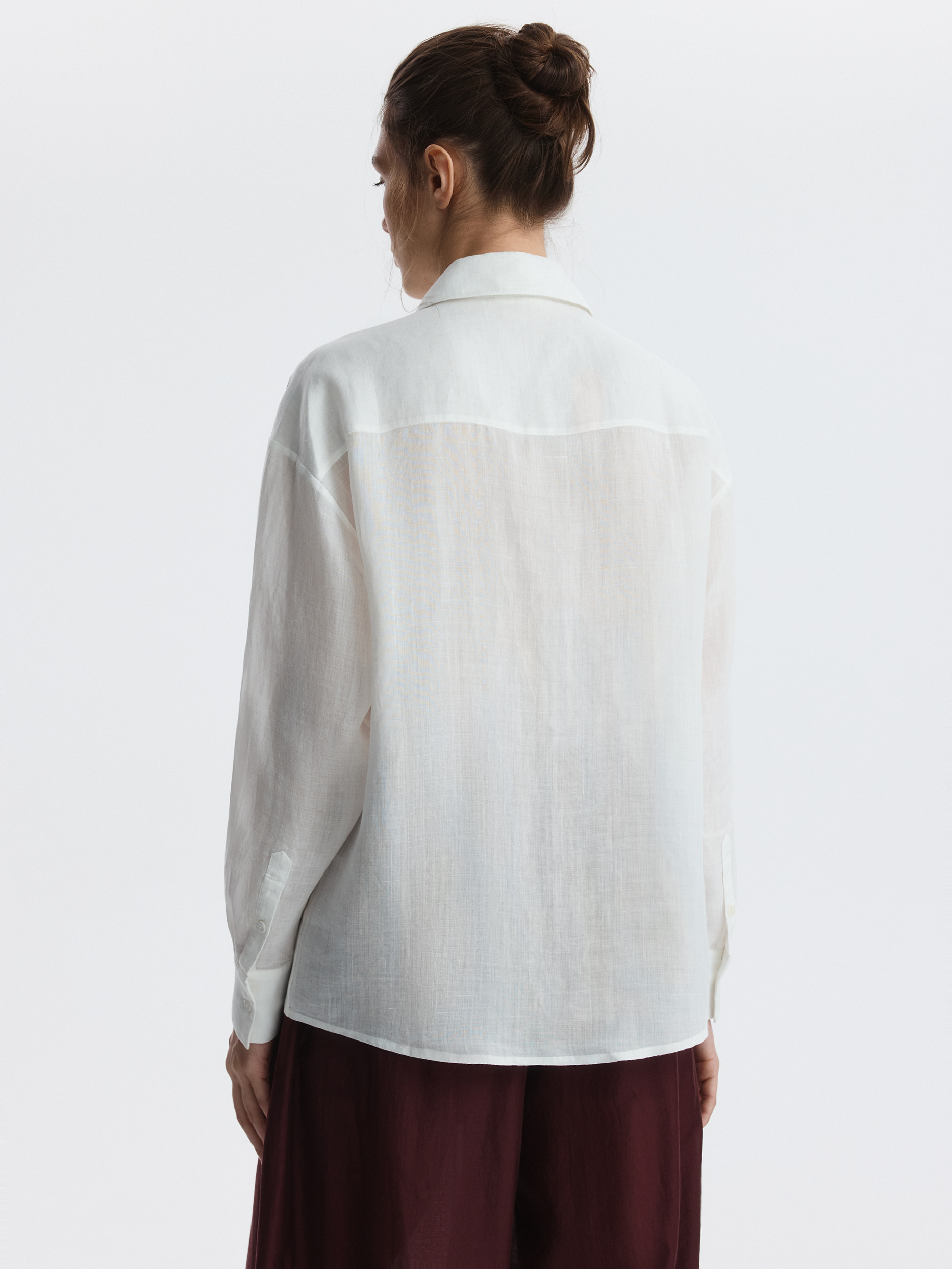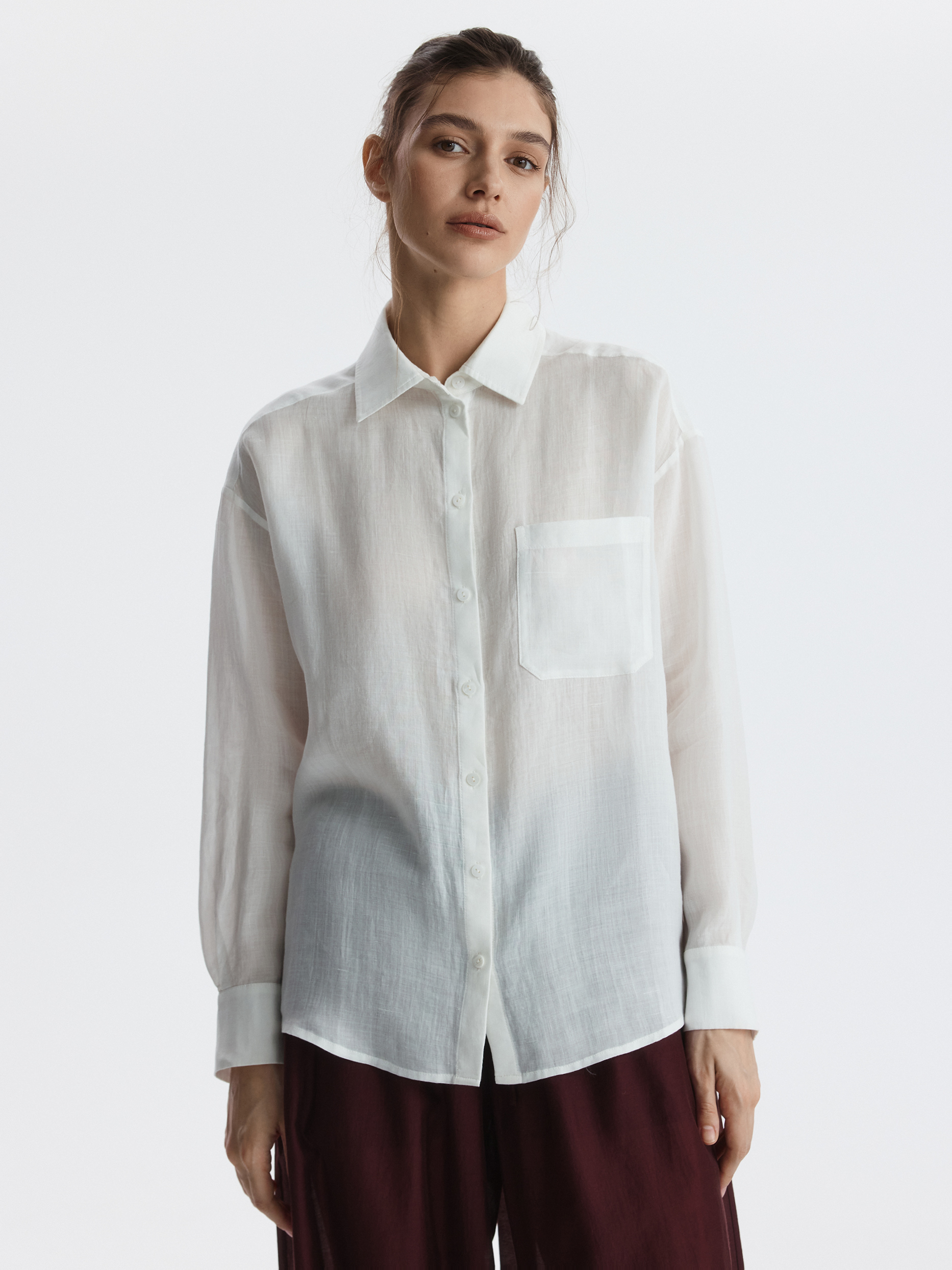 Тонкая рубашка свободного кроя станет базовым вариантом для лета в городе или пляжного отпуска. Натуральная ткань рами из волокон крапивы впитывает влагу, при этом хорошо пропускает воздух и дарит комфорт в жаркий день.