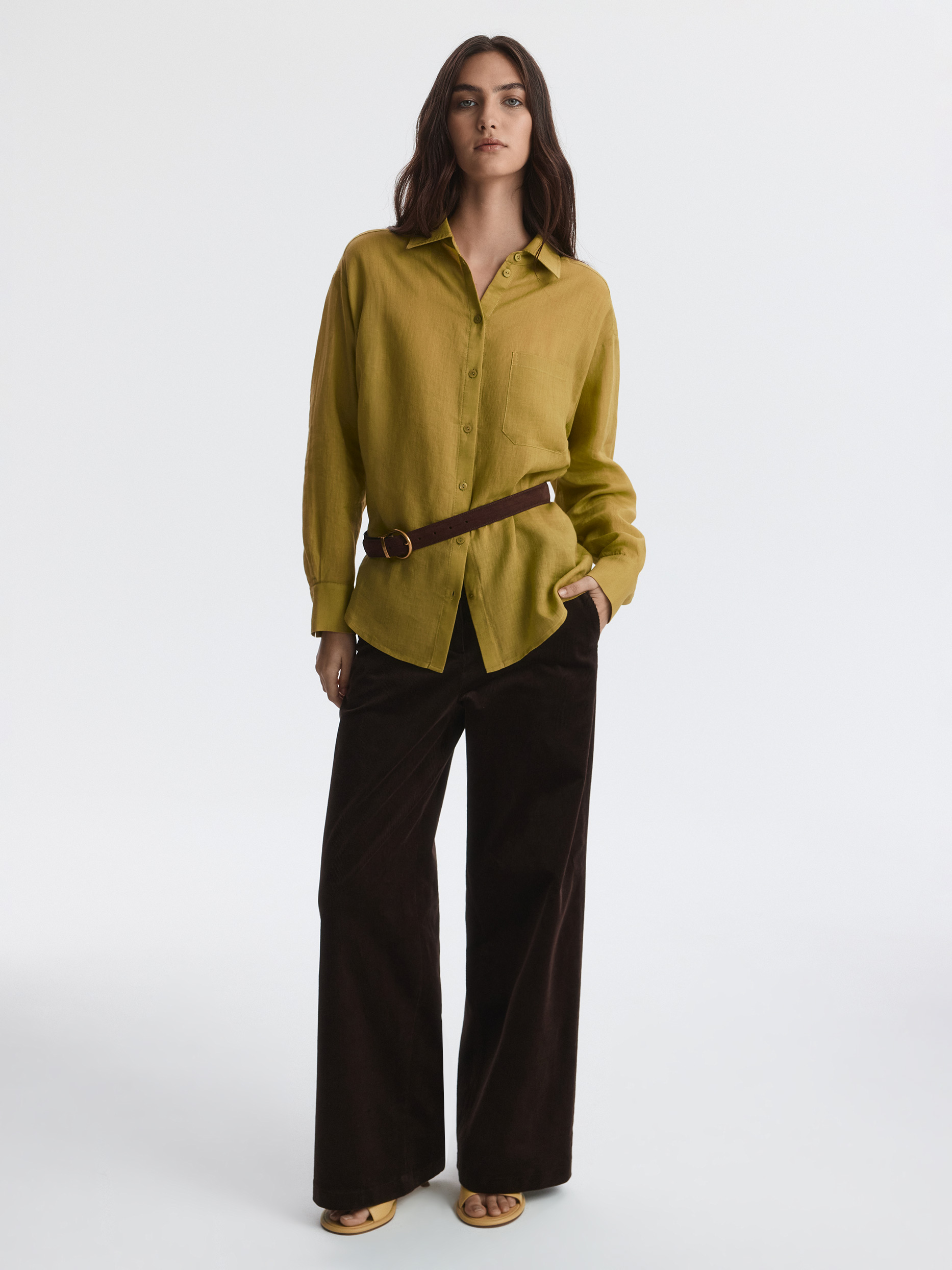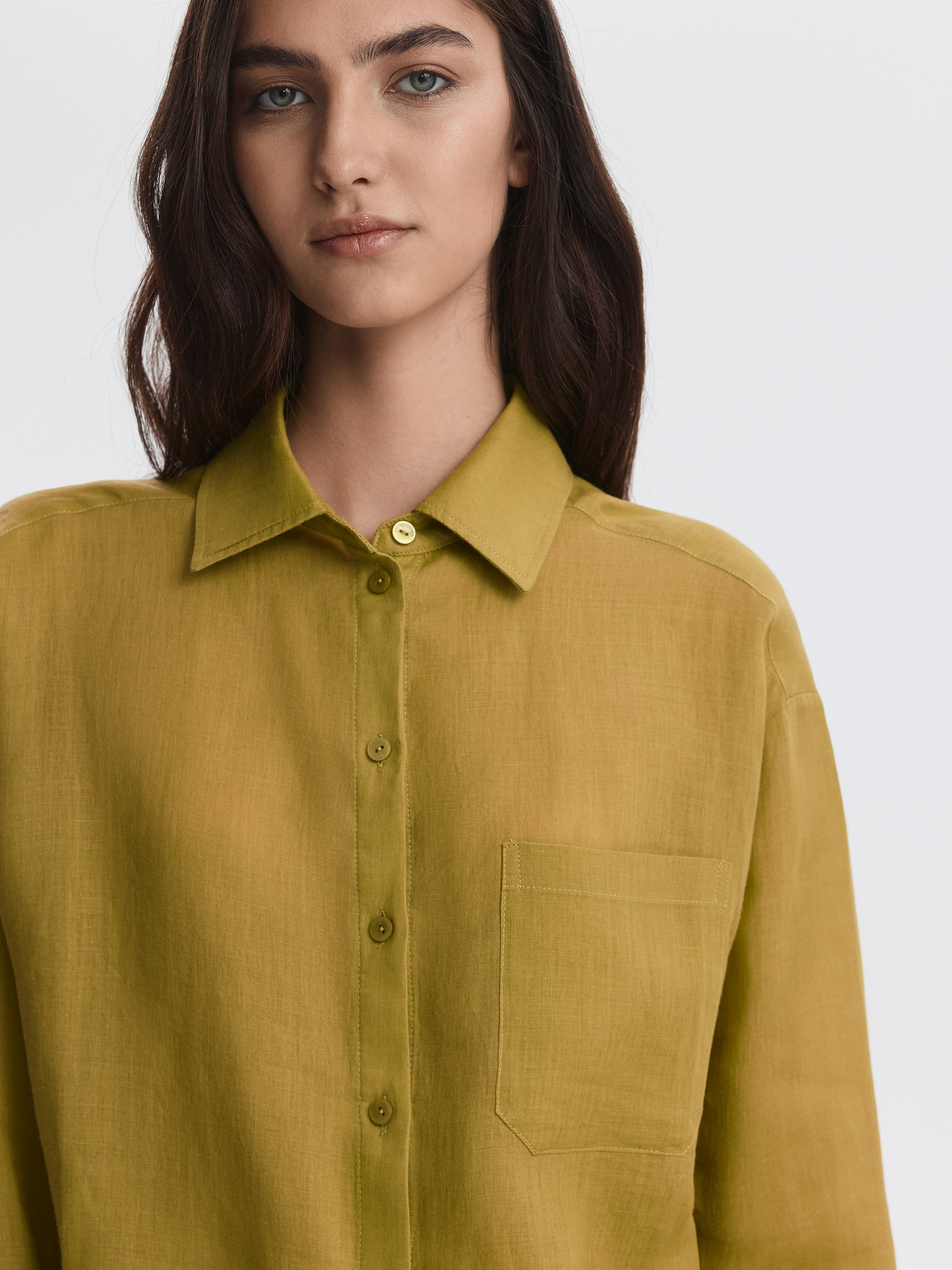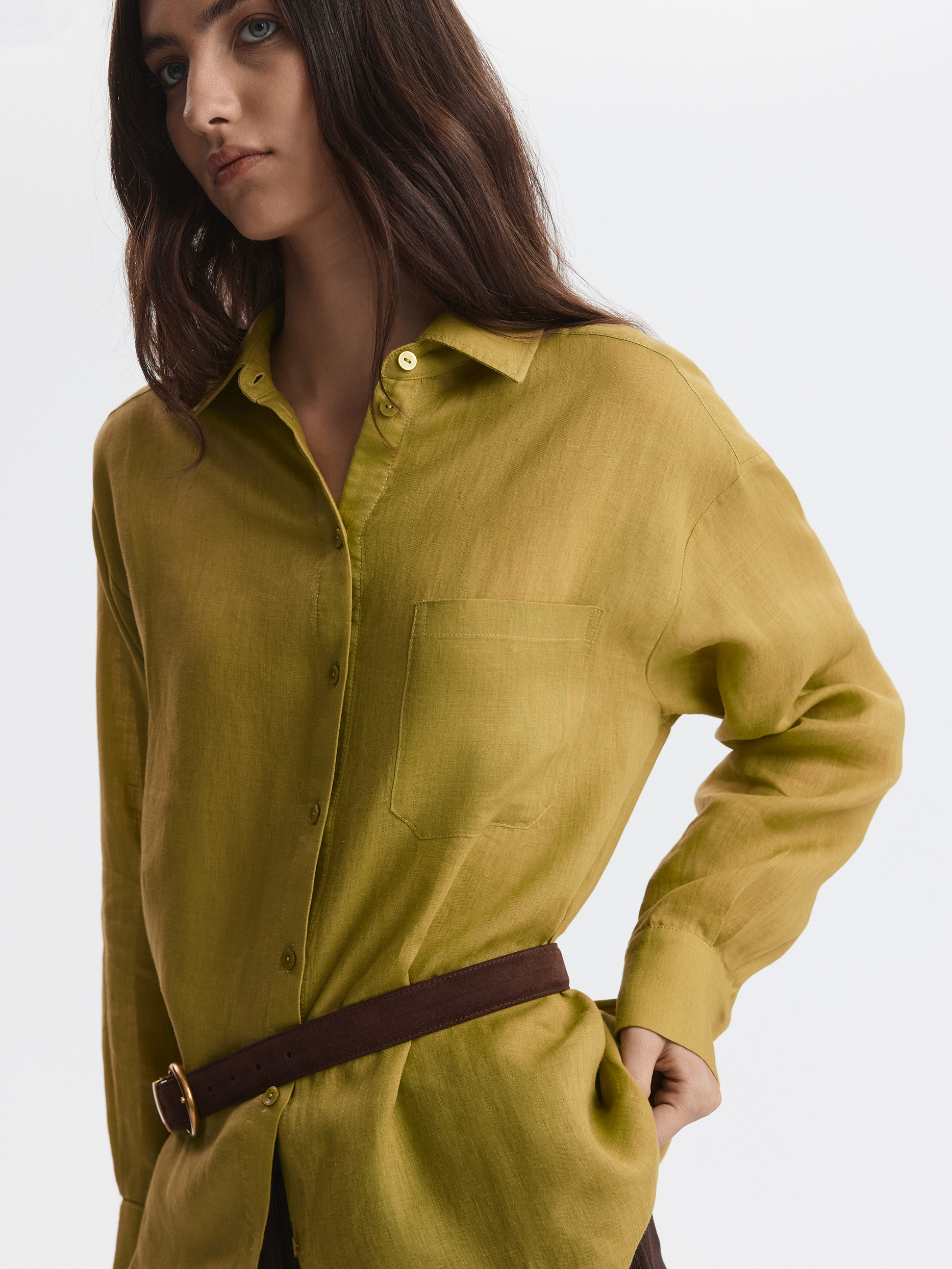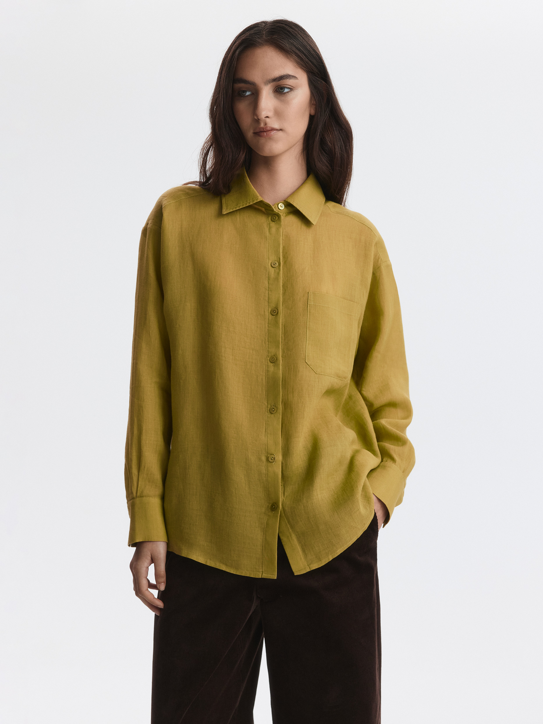 Тонкая рубашка свободного кроя станет базовым вариантом для лета в городе или пляжного отпуска. Натуральная ткань рами из волокон крапивы впитывает влагу, при этом хорошо пропускает воздух и дарит комфорт в жаркий день.