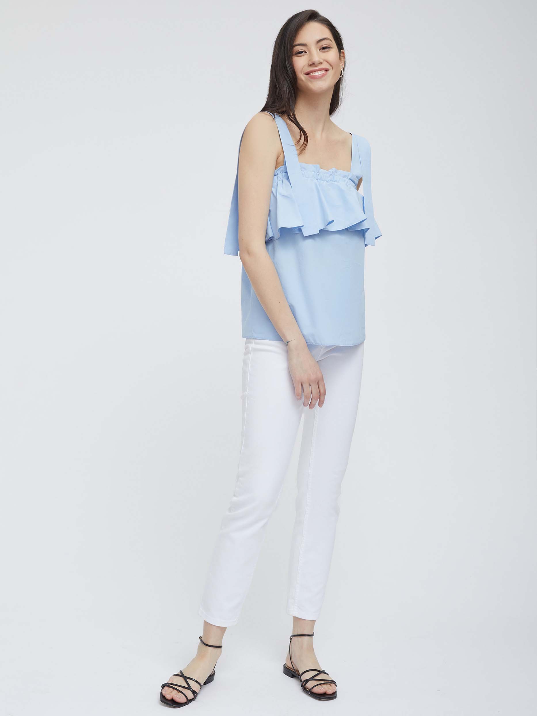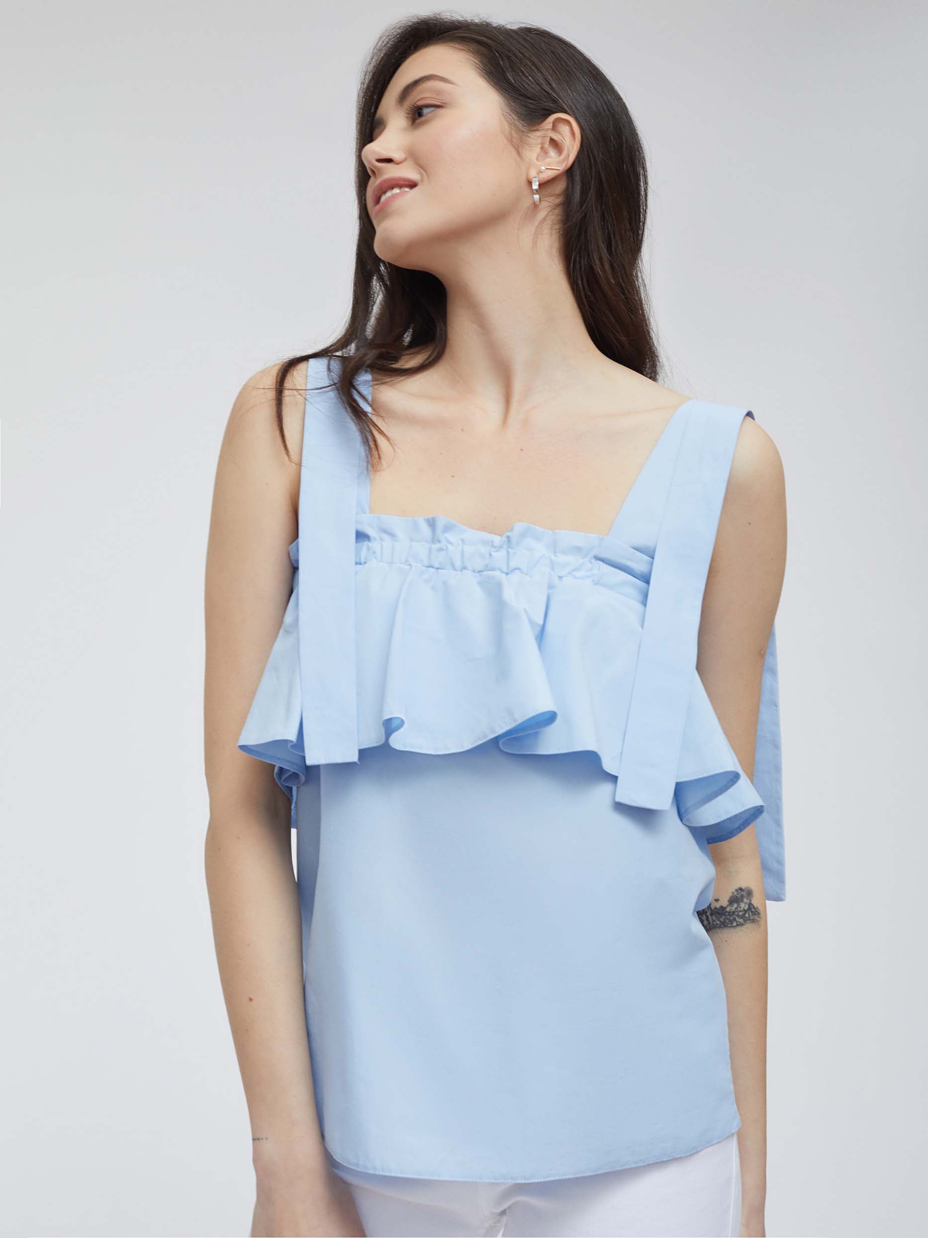 Однотонный топ из 100% хлопка. Свободный крой, широкий волан, широкие бретели.