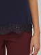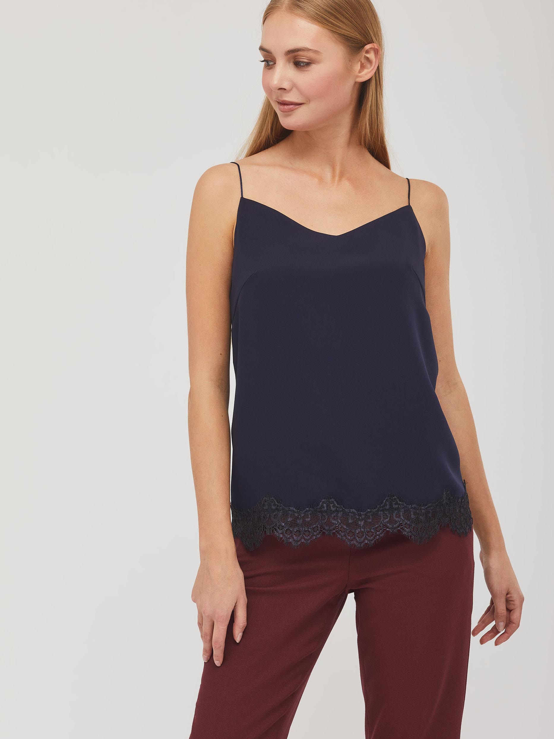 Однотонный топ с кружевной окантовкой снизу и узкими бретелями. Изделие без подкладки.  Рост модели 172 см, размер 42 (российский)