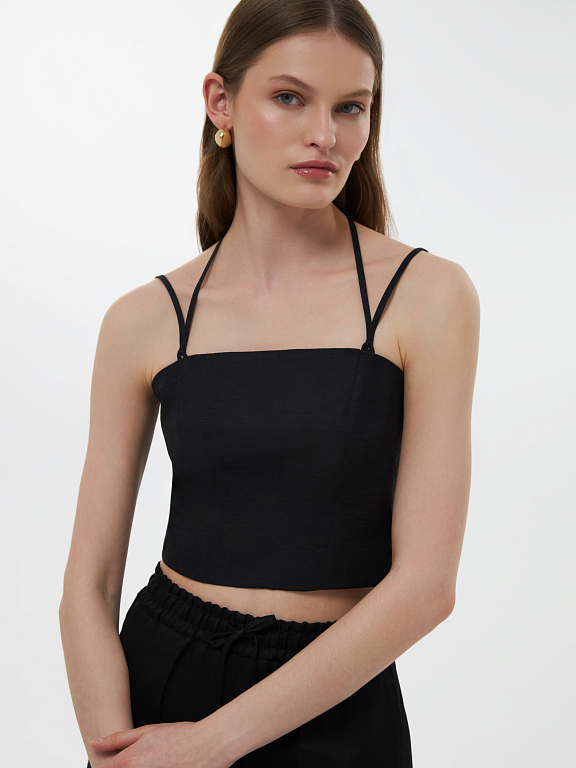 Укороченный топ с полуоткрытой спиной станет стильным элементом как повседневного, так и вечернего образа. В меру плотный текстиль на основе волокон конопли обладает прочностью, который продублирован хлопковой подкладкой для комфорта. Архитектурность кроя подчеркнута тонкими бретелями на завязках.