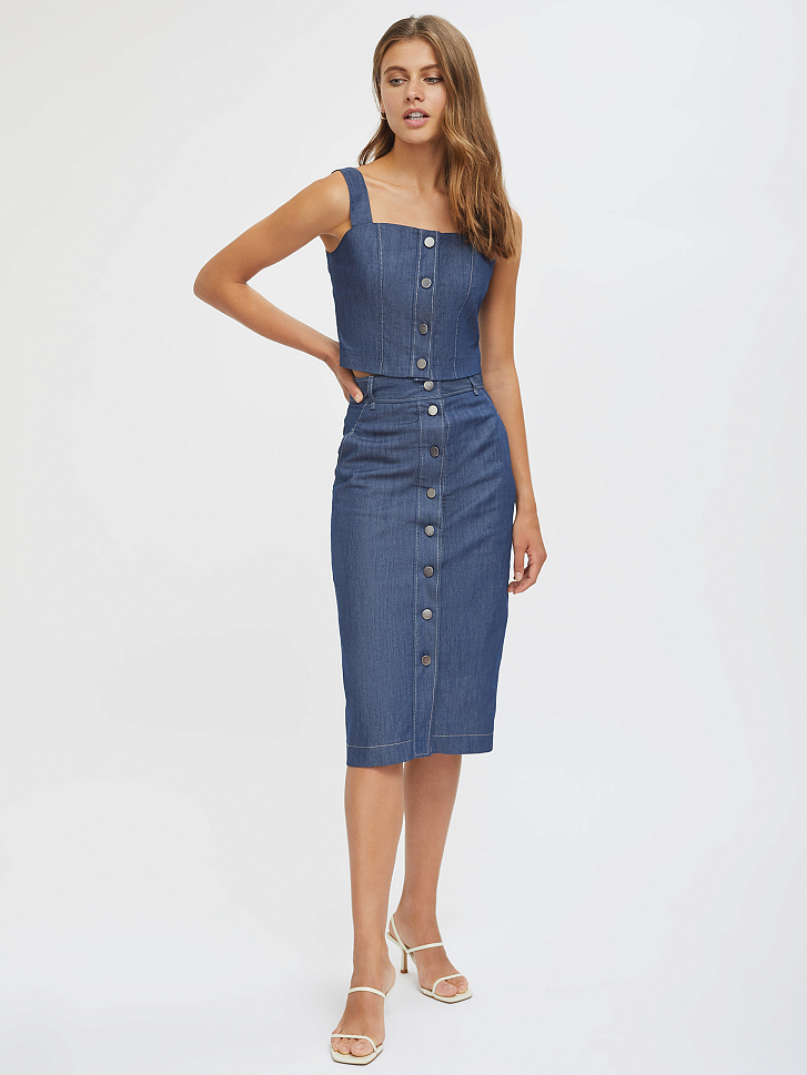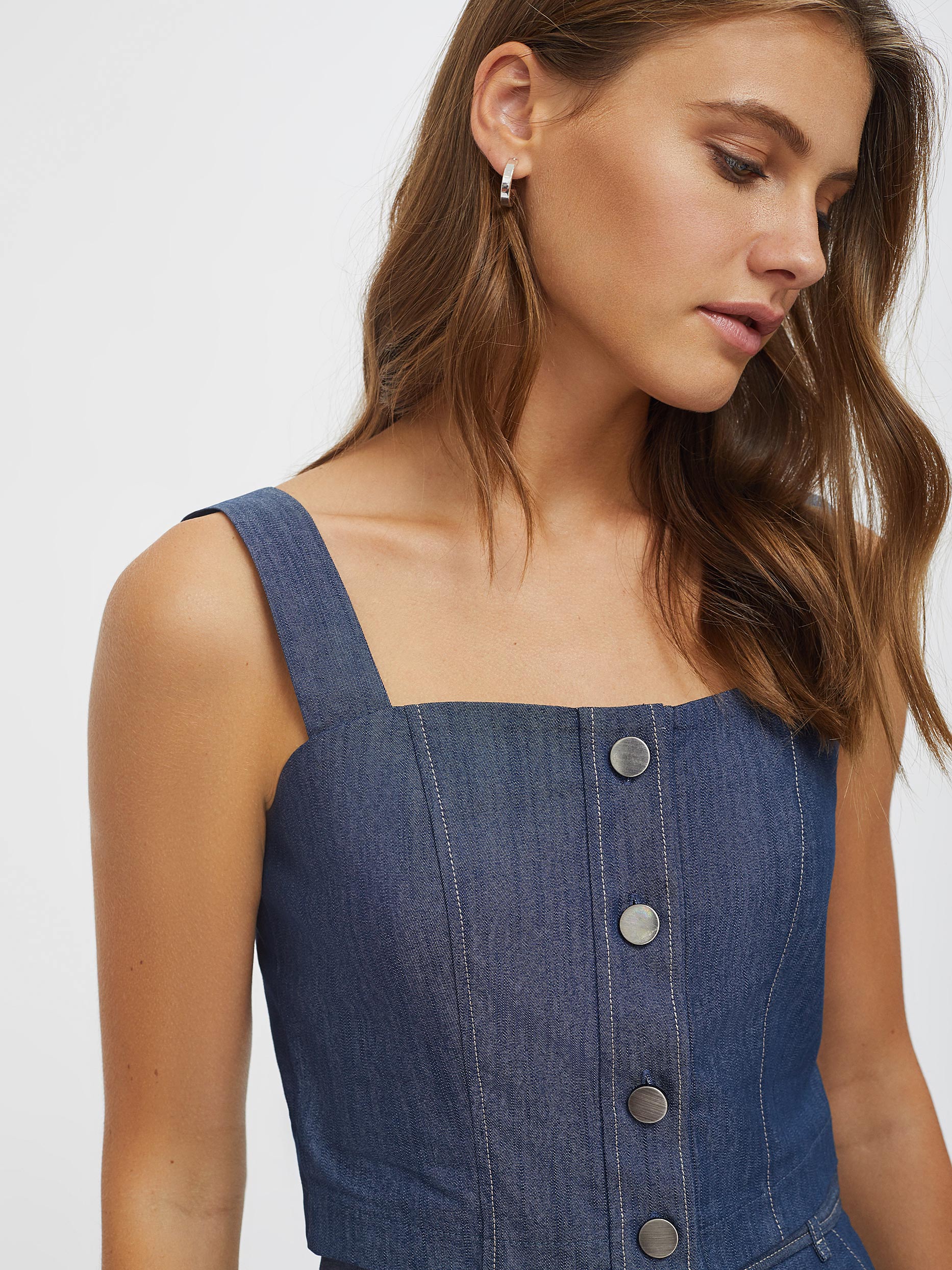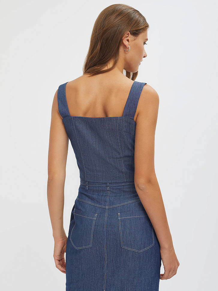Укороченный топ из денима на пуговицах. Облегающий силуэт, широкие бретели.