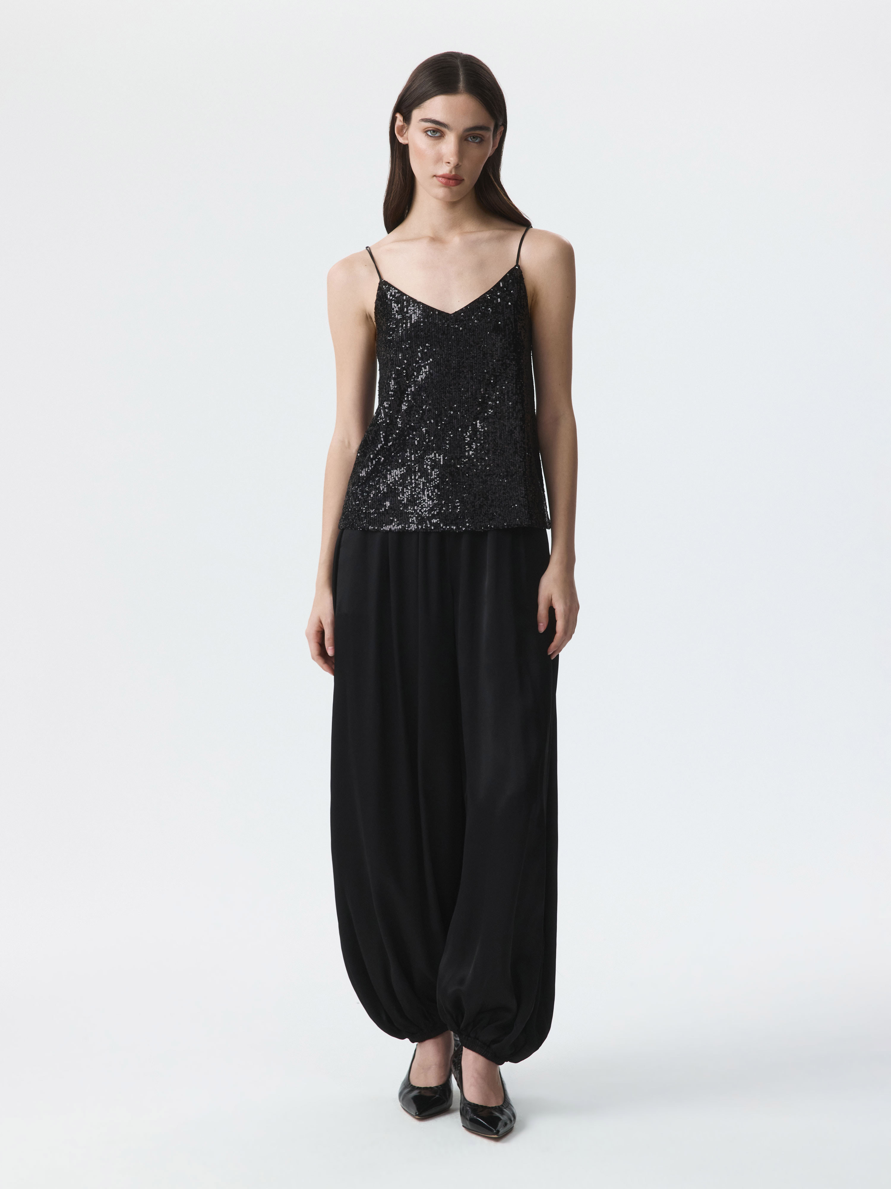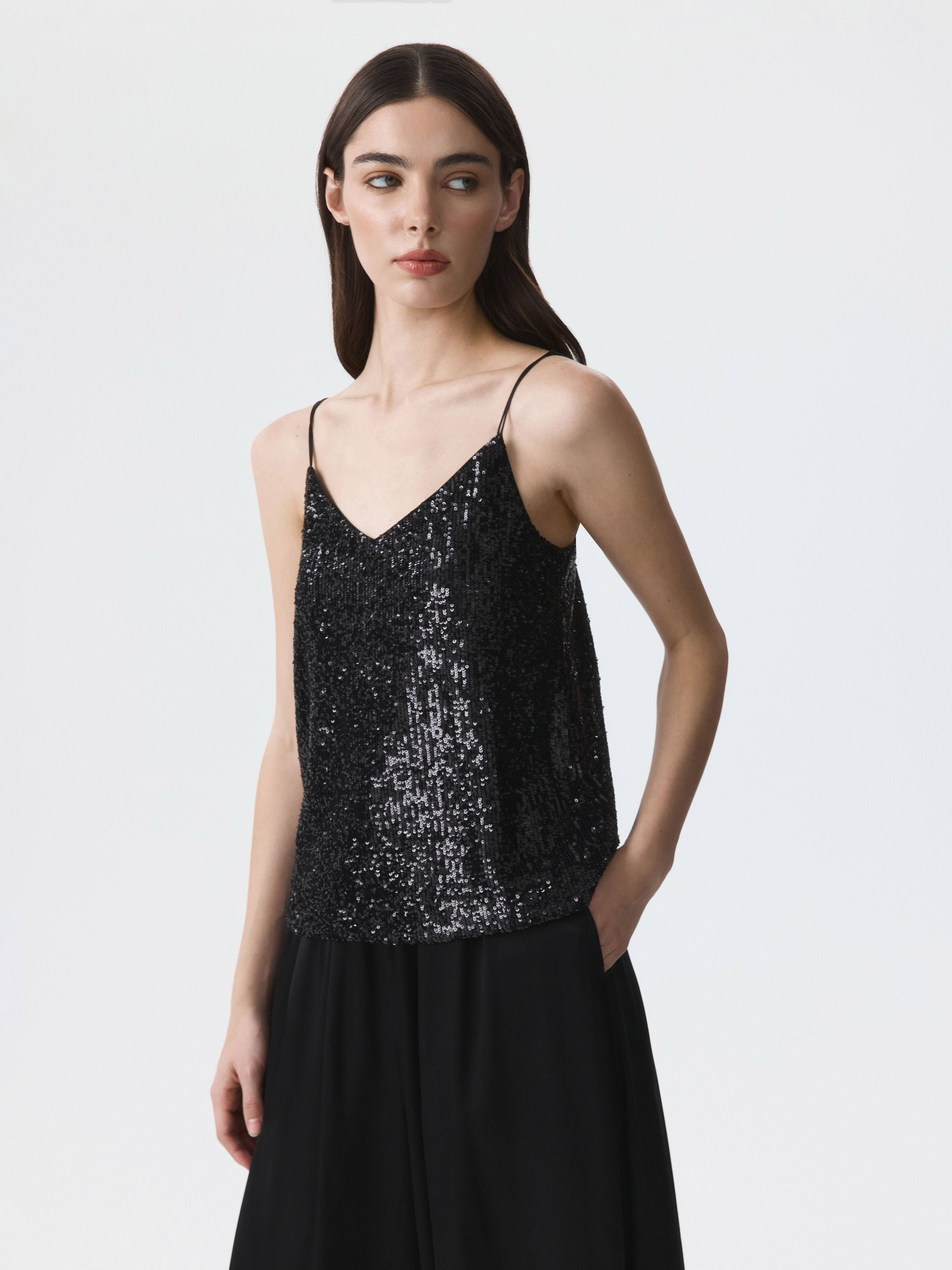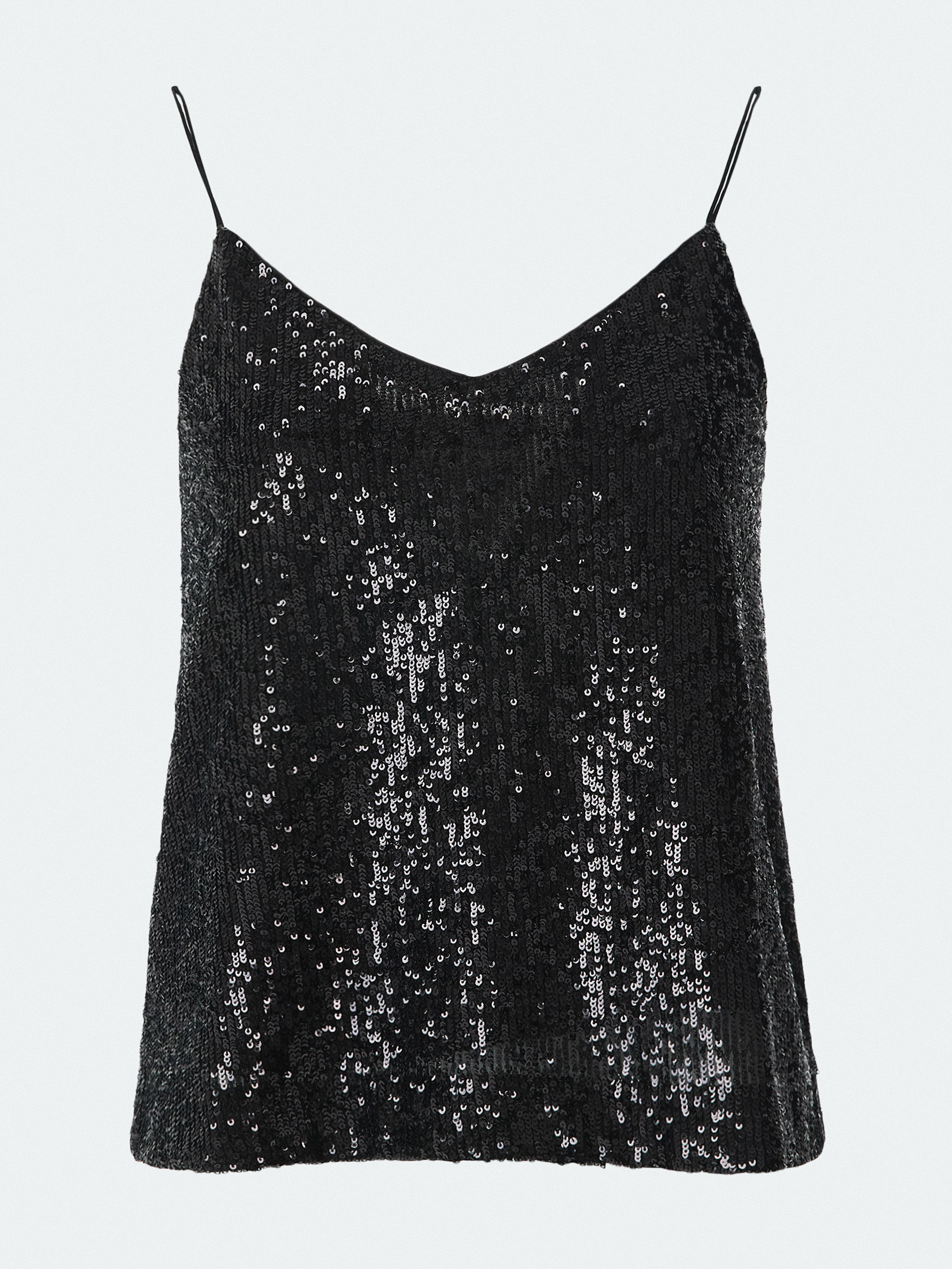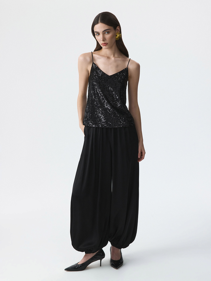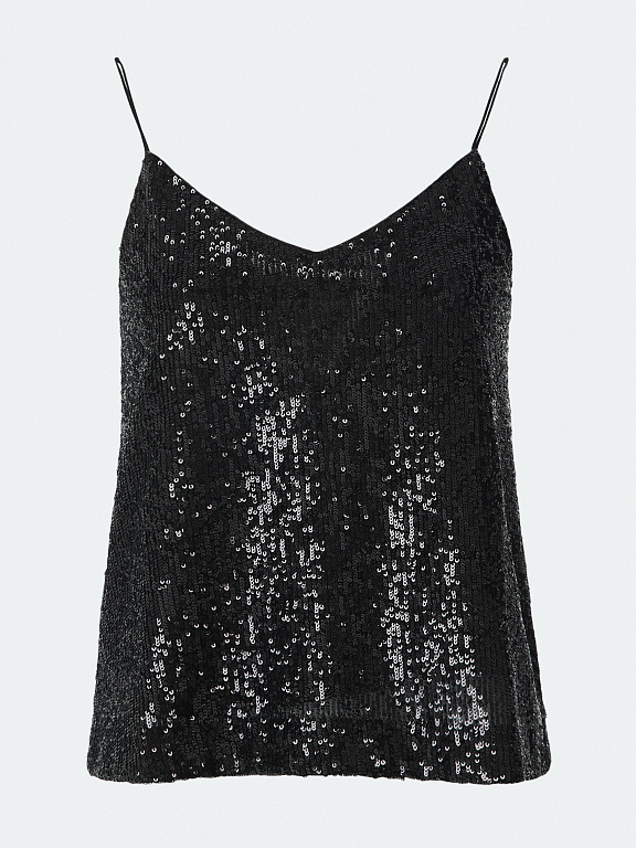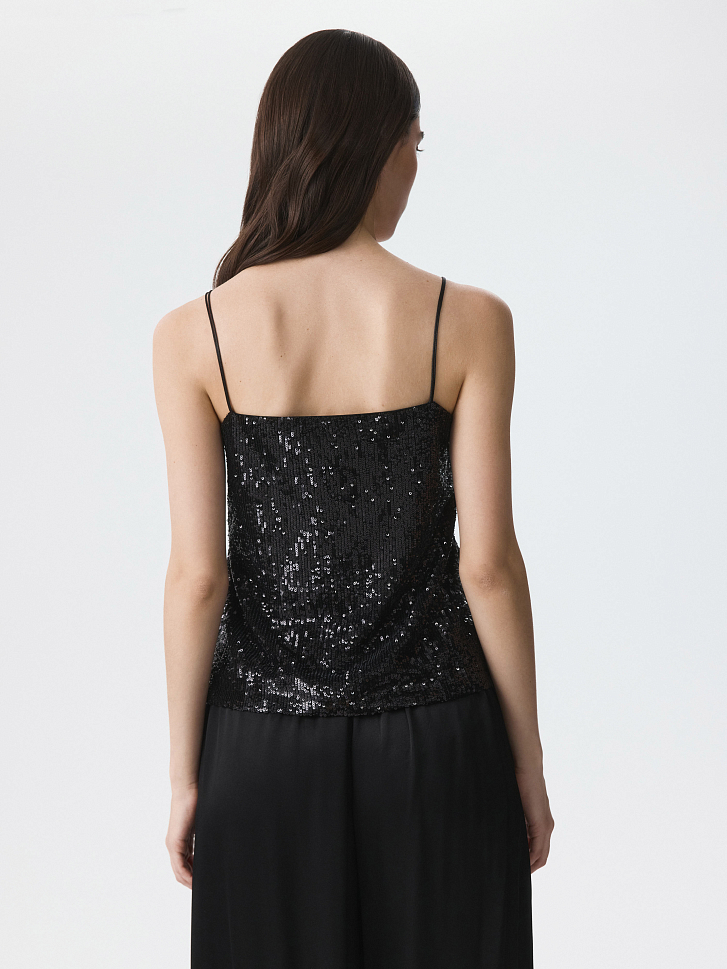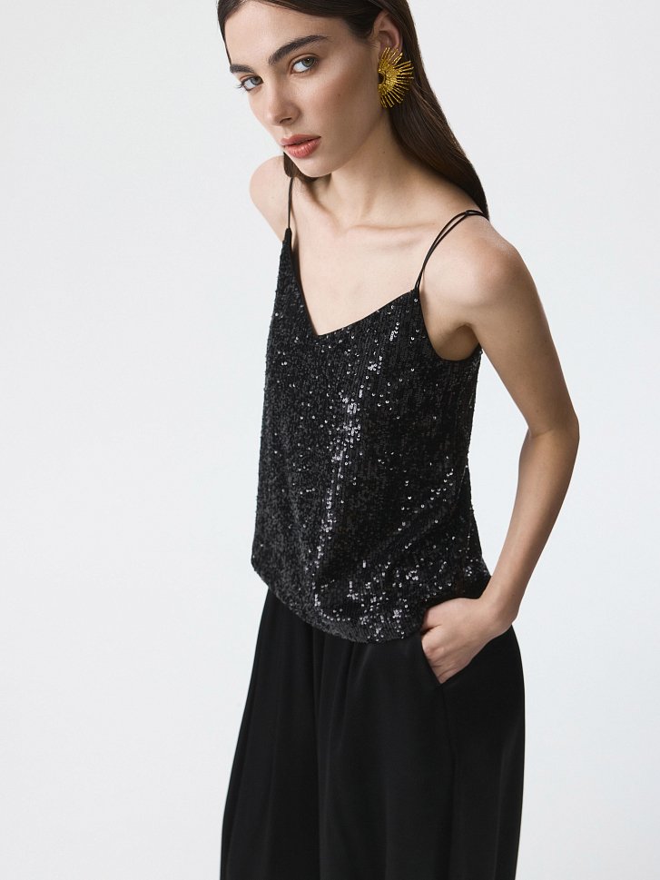 Топ с пайетками добавит сияния в любой образ: модель будет актуальна в комбинации с классическими брюками, джинсами или атласной юбкой. Тонкую сетку продублировали капроновой подкладкой, чтобы снизить колючесть декора.