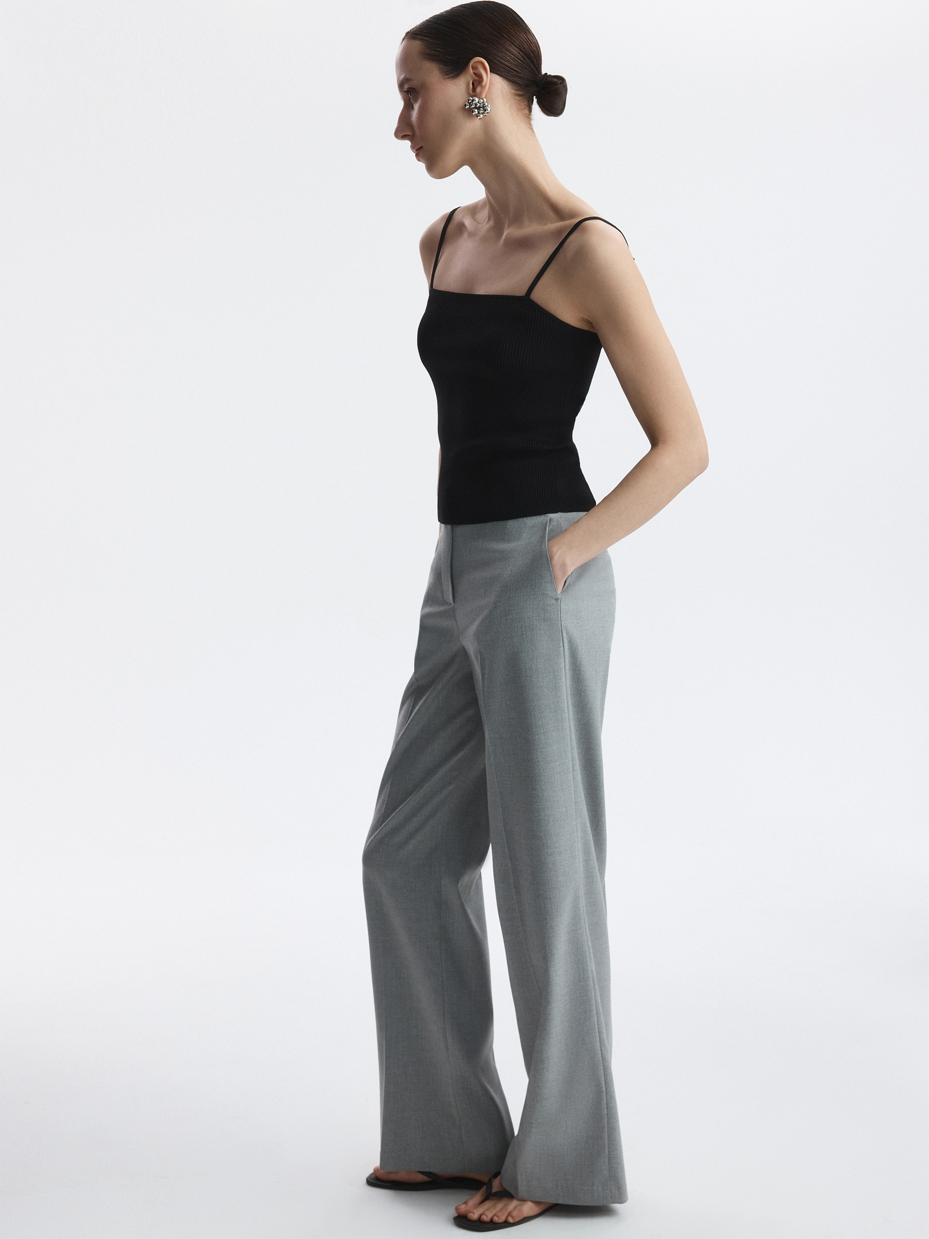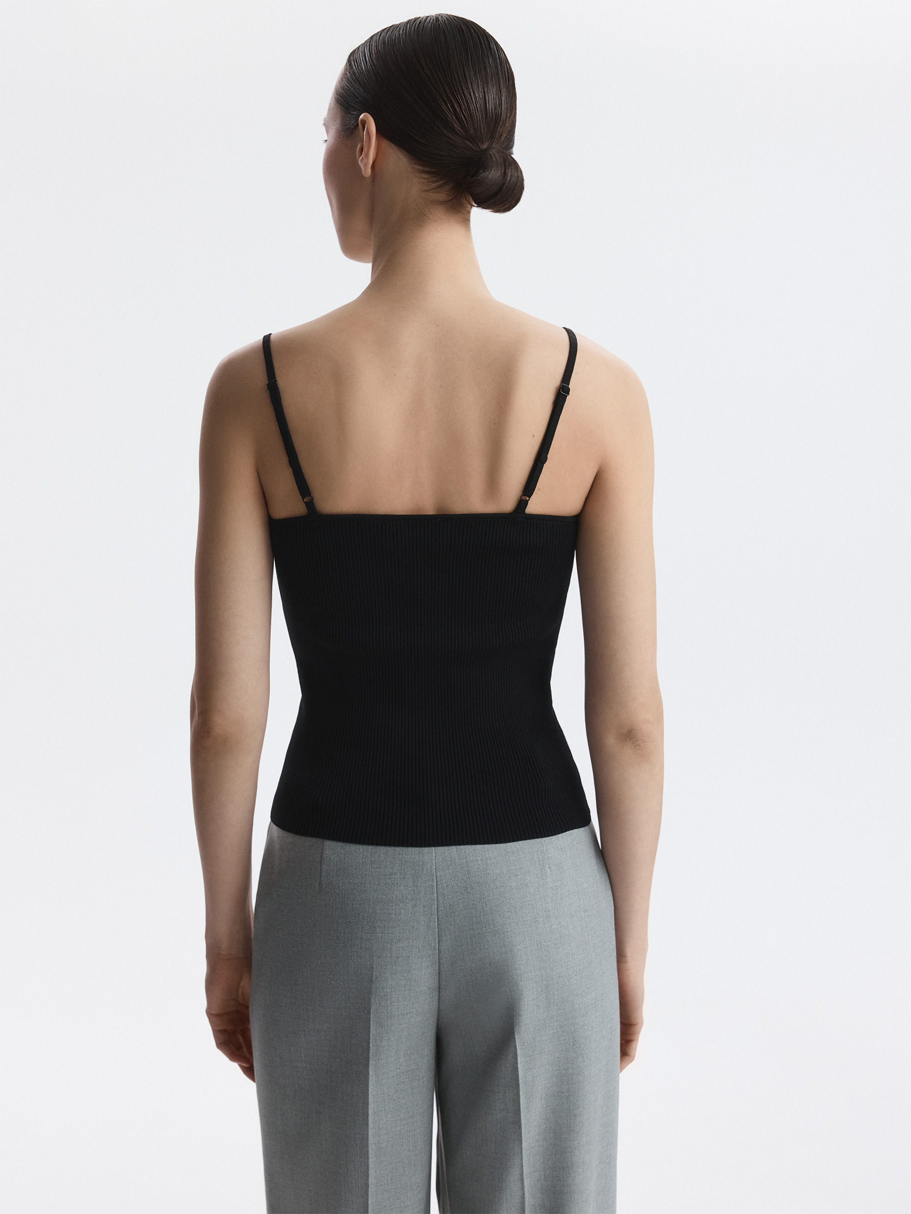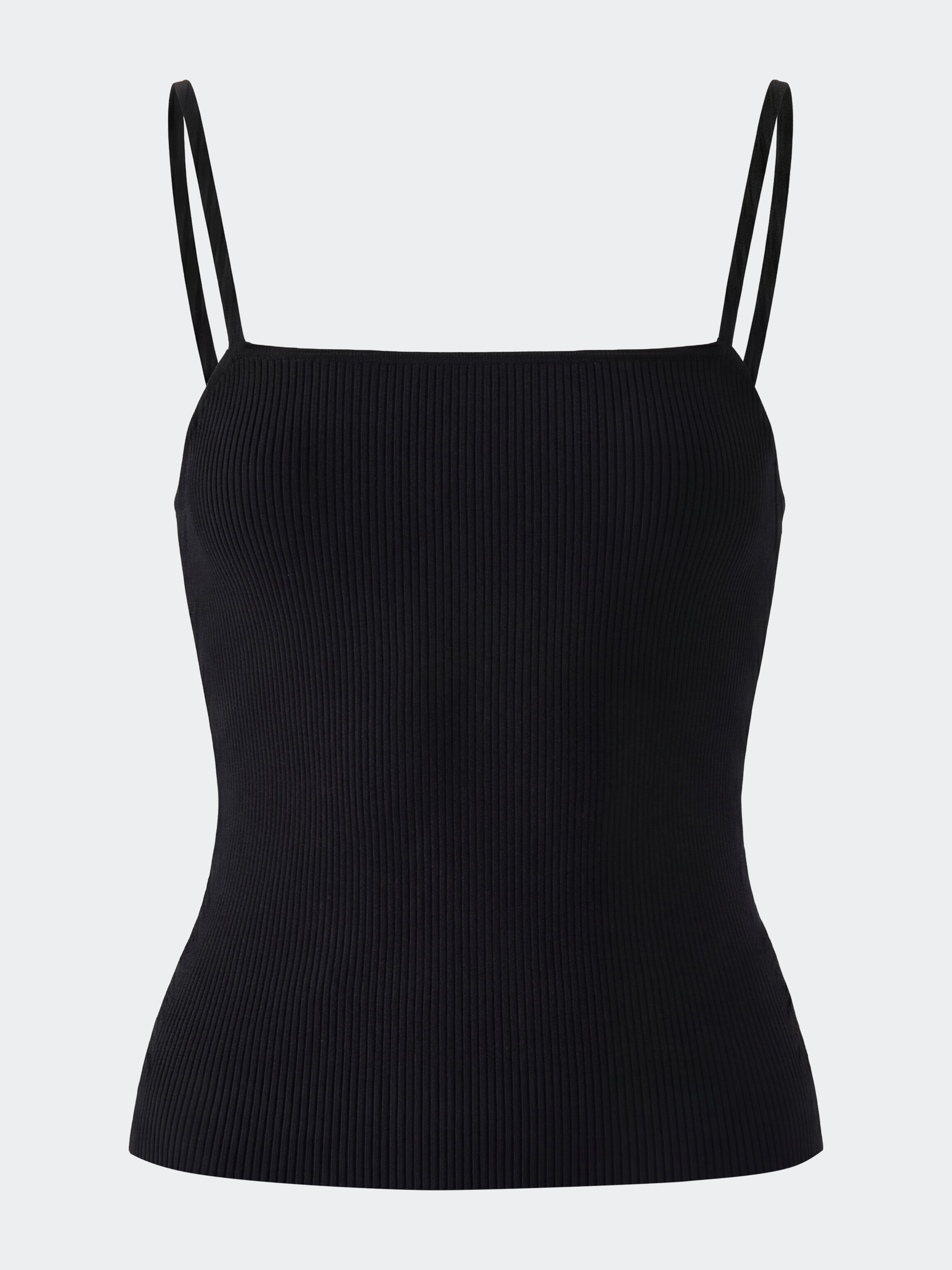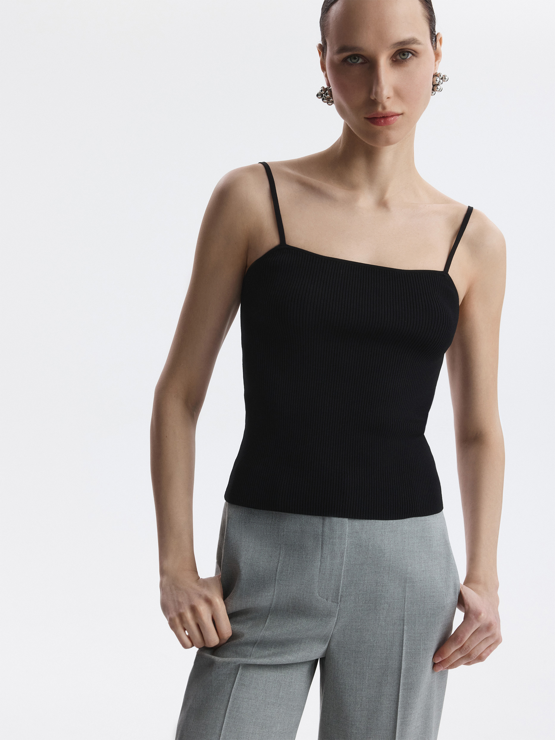 Топ на бретелях может быть разным, в зависимости от того, с чем его носить – сам по себе или под рубашку. Тонкий дышащий трикотаж из вискозы в рубчик мягко прилегает, а благодаря эластичным волокнам хорошо тянется. Длину бретелей можно регулировать для оптимальной посадки.