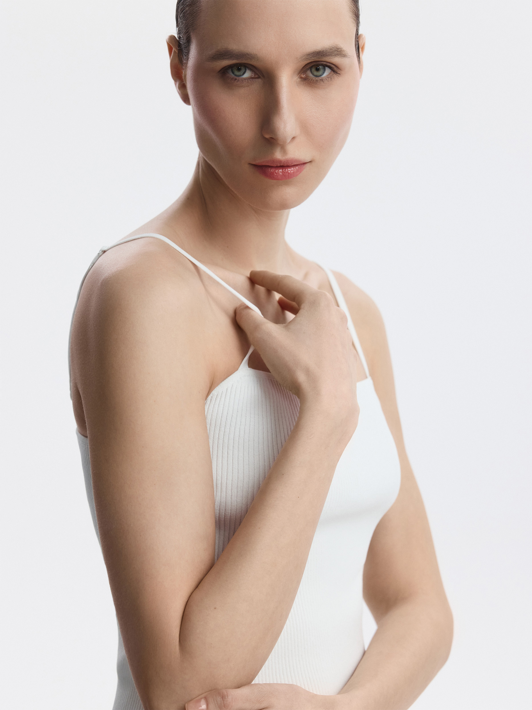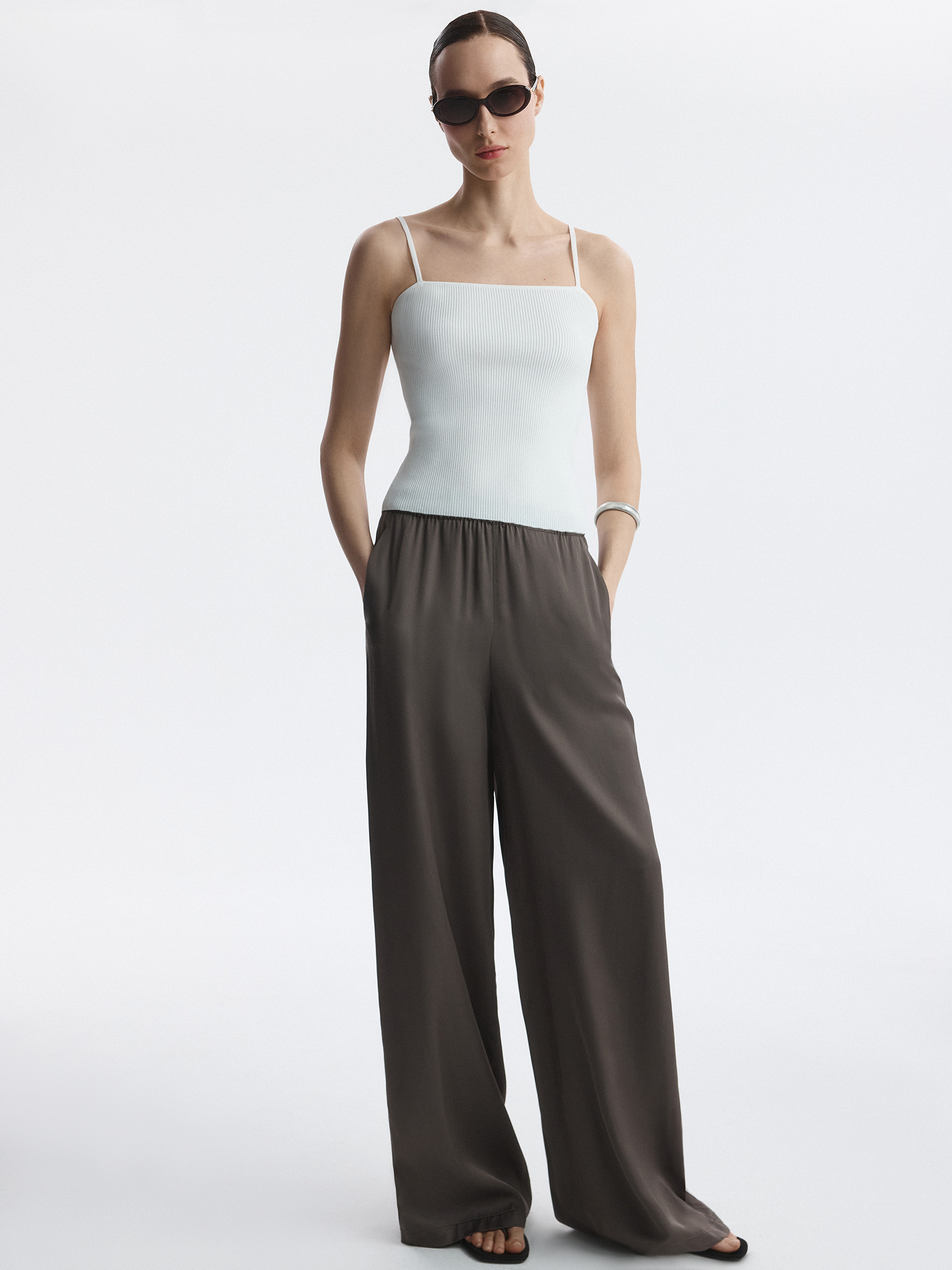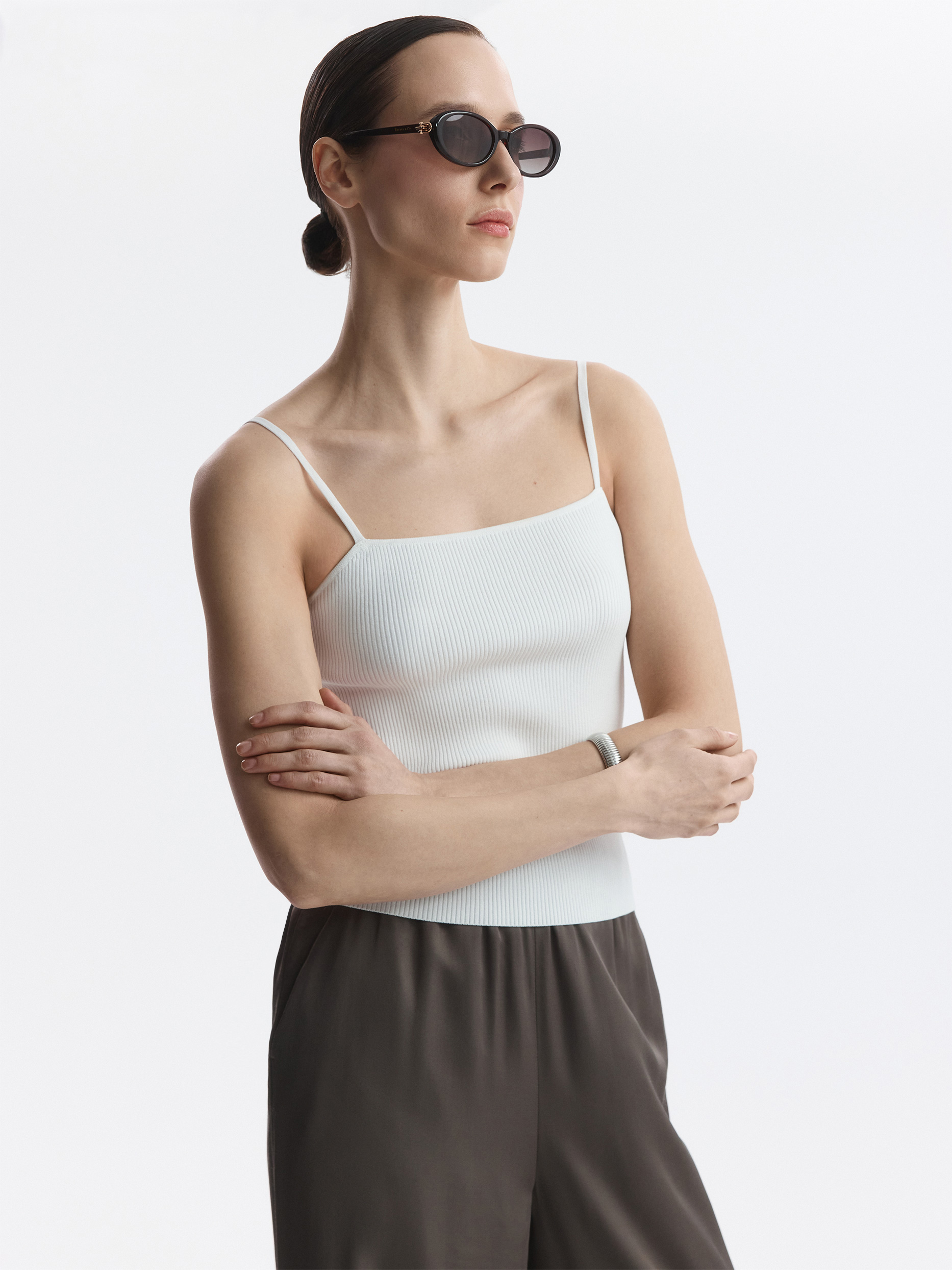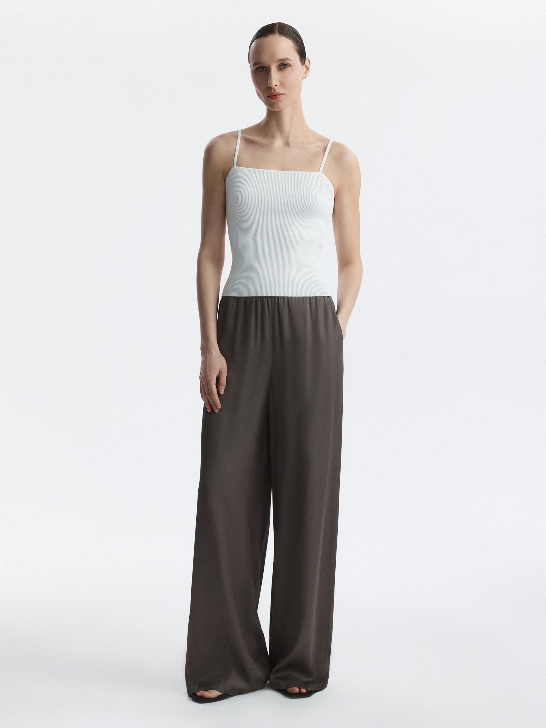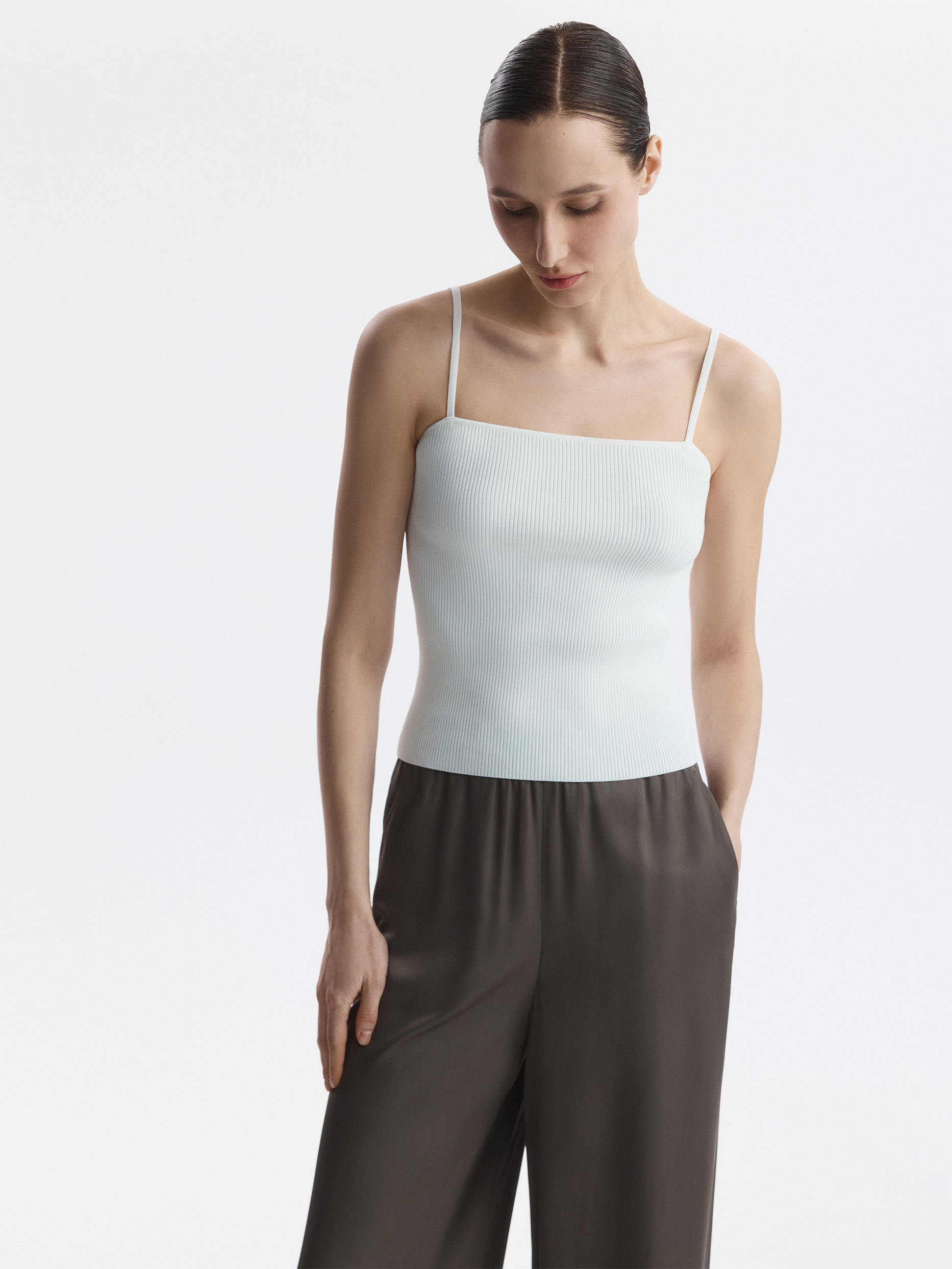 Топ на бретелях может быть разным, в зависимости от того, с чем его носить – сам по себе или под рубашку. Тонкий дышащий трикотаж из вискозы в рубчик мягко прилегает, а благодаря эластичным волокнам хорошо тянется. Длину бретелей можно регулировать для оптимальной посадки.