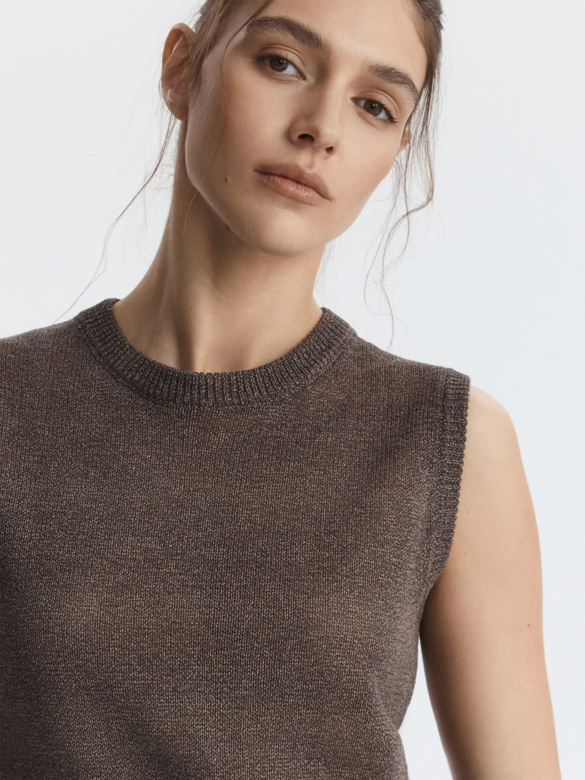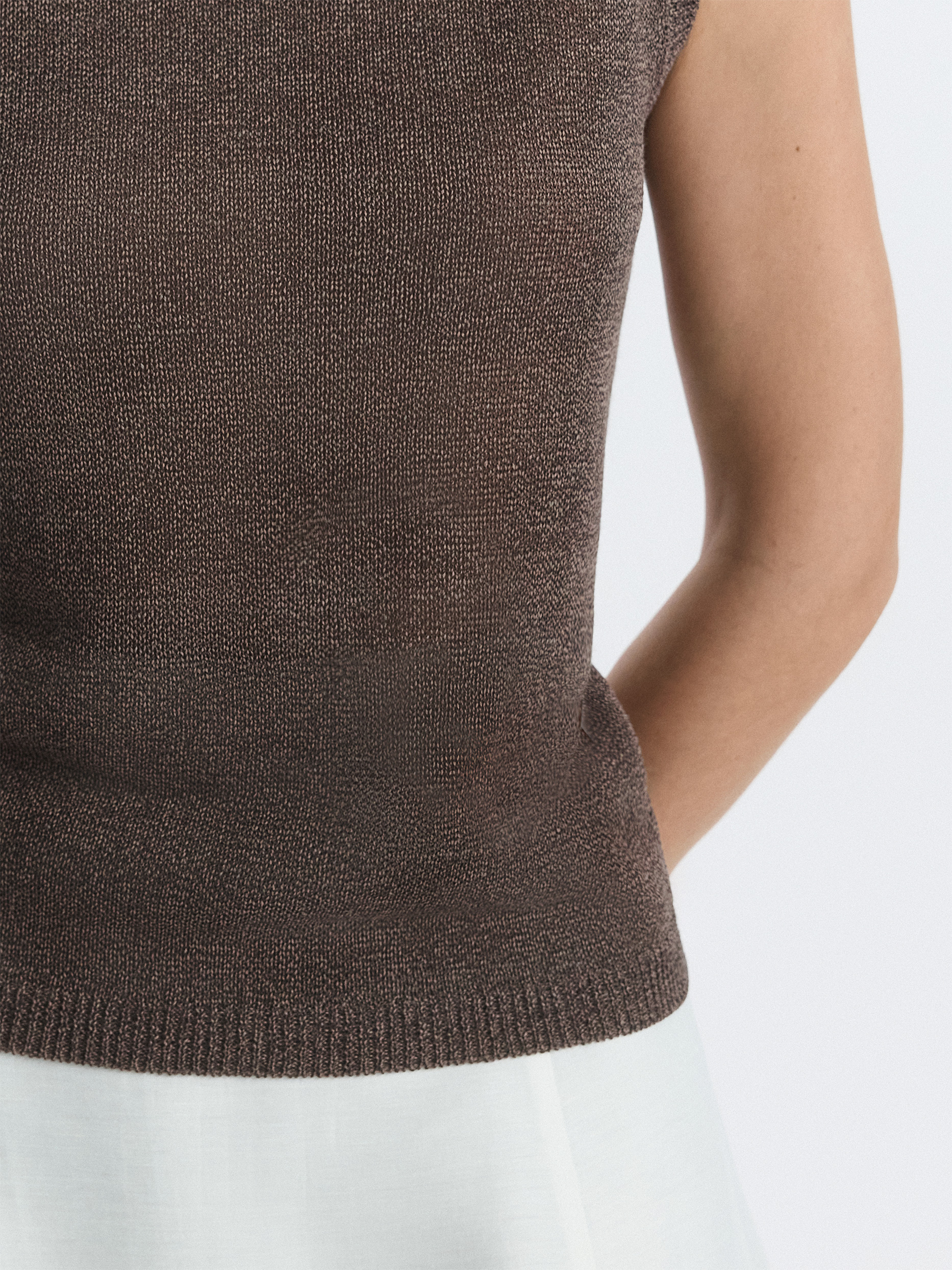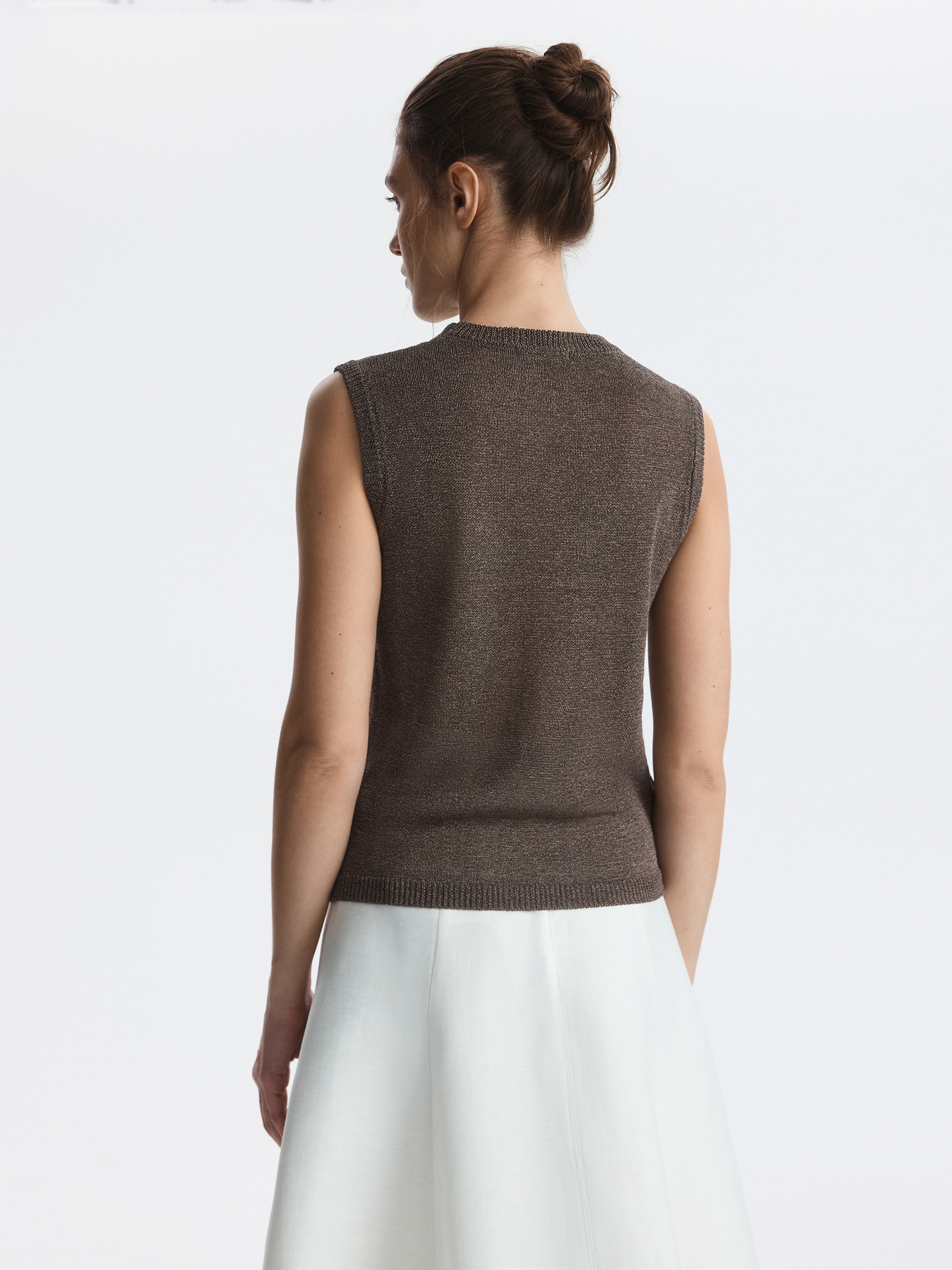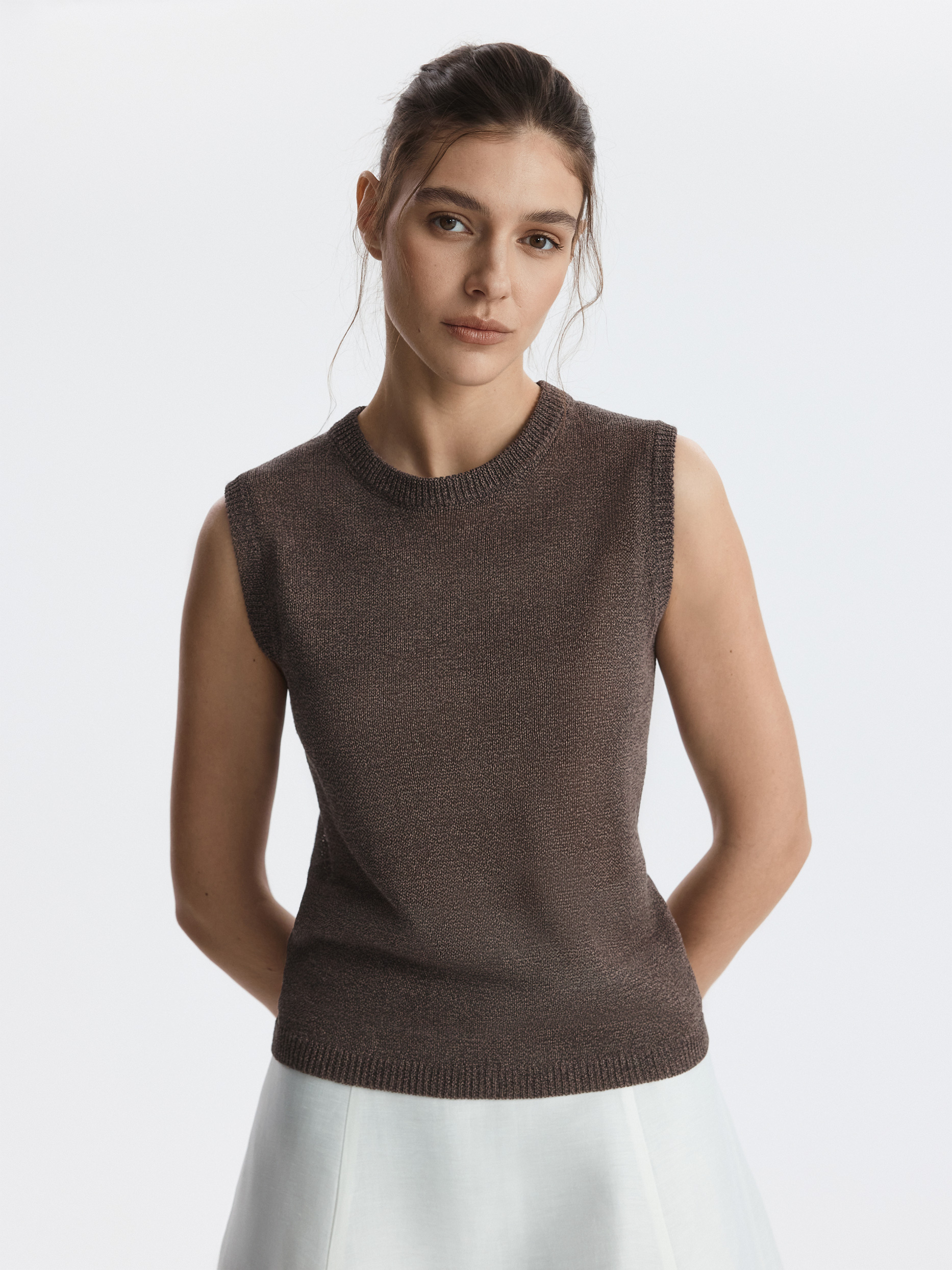 Вязаный топ удачно впишется в самые разные образы. Пряжа на основе хлопка мягко прилегает к телу, а волокна целлюлозы придают прочности и формоустойчивости. Топ прямого кроя комфортно сидит по фигуре.