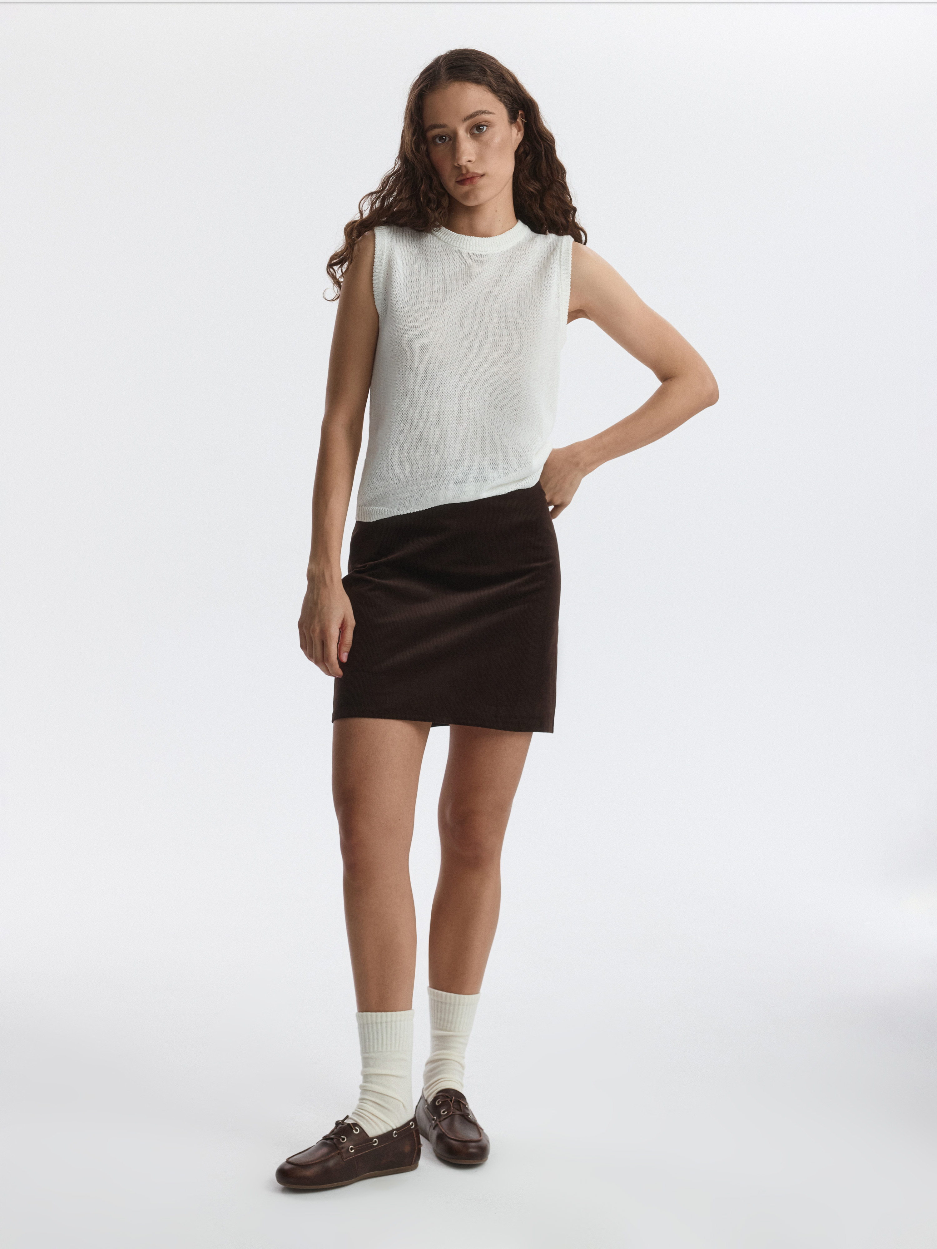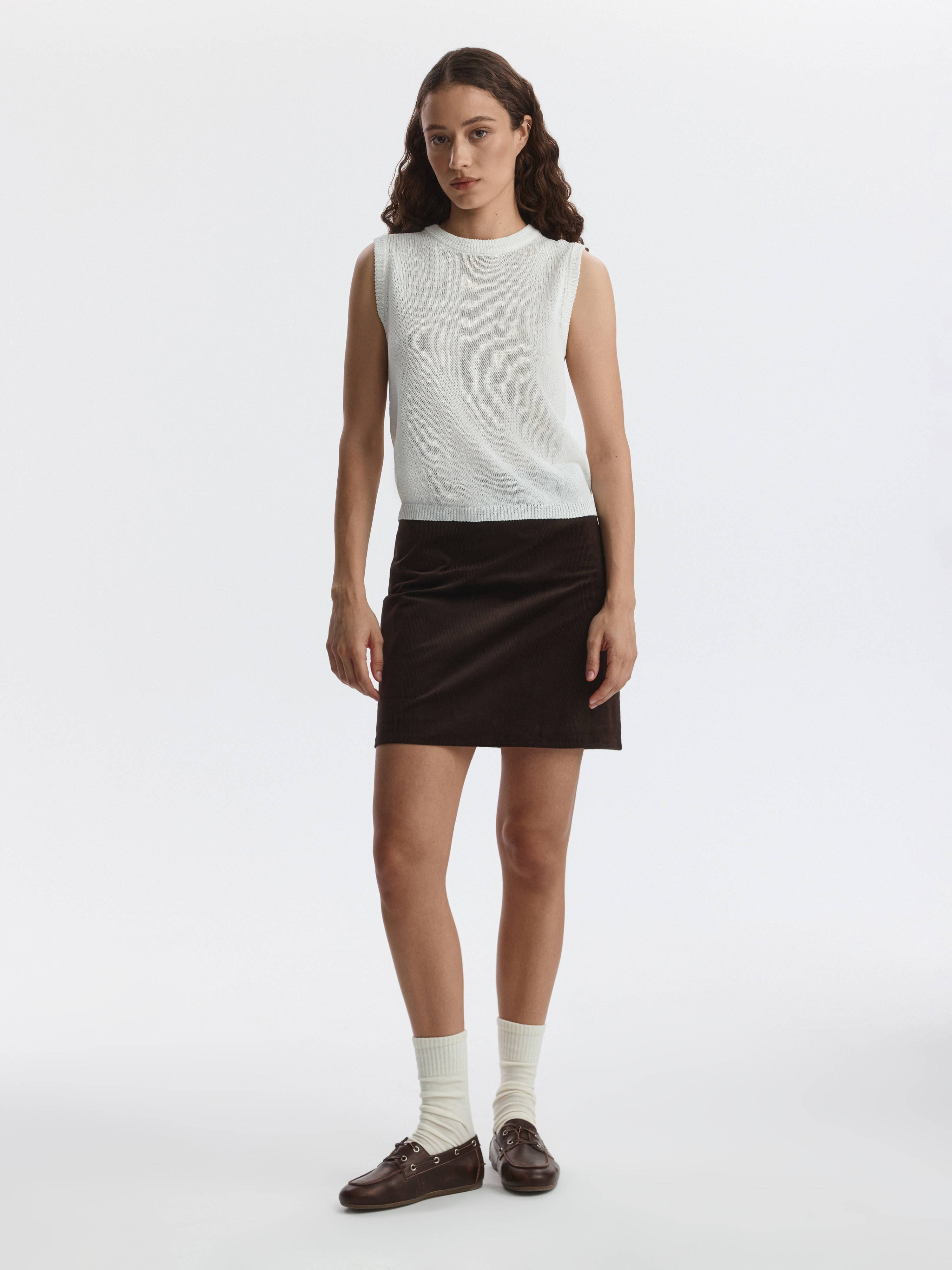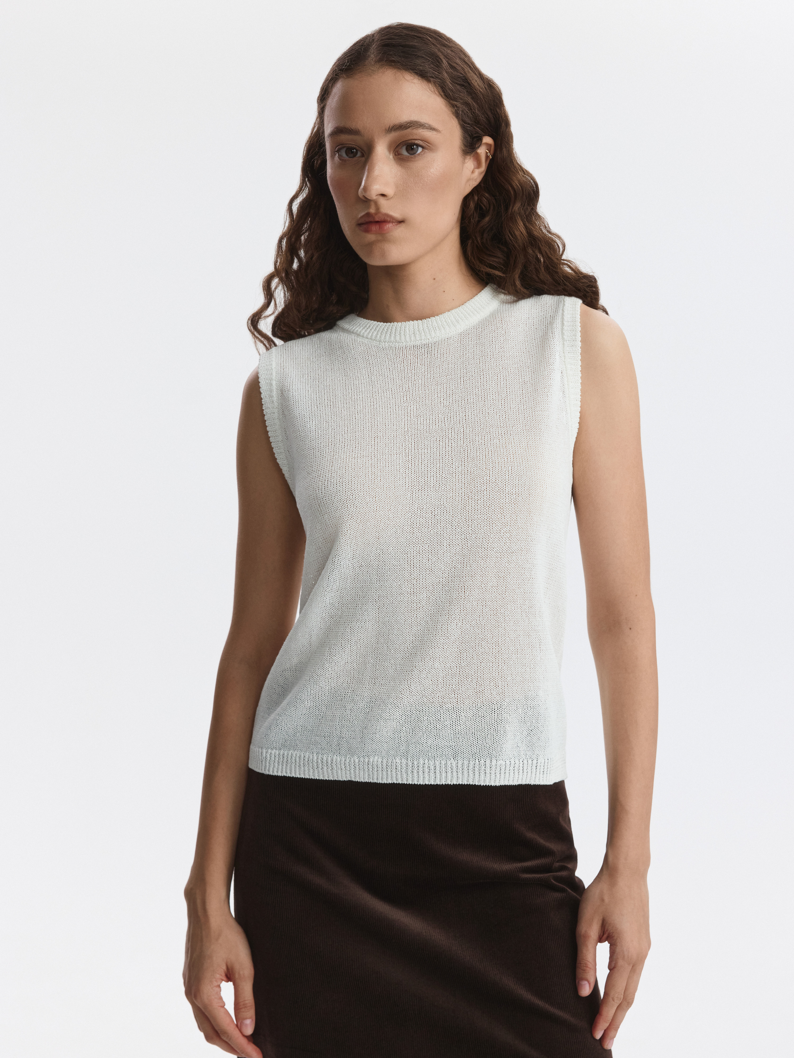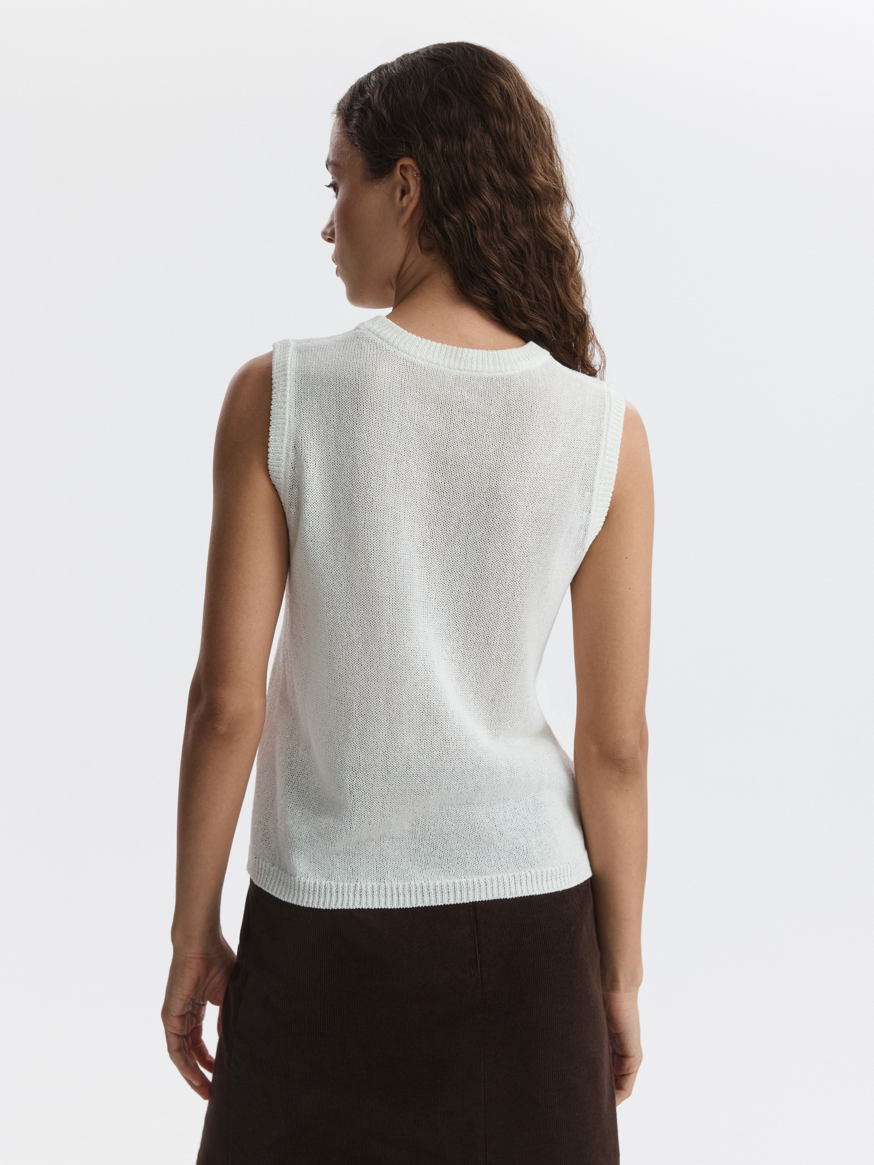 Вязаный топ удачно впишется в самые разные образы. Пряжа на основе хлопка мягко прилегает к телу, а волокна целлюлозы придают прочности и формоустойчивости. Топ прямого кроя комфортно сидит по фигуре.