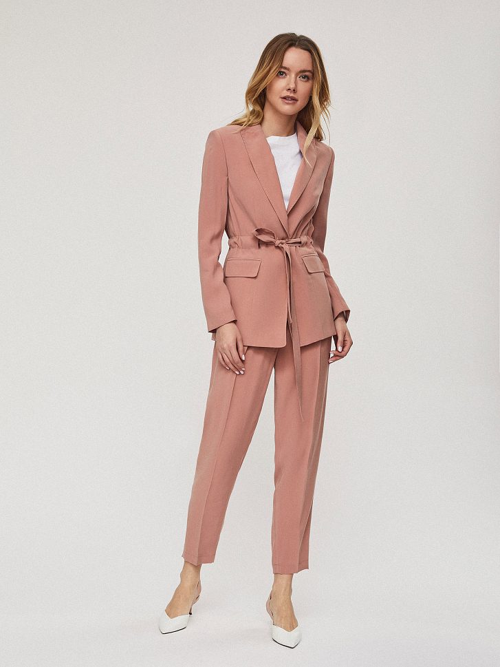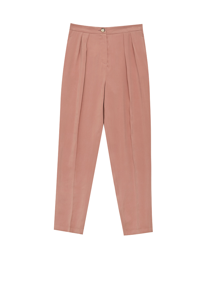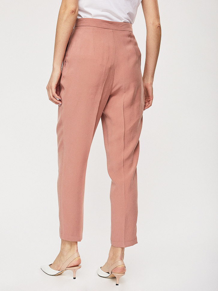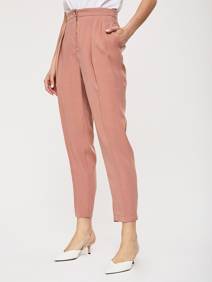 Брюки зауженного кроя с высокой посадкой, защипами и боковыми карманами.