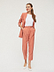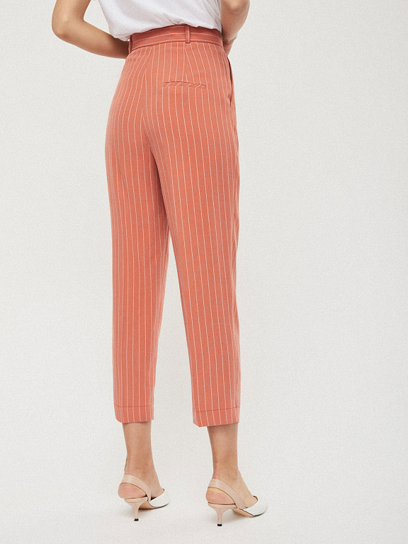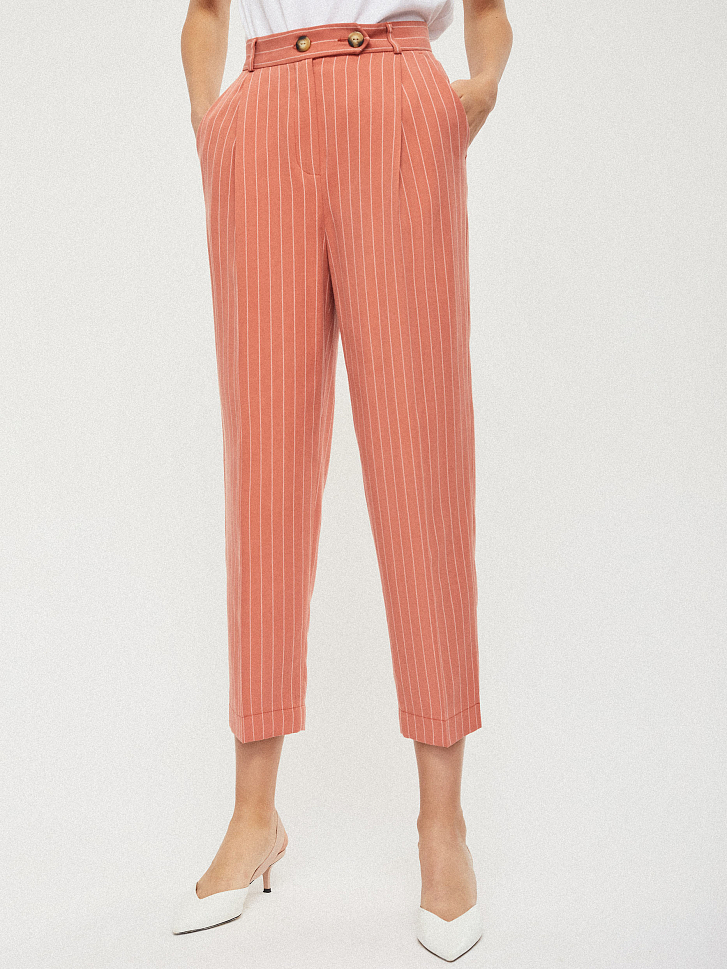 Укороченные брюки зауженного кроя с высокой посадкой. Защипы на талии, отвороты по низу брюк, боковые отрезные карманы. На поясе декоративная планка.