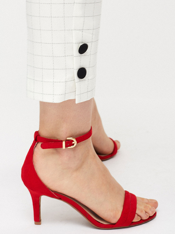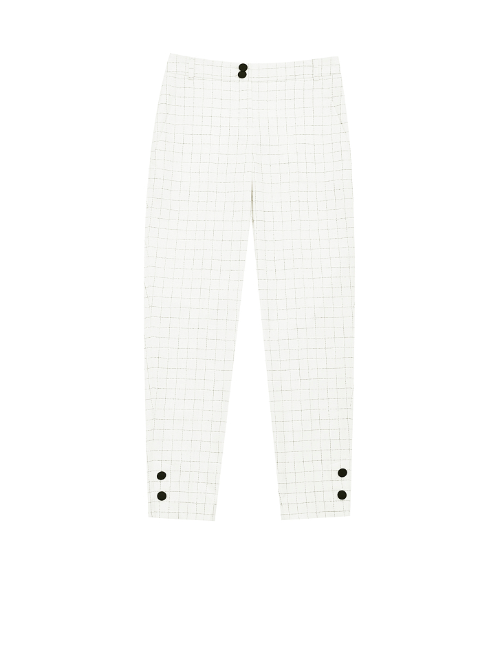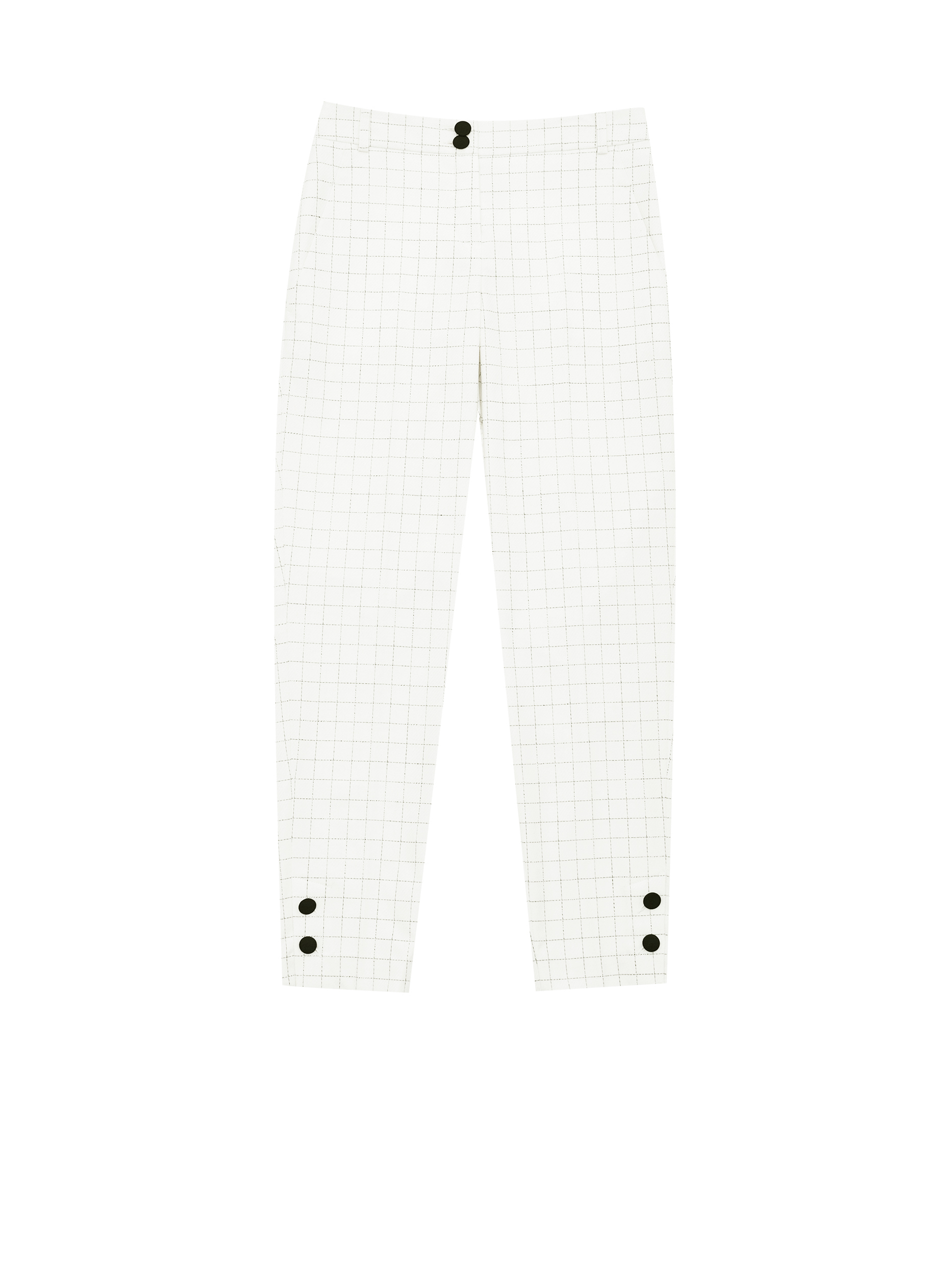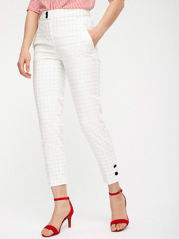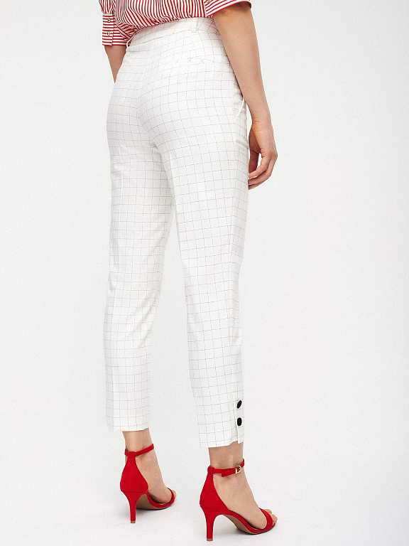 Укороченные брюки зауженного кроя со средней посадкой. Боковые прорезные карманы, разрезы с декоративными пуговицами по нижнему краю брючин.