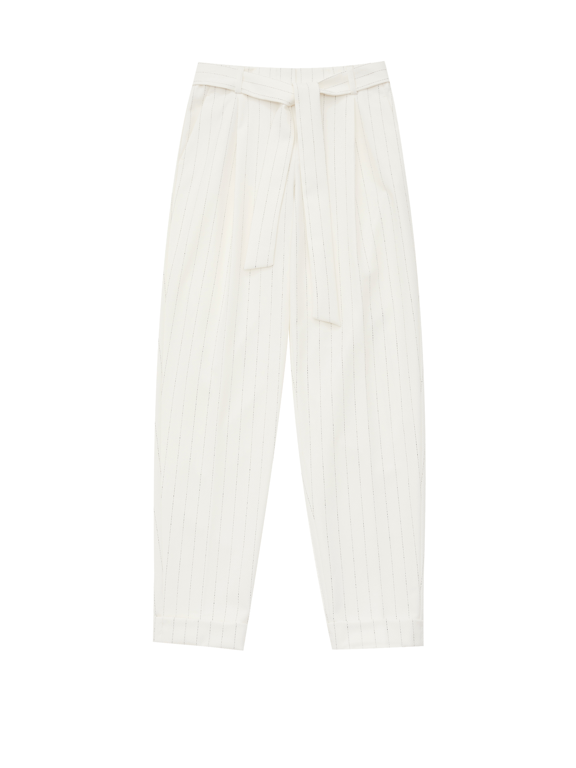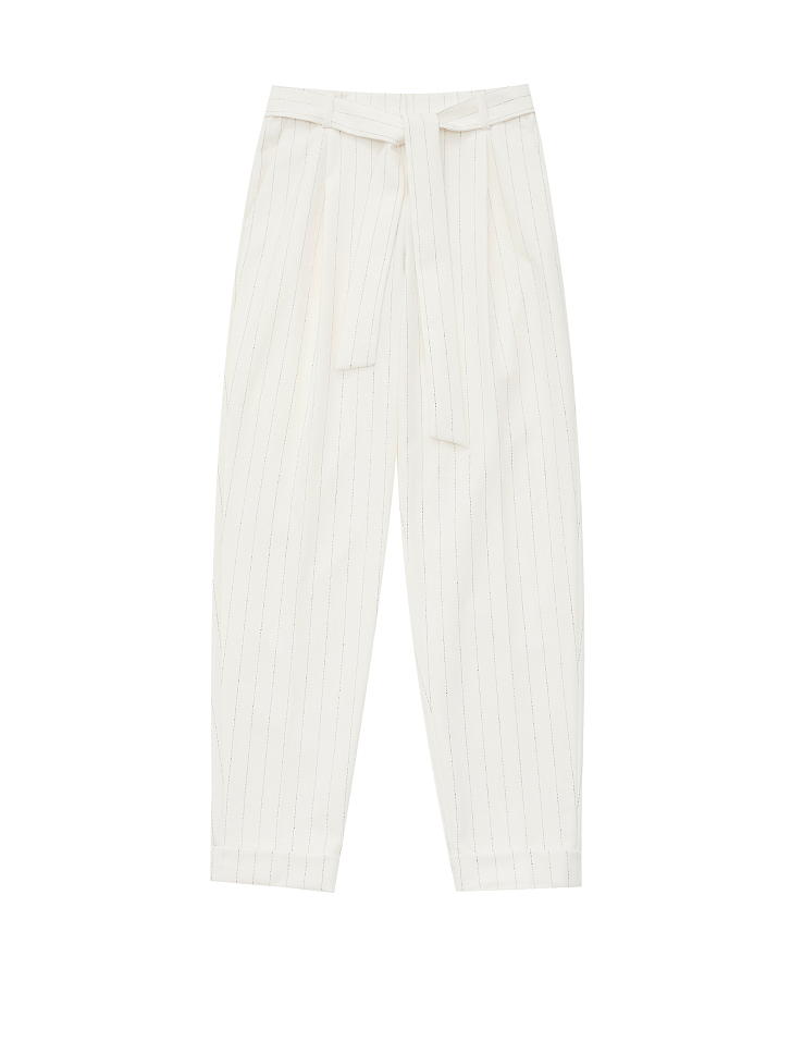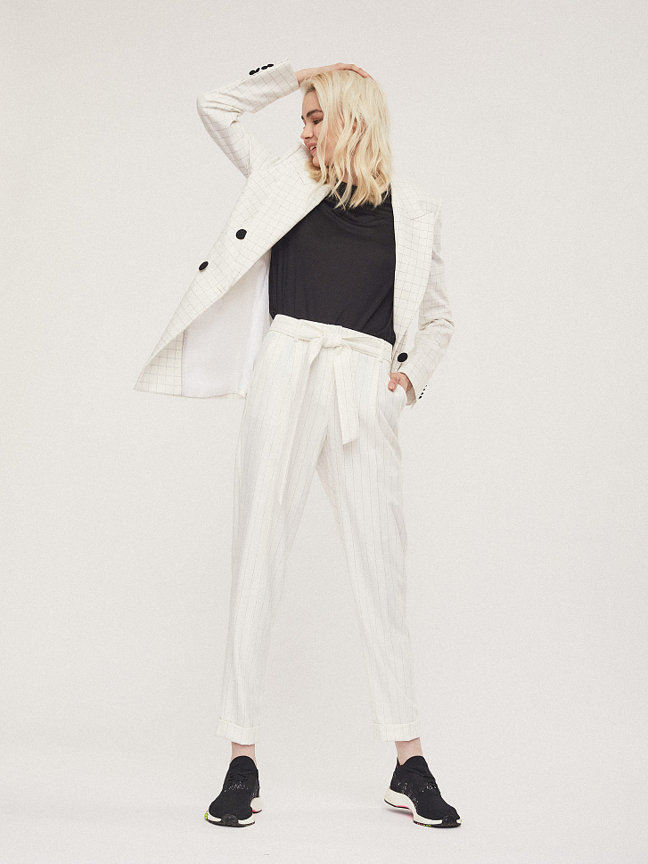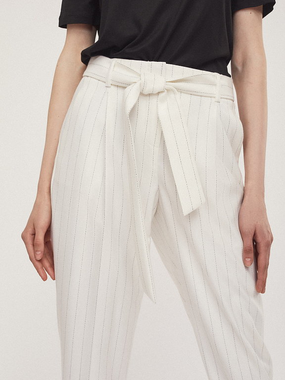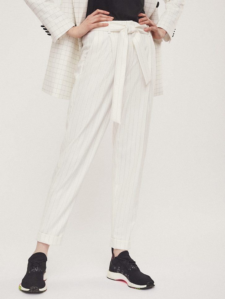 Брюки зауженного кроя с поясом в тон. На талии заложены складки. Боковые карманы.Низ брюк с отворотами.