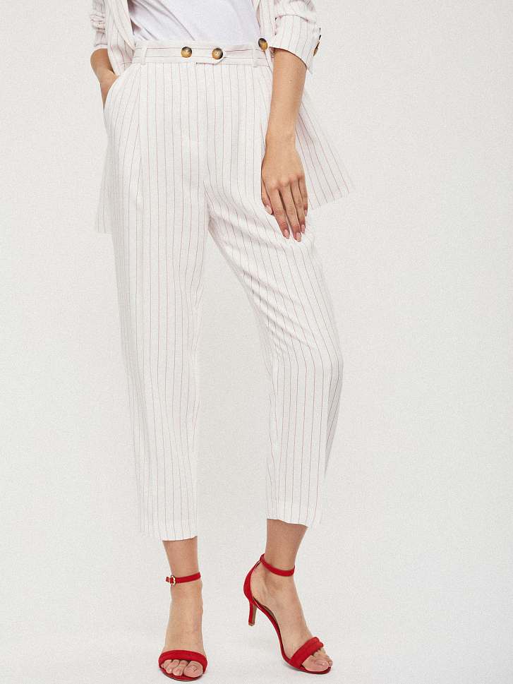 Укороченные брюки зауженного кроя с высокой посадкой. Защипы на талии, отвороты по низу брюк, боковые отрезные карманы. На поясе декоративная планка.
