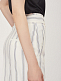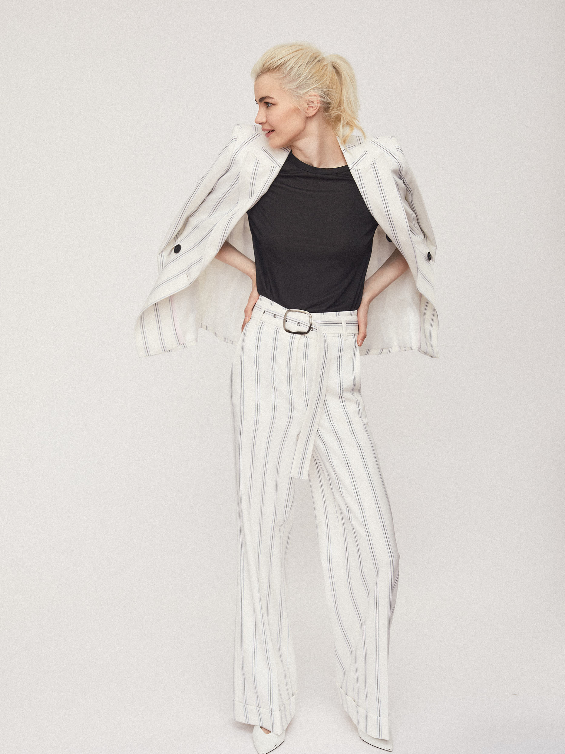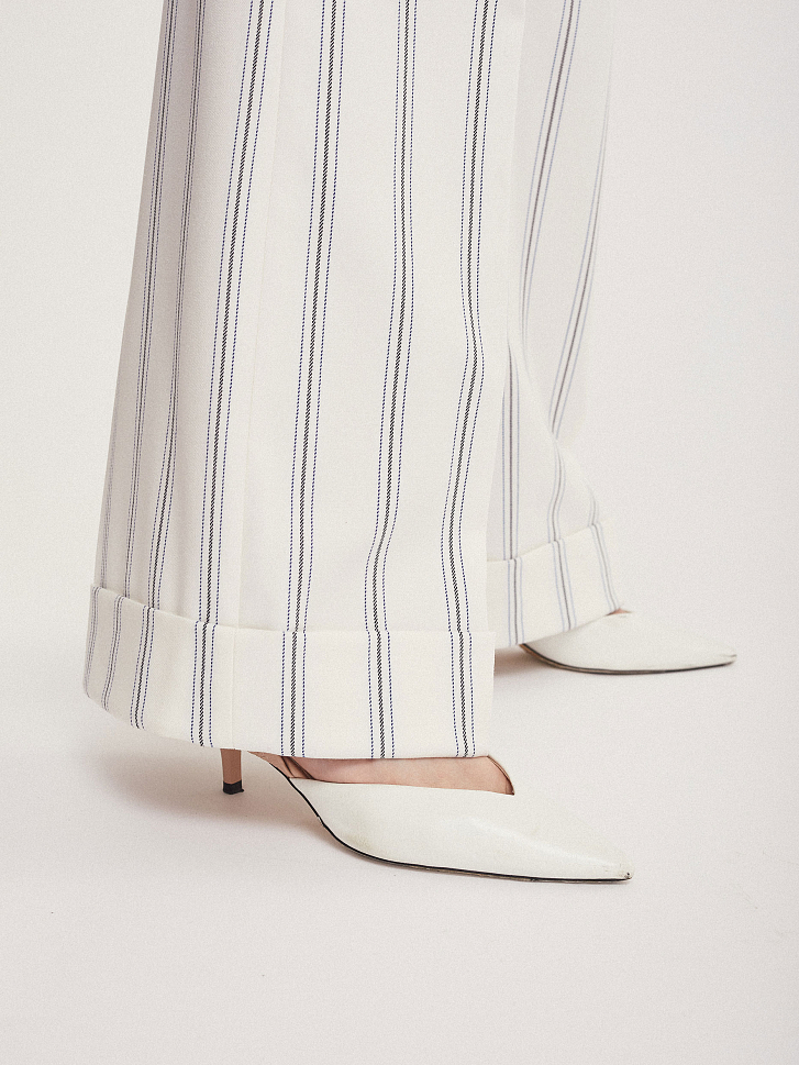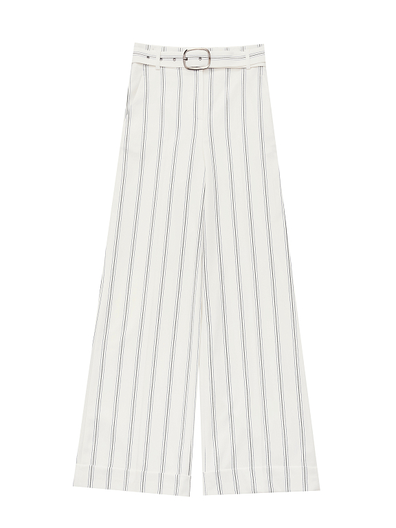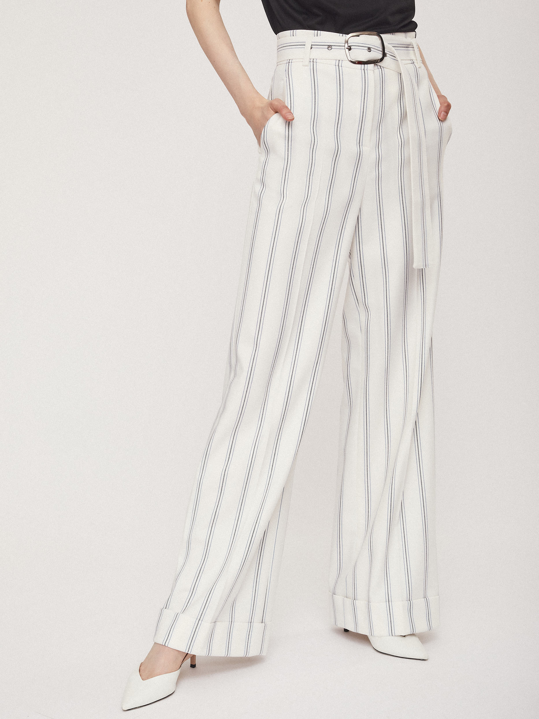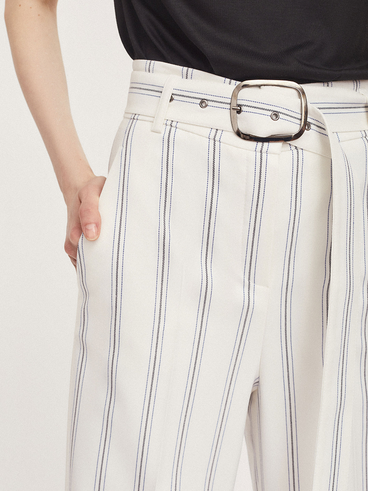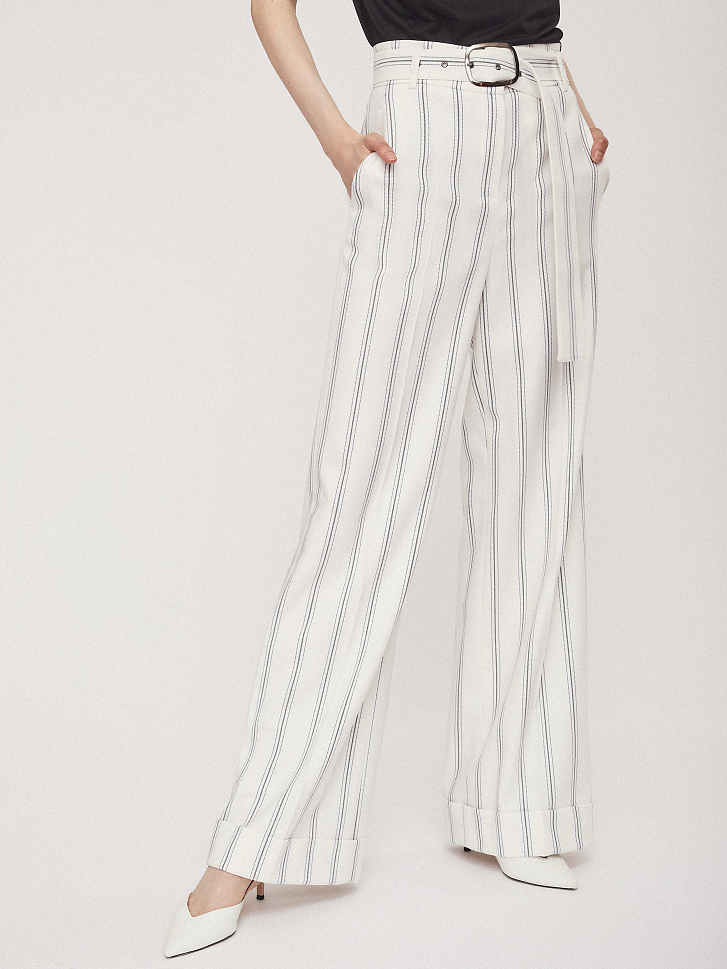 Брюки широкого кроя высокой посадки с поясом с металлической пряжкой. На талии заложены складки. Боковые карманы.