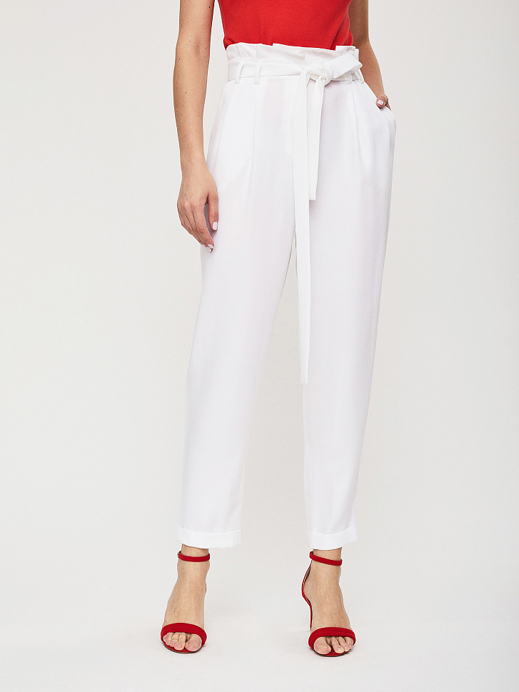 Укороченные брюки прямого кроя с поясом в тон. Средняя посадка, прорезные карманы по бокам, декоративный карман сзади, втачной пояс с заложенными складками.