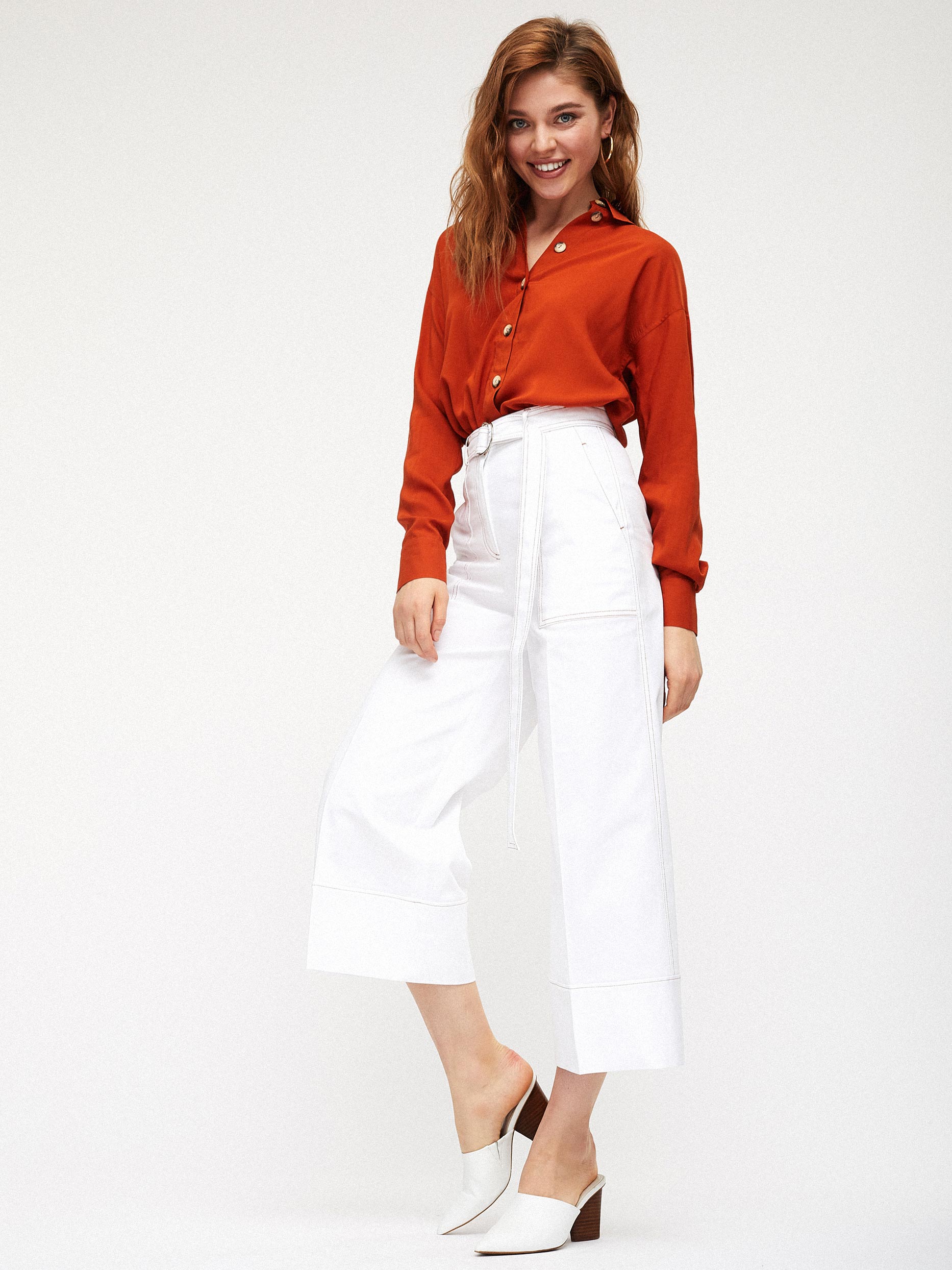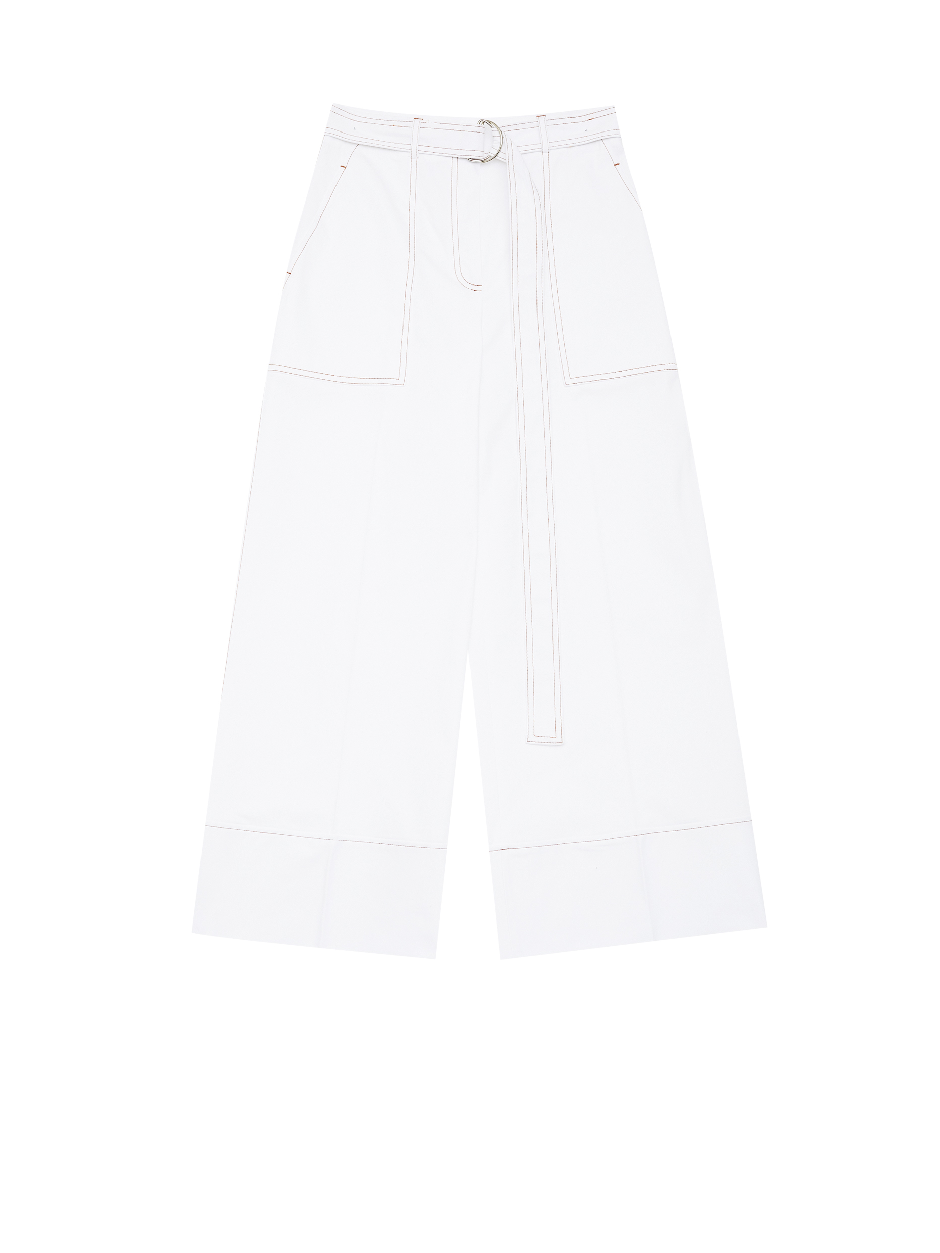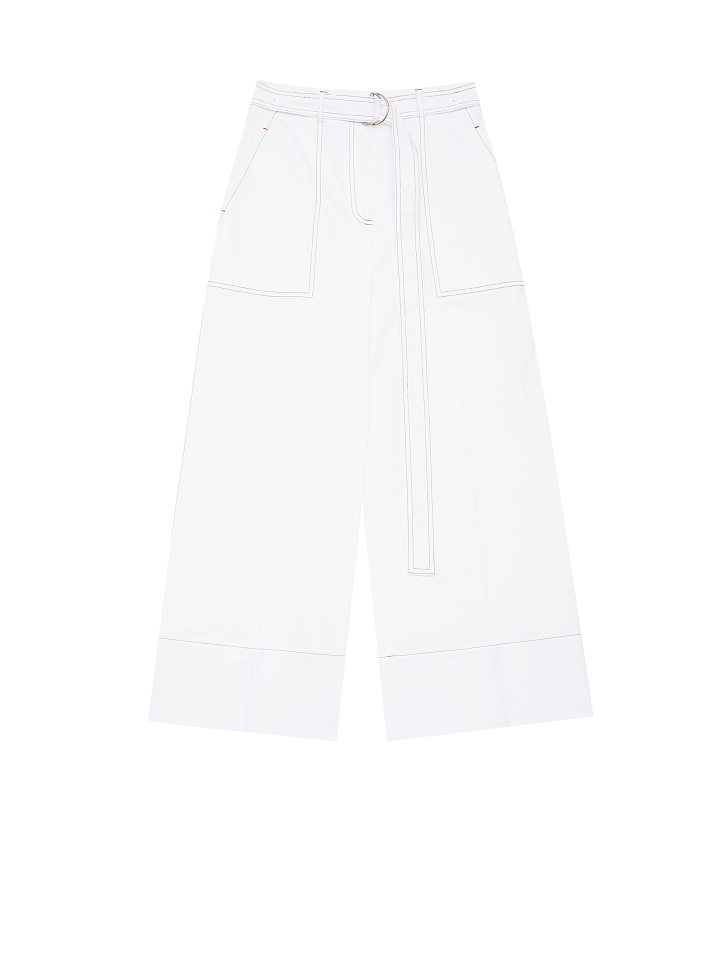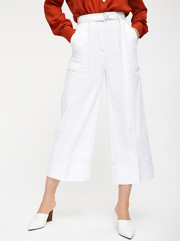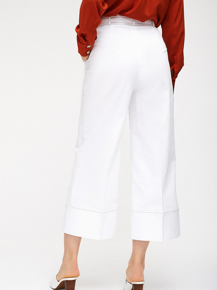 Брюки-кюлоты, выполненные из смесового хлопка. Высокая посадка, пояс в тон, накладные карманы по бокам, контрастная отстрочка.