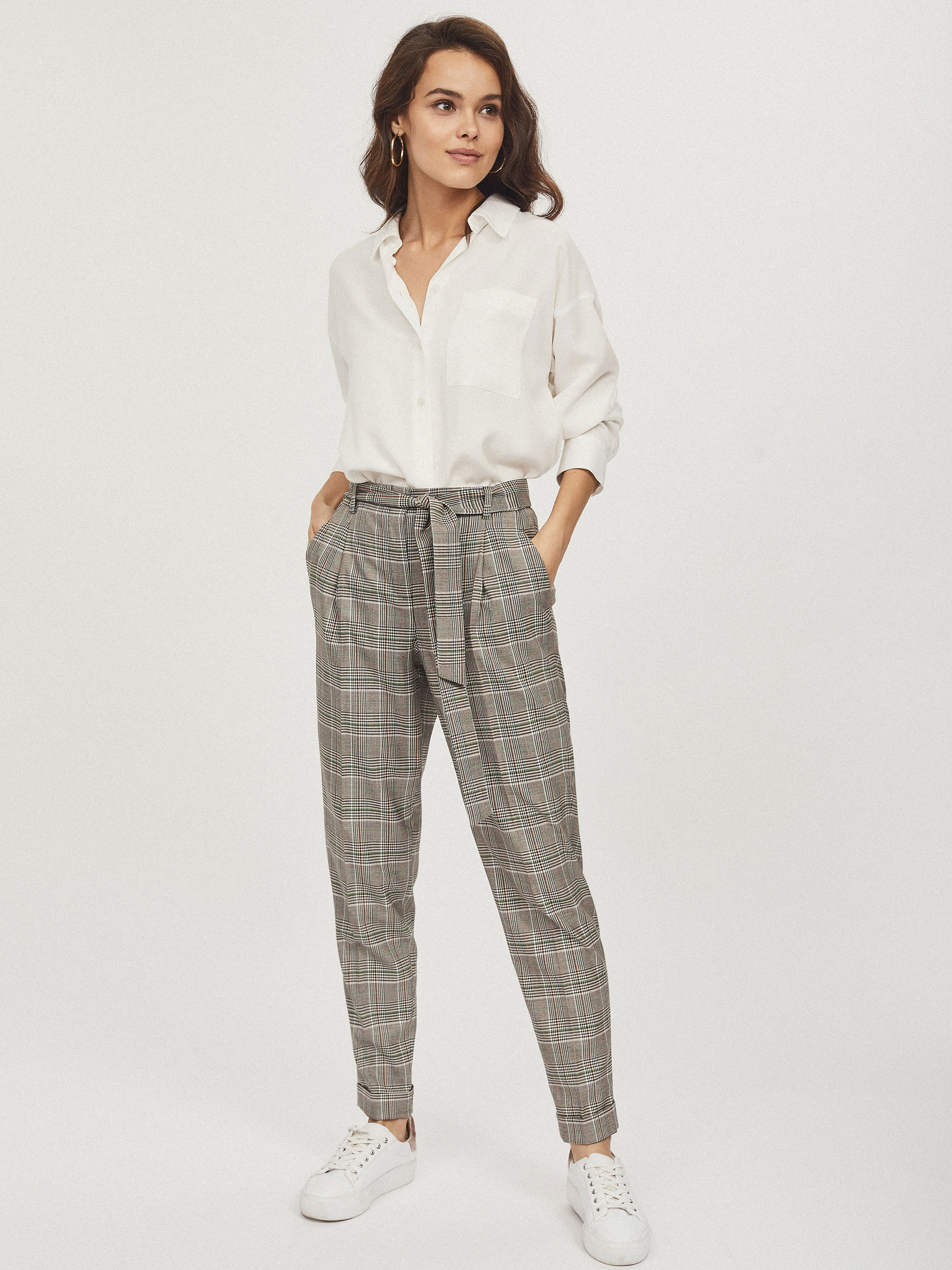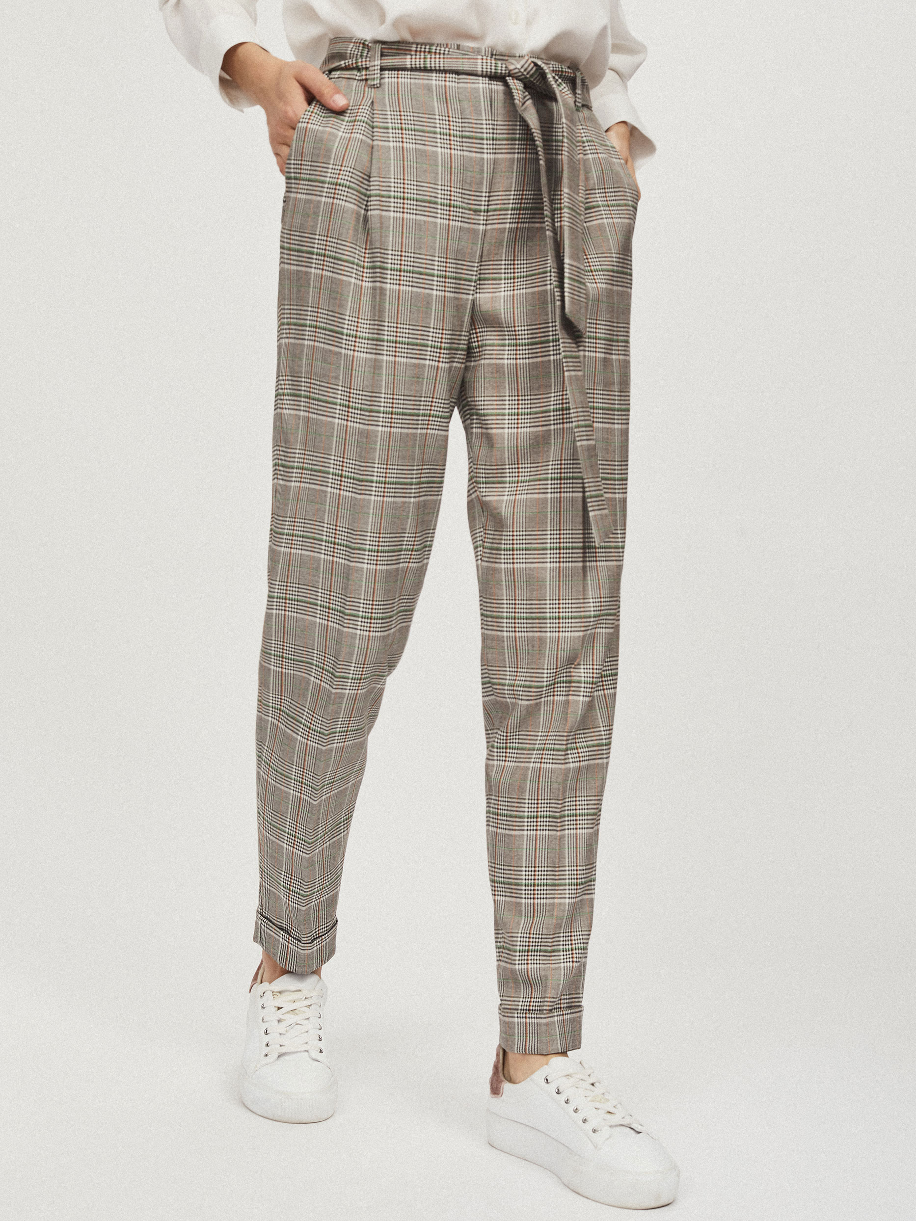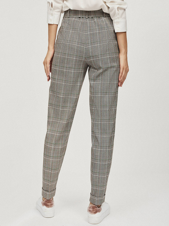 Брюки зауженного кроя с поясом в тон. Высокая посадка, прорезные карманы по бокам, стрелки, отвороты по нижнему краю.