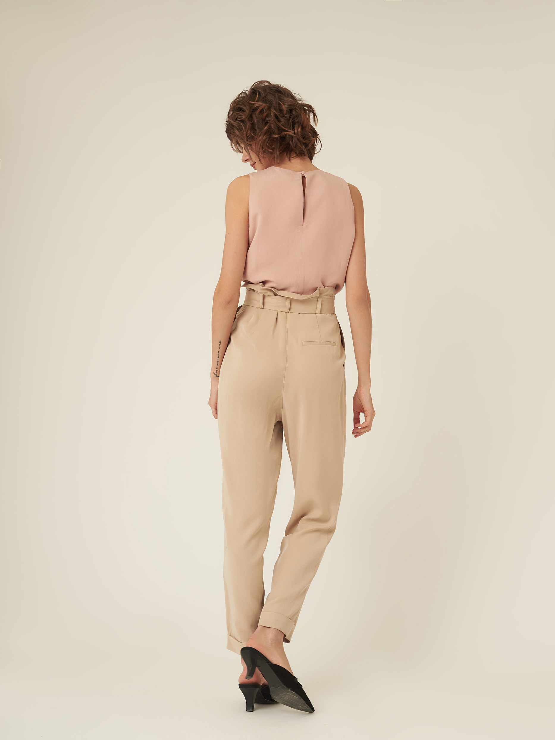 Брюки зауженного кроя. Высокая посадка, пояс-хомут в тон, защипы, отвороты по нижнему краю.