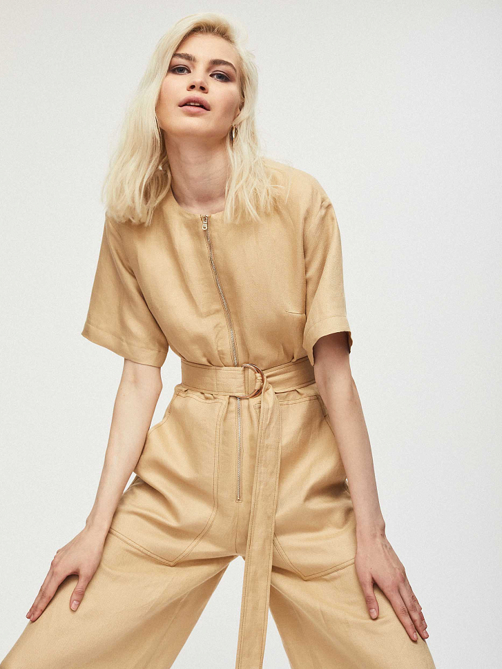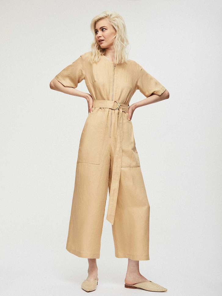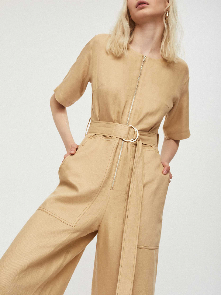 Укороченный комбинезон прямого кроя, выполненный из смесового льна, с поясом из этой же ткани. Округлый вырез, крупные накладные карманы, короткие свободные рукава. Застегивается на молнию.