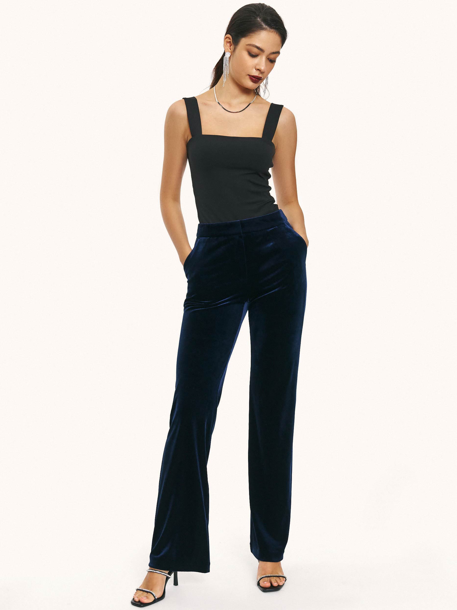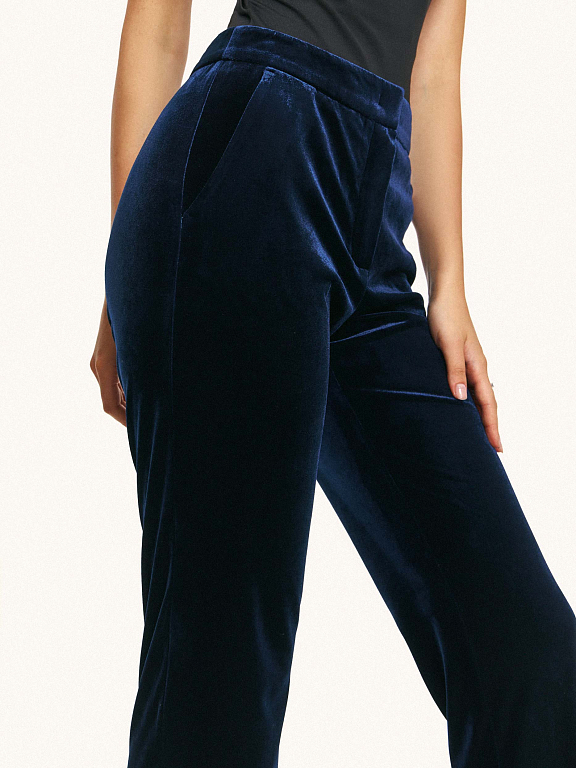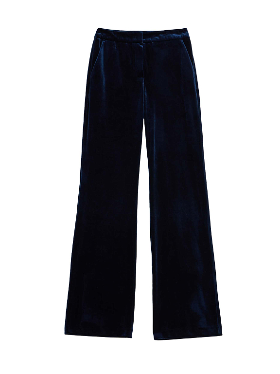 Однотонные брюки, выполненные из бархата, составят пару жакету из такой ткани, или станут главным акцентом образа. Плотный текстиль мягко прилегает и не сковывает шаг.