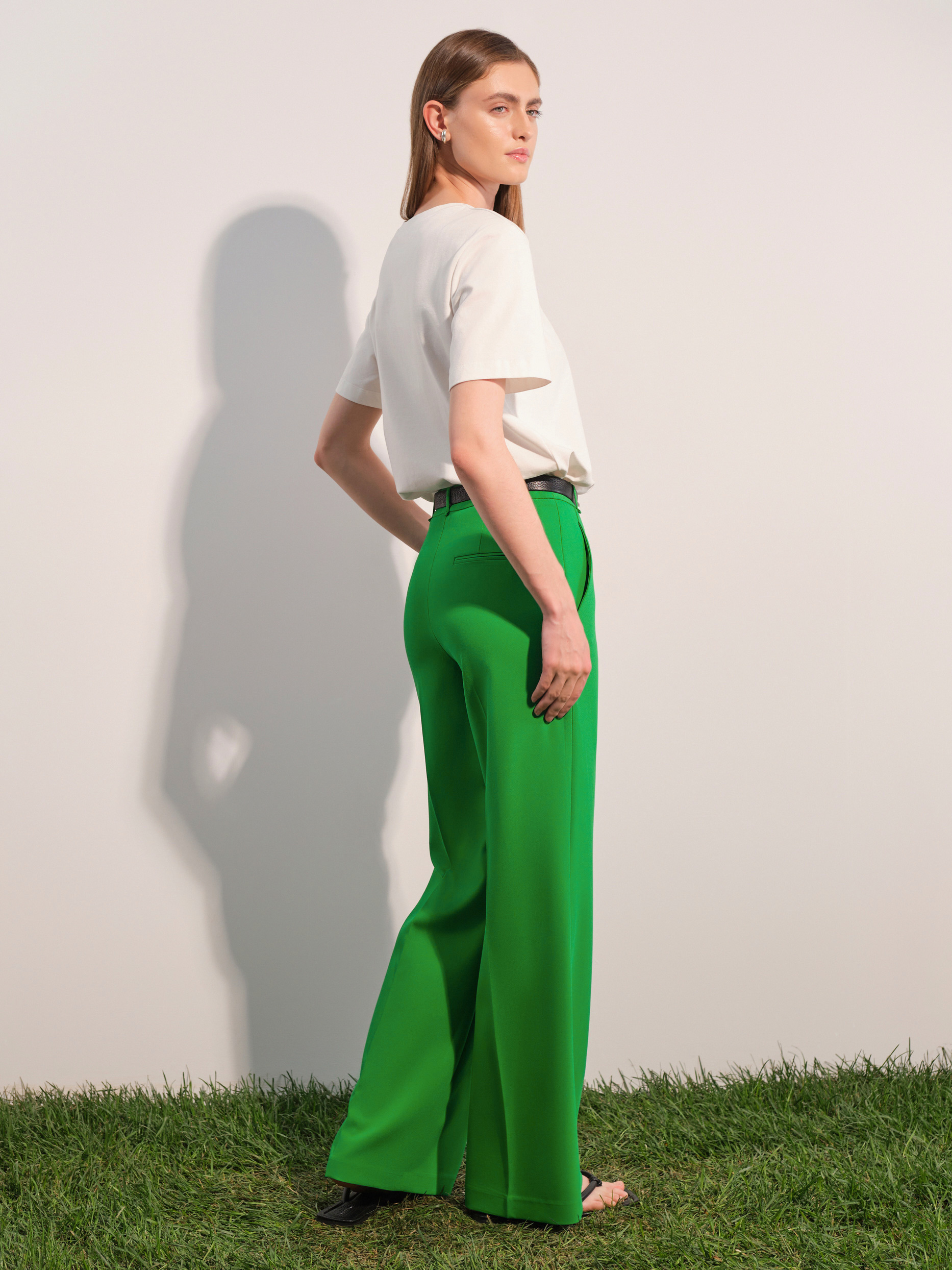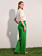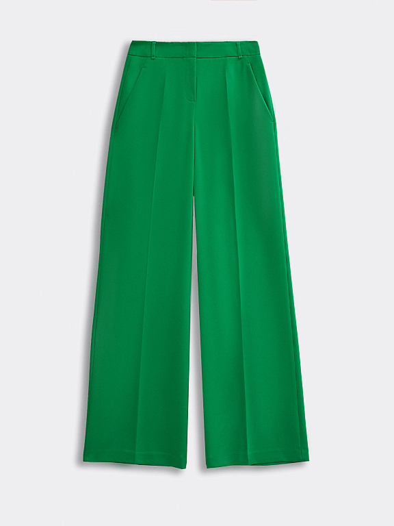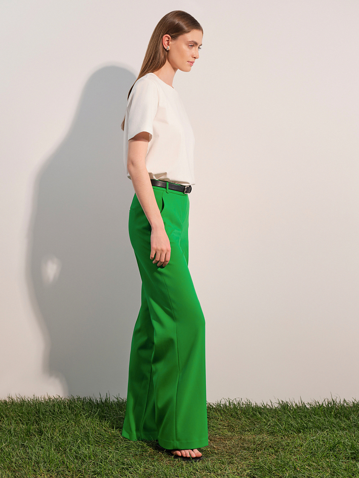 Широкие прямые брюки хорошо смотрятся на любой фигуре и легко подстраиваются под любой стиль. Такая модель с одинаковым успехом станет частью делового, неформального или даже вечернего образа — достаточно подобрать нужные по настроению верх и аксессуары. Изделие с классической посадкой и стрелками выполнено из в меру плотного костюмного материала, который не мнется.