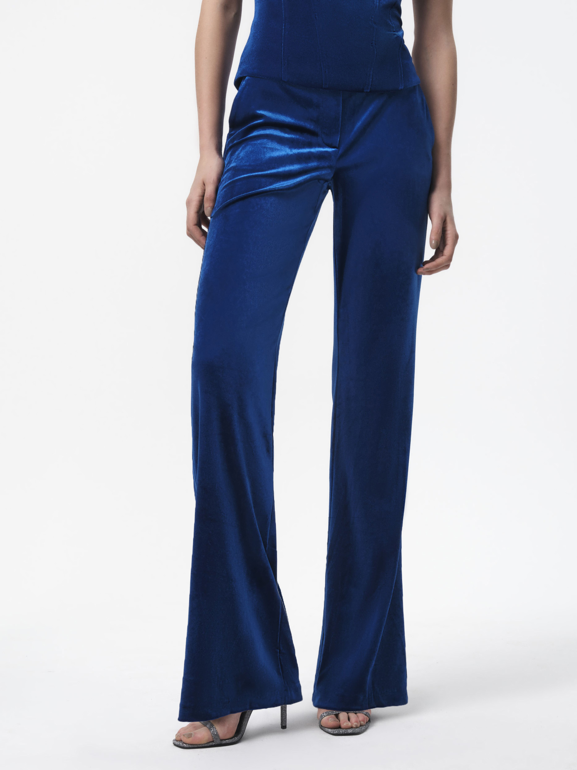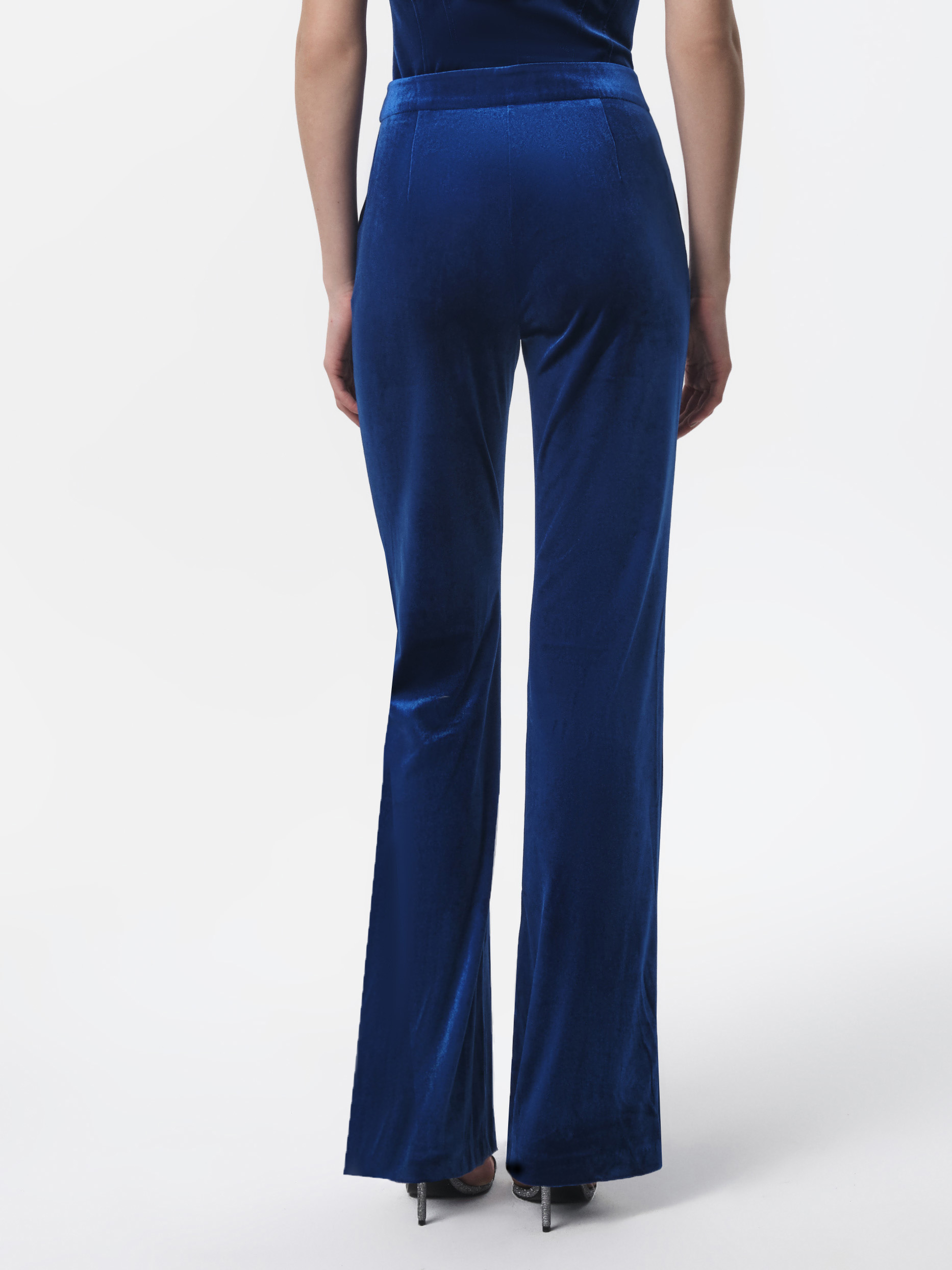 Однотонные брюки, выполненные из бархата, составят пару жакету из такой ткани, или станут главным акцентом образа. Плотный текстиль мягко прилегает и не сковывает шаг.
