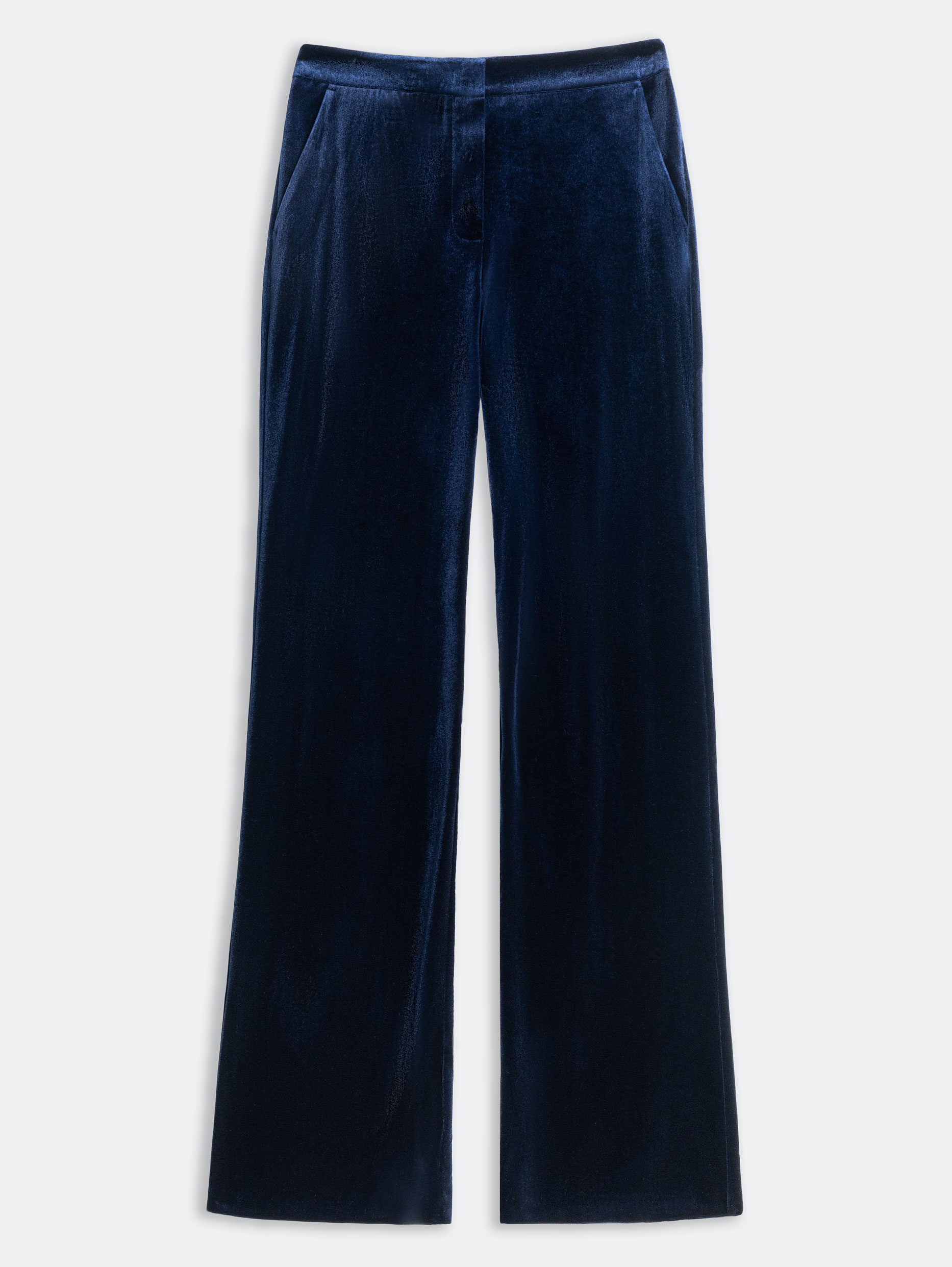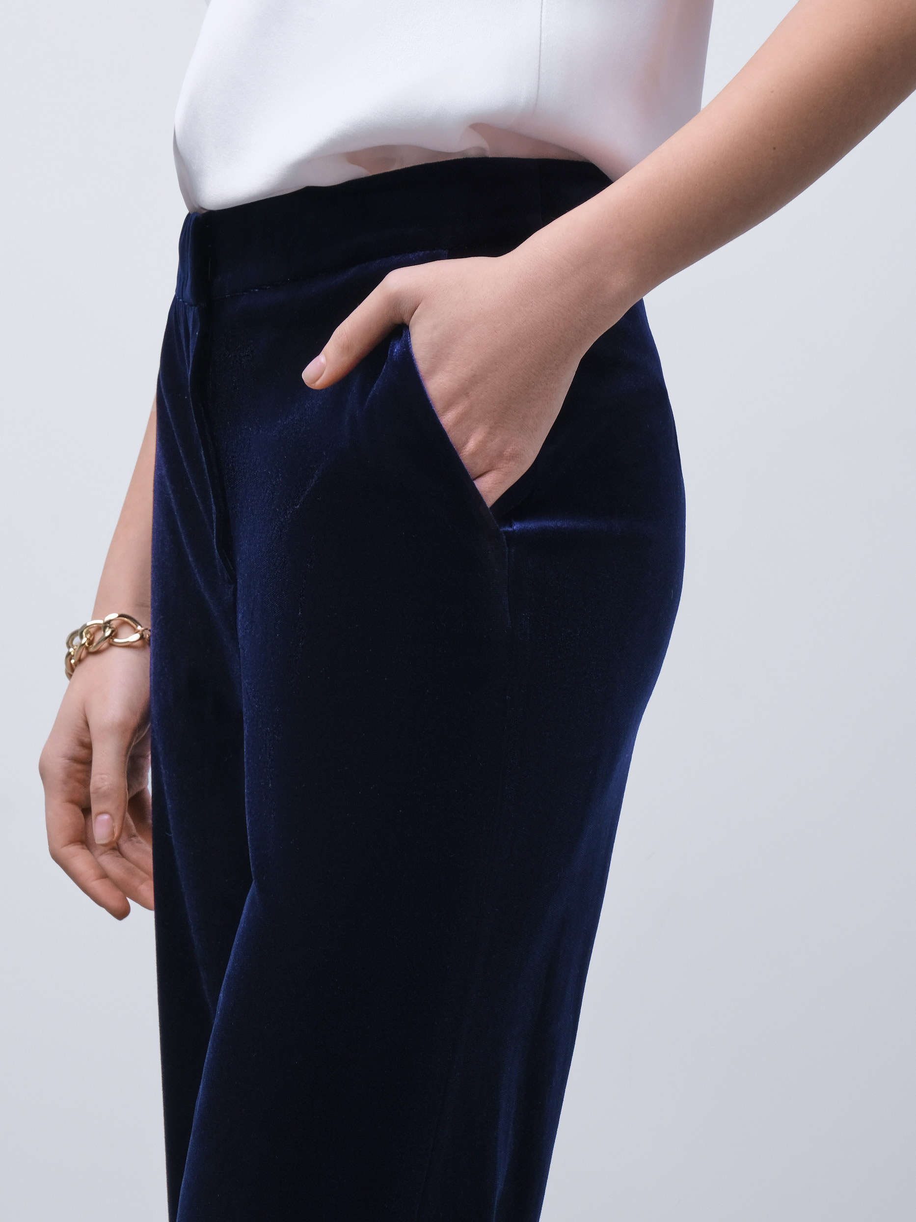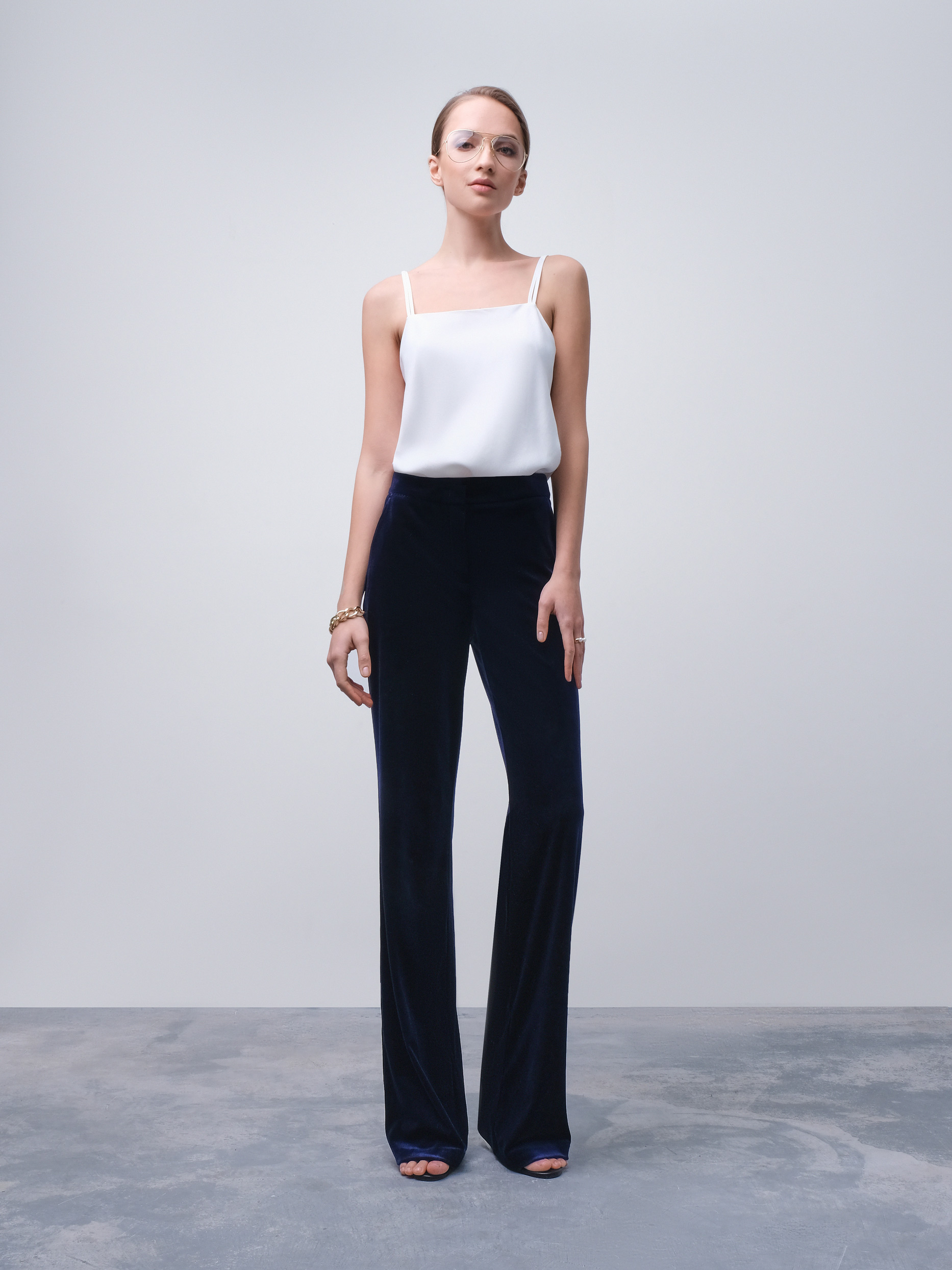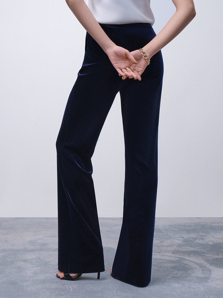 Однотонные брюки, выполненные из бархата, составят пару жакету из такой ткани, или станут главным акцентом образа. Плотный текстиль мягко прилегает и не сковывает шаг.