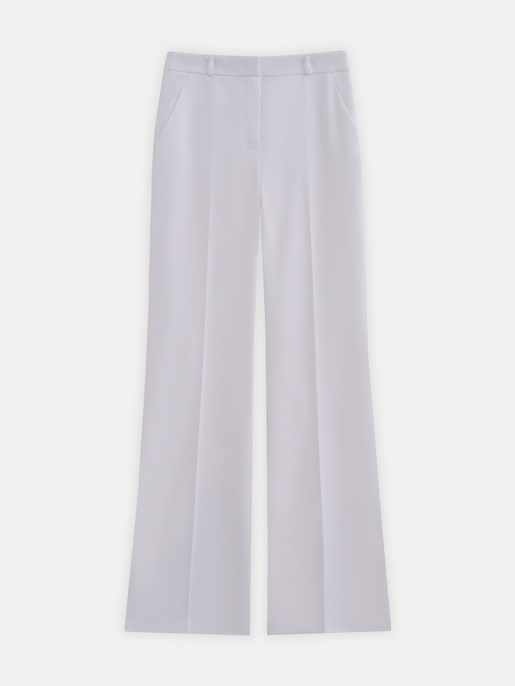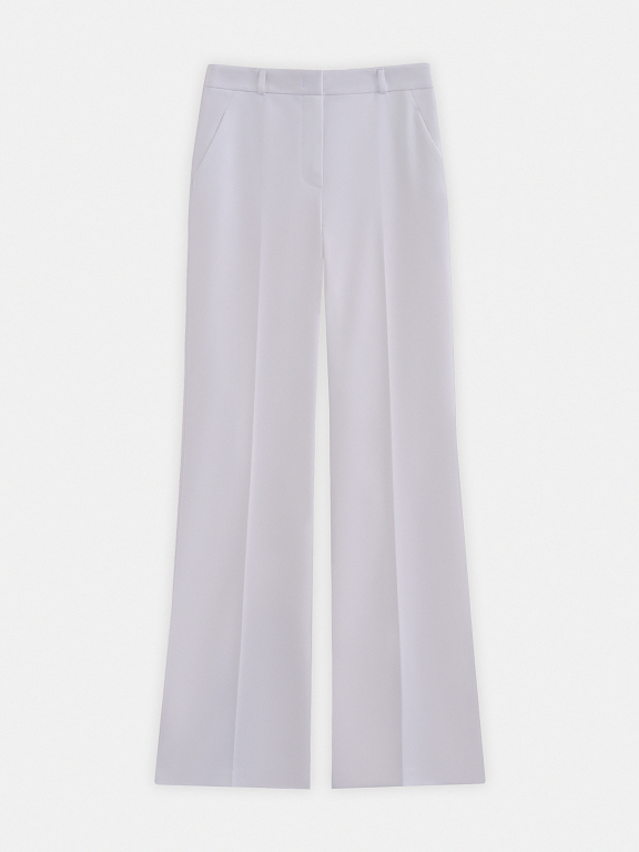 Расклешенные брюки с разрезами сзади - актуальный фасон уже несколько сезонов. Облегающие сверху и расклешенные книзу, брюки создают изящный силуэт и делают ноги визуально стройнее. Гладкая костюмная ткань подходит для строгого офисного дресс-кода.