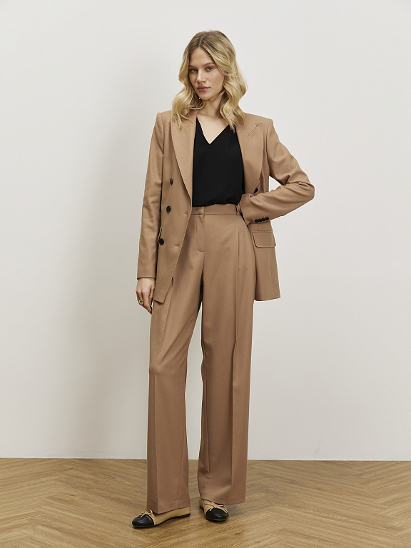 Широкие брюки со стрелками получились максимально женственными. Такими их делает выверенный приталенный крой, подчеркнутый глубоким складками спереди. За комфорт отвечает в меру плотный костюмный текстиль, который не мнется. Модель близка к классике, но легко подружится и с расслабленными вещами: такие брюки можно смело надеть, например, с кедами.
