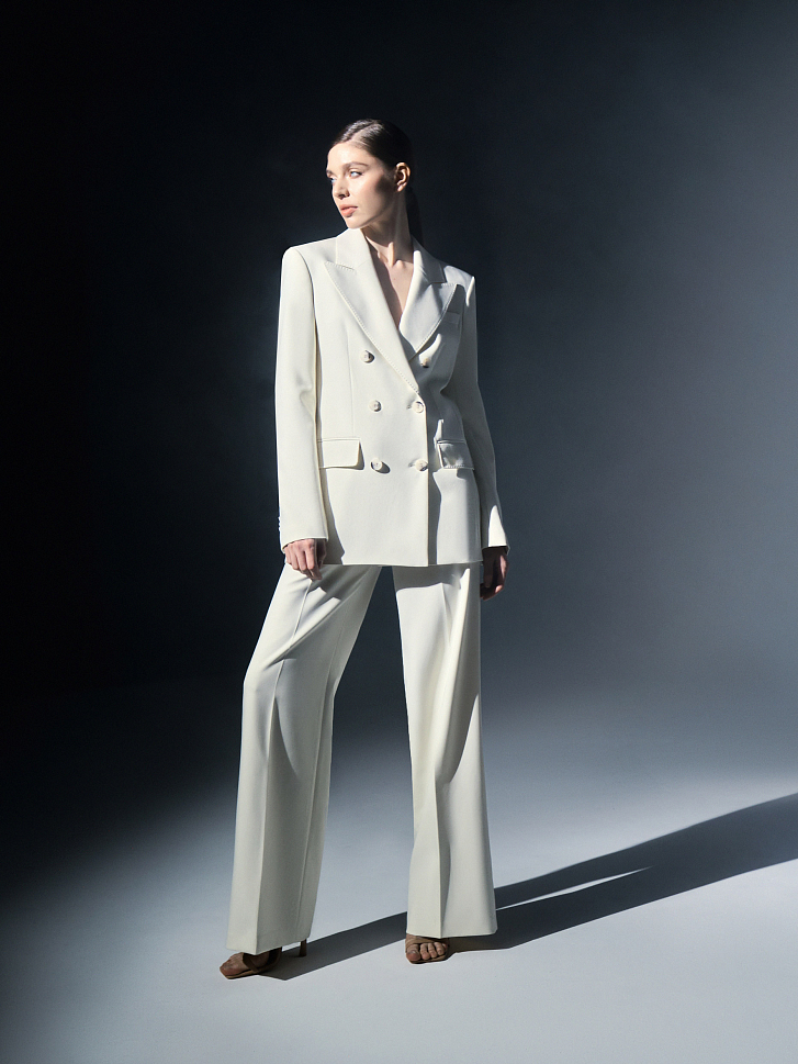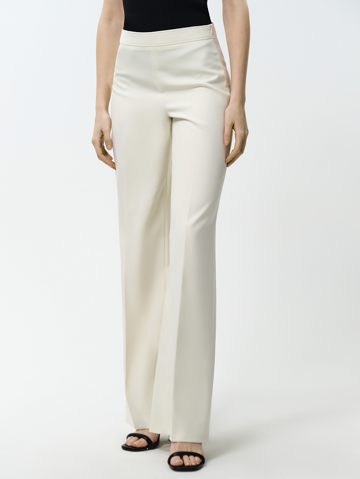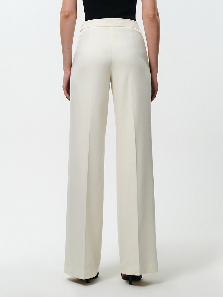Лаконичные брюки без карманов создают базу для повседневного гардероба. Брюки прямого кроя застегиваются на потайную молнию сбоку. Заутюженные стрелки визуально стройнят силуэт. Пояс без шлевок обеспечивает плотную посадку по фигуре.