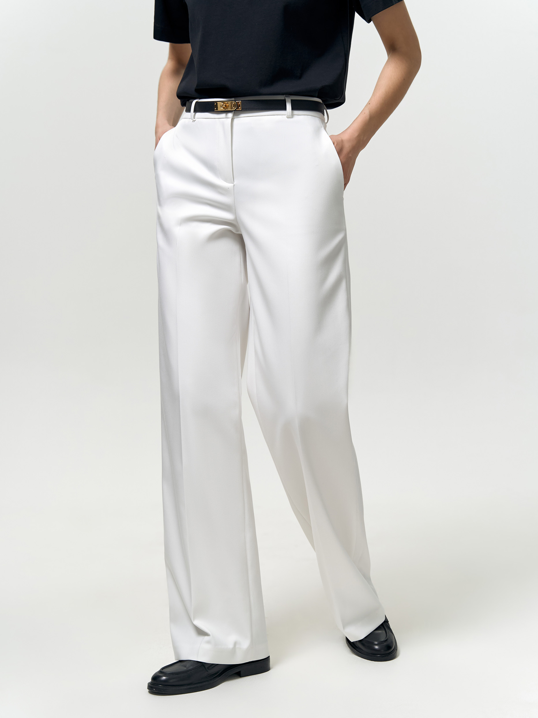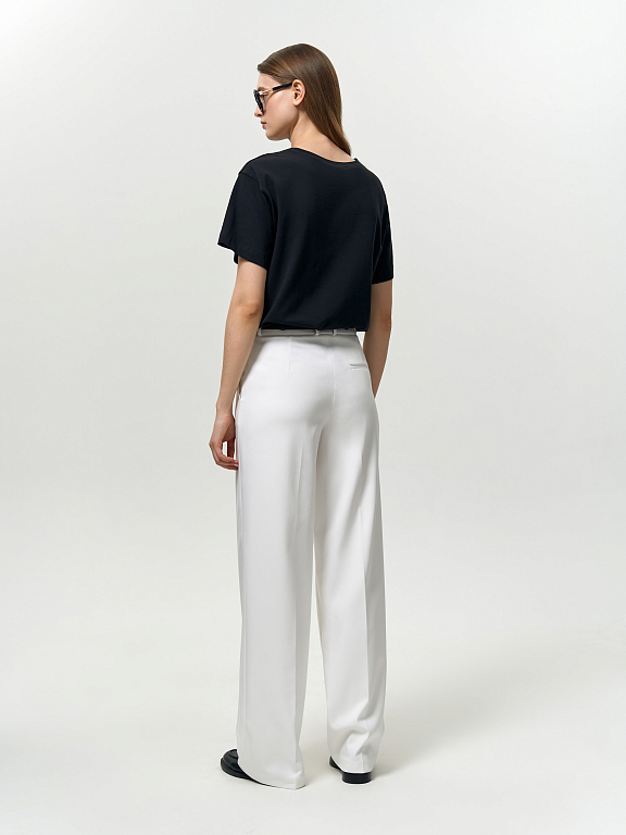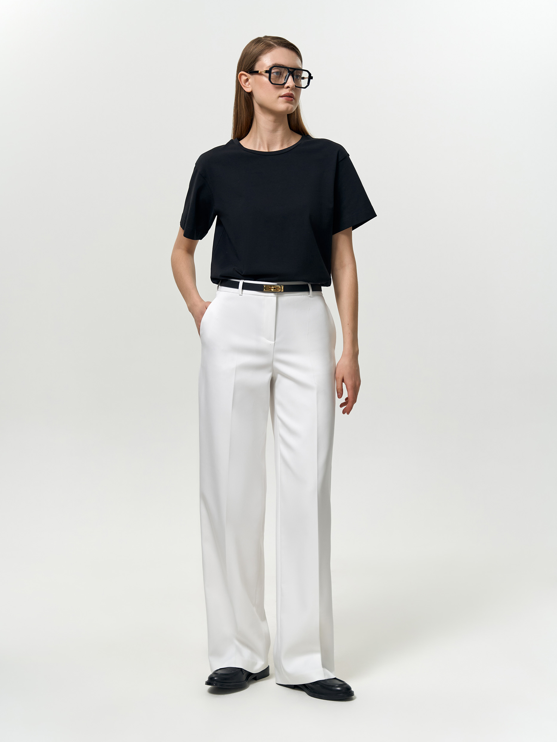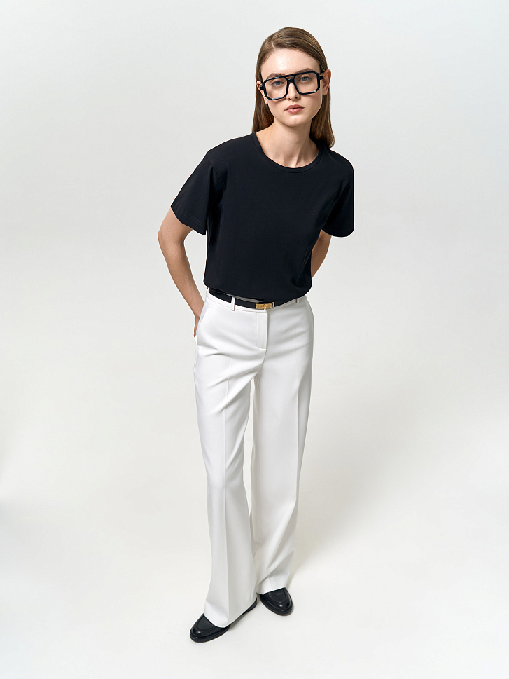 Классические брюки прямого кроя настолько универсальны, что можно придумать десятки вариантов стилизации и не повториться. Плотный костюмный текстиль из поливискозы не вытягивается и хорошо держит форму заутюженных стрелок.