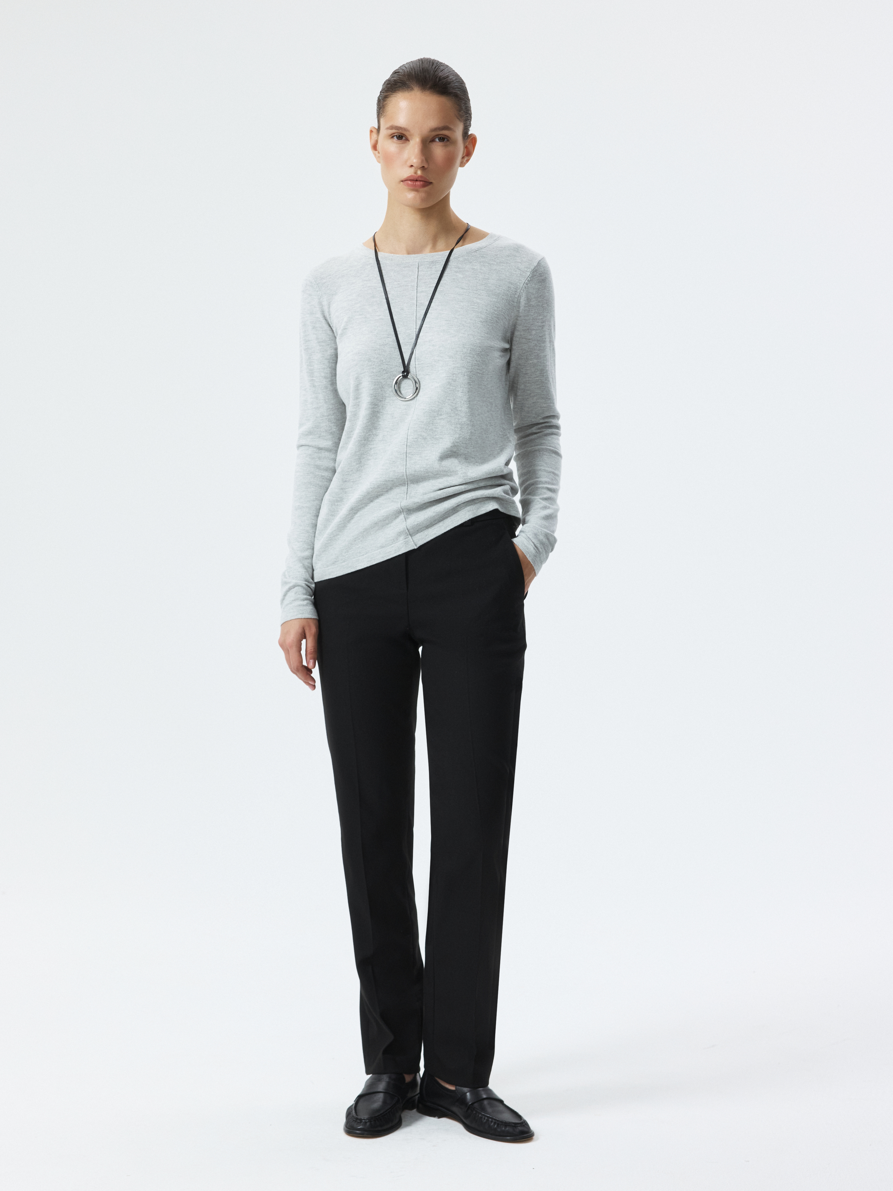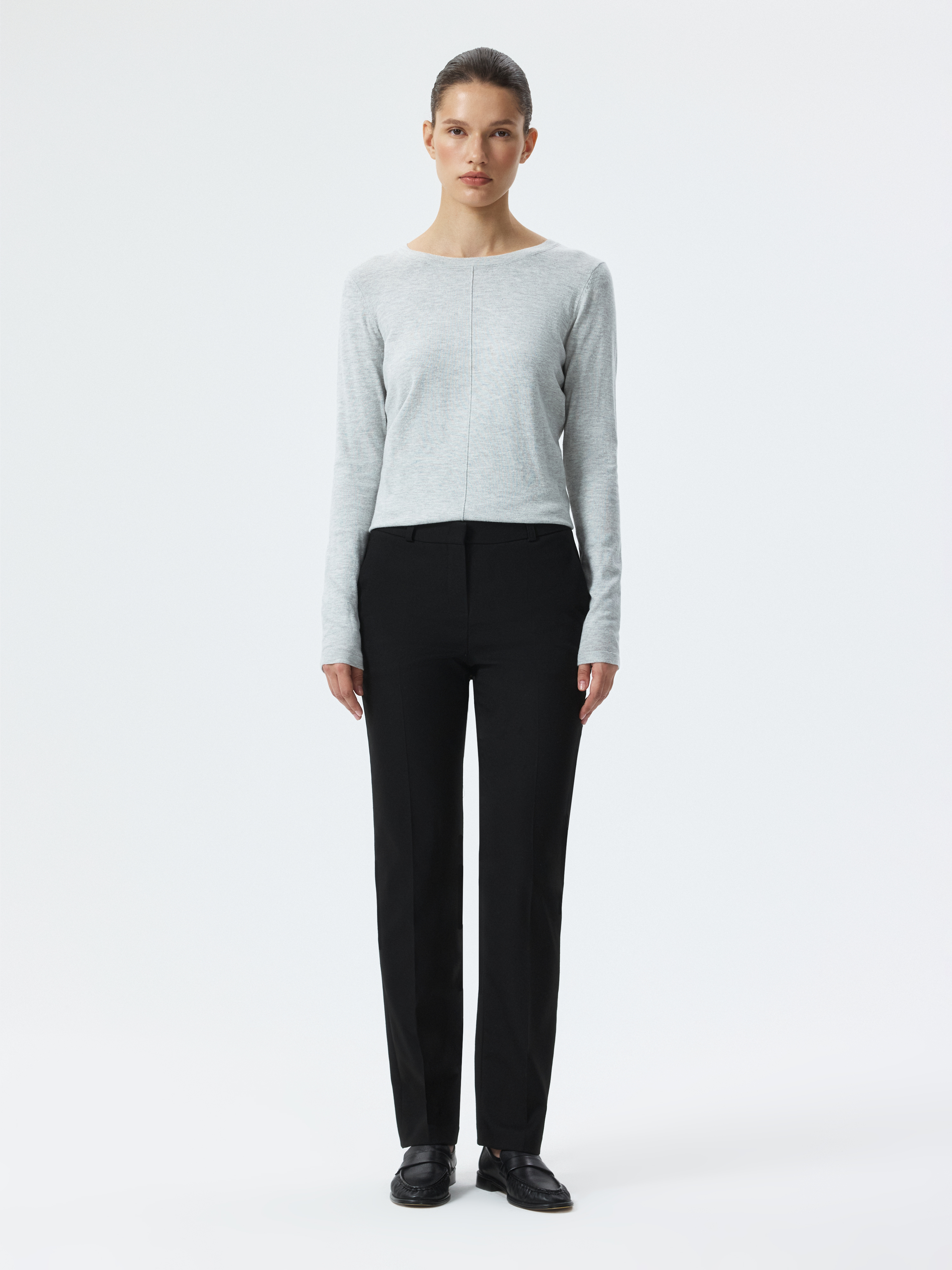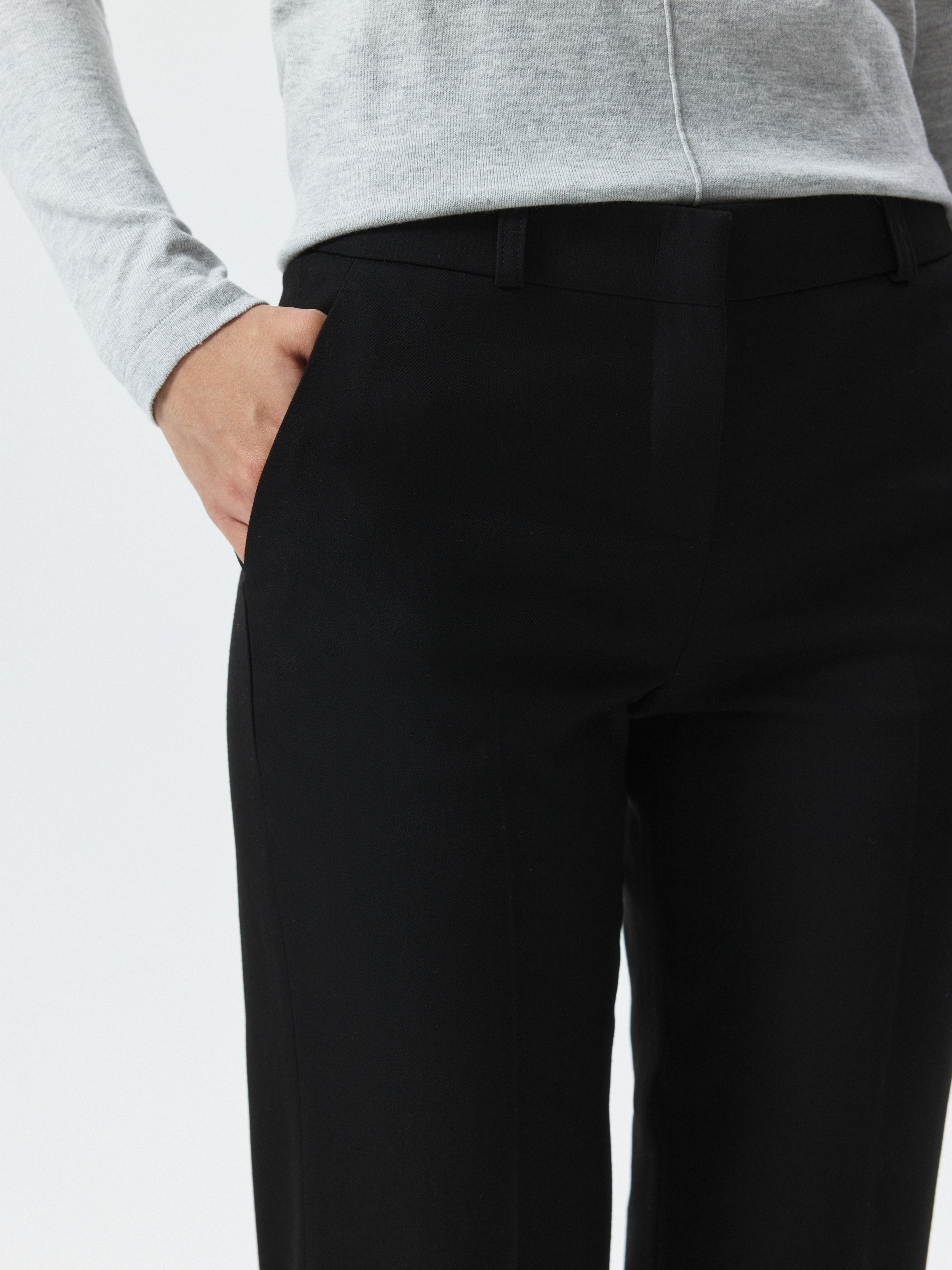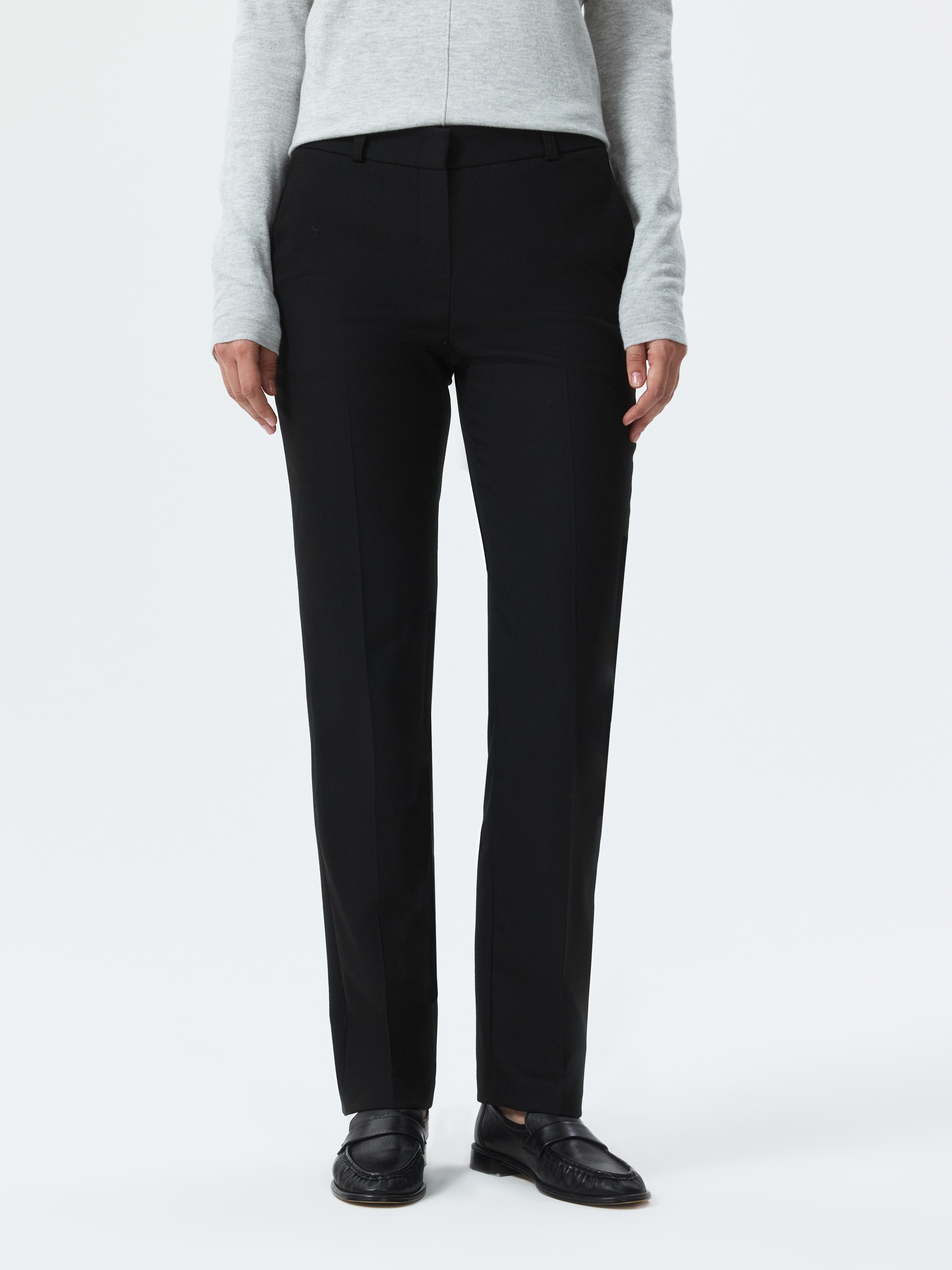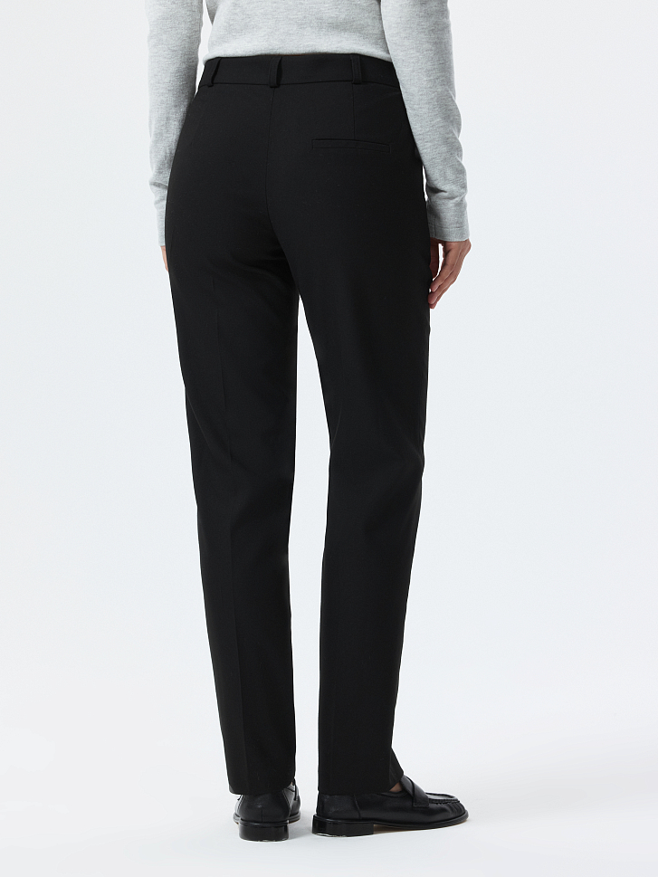 Облегающие брюки без стрелок – элегантный и практичный элемент гардероба, который подходит для любого случая. Плотный костюмный текстиль из поливискозы не вытягивается и не мнется. Брюки с высокой посадкой подчеркнут талию.