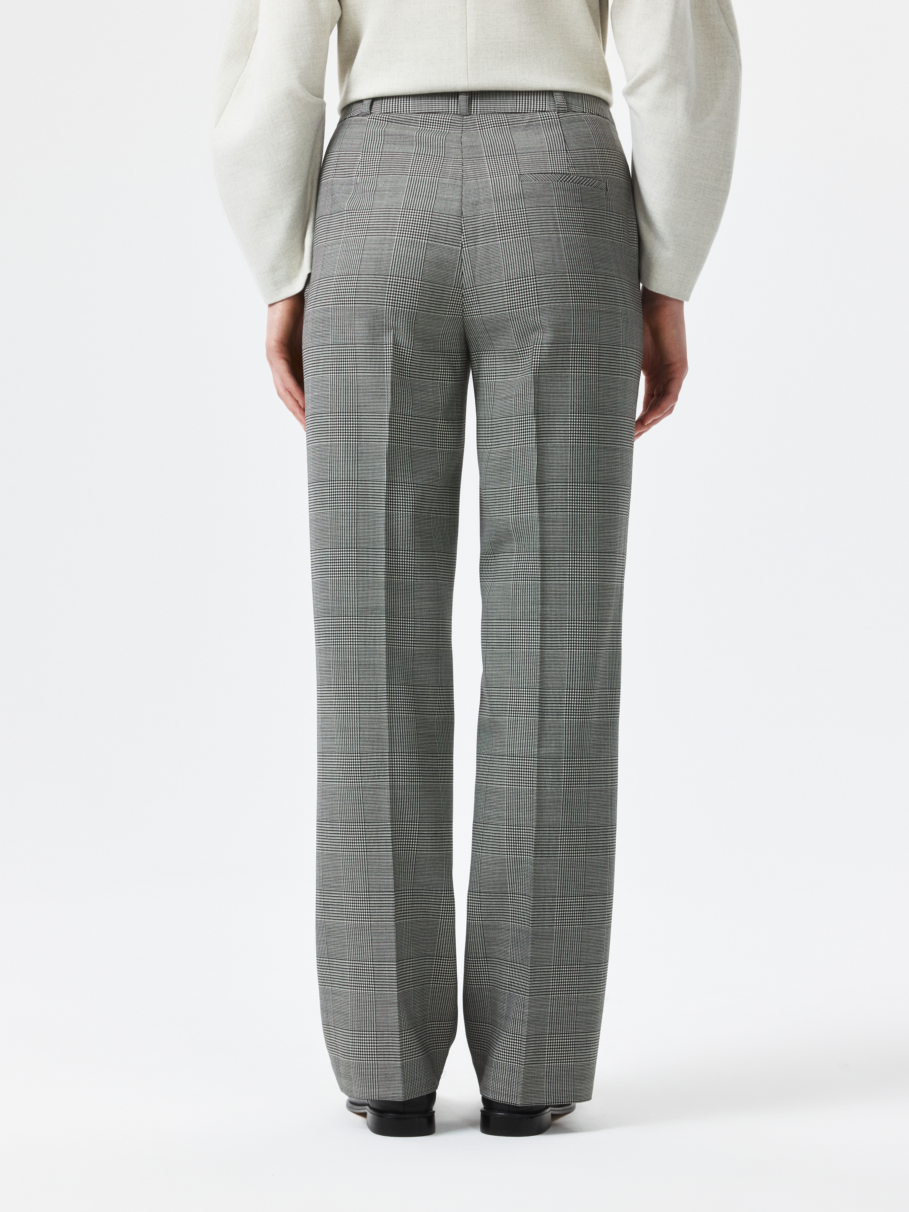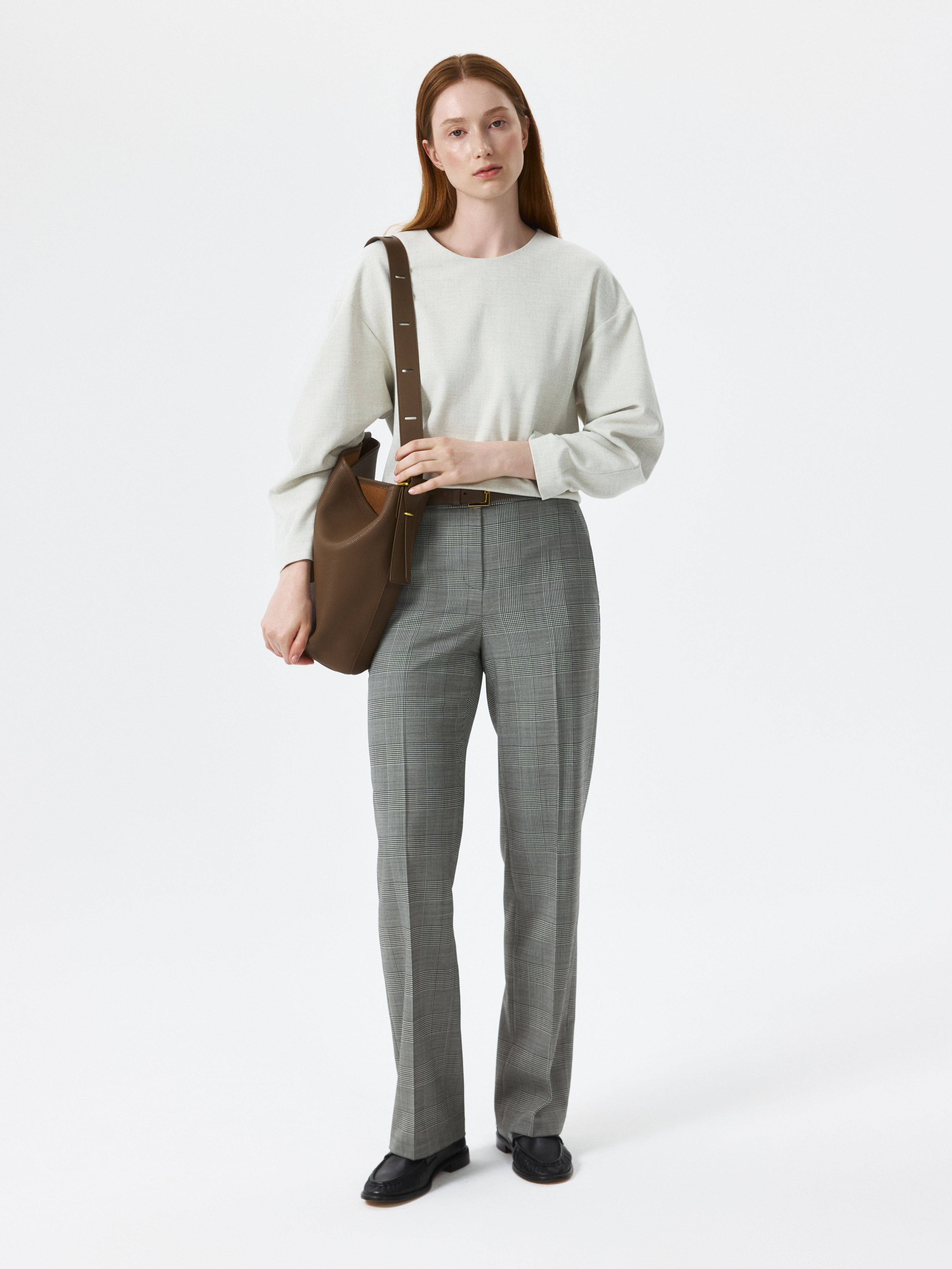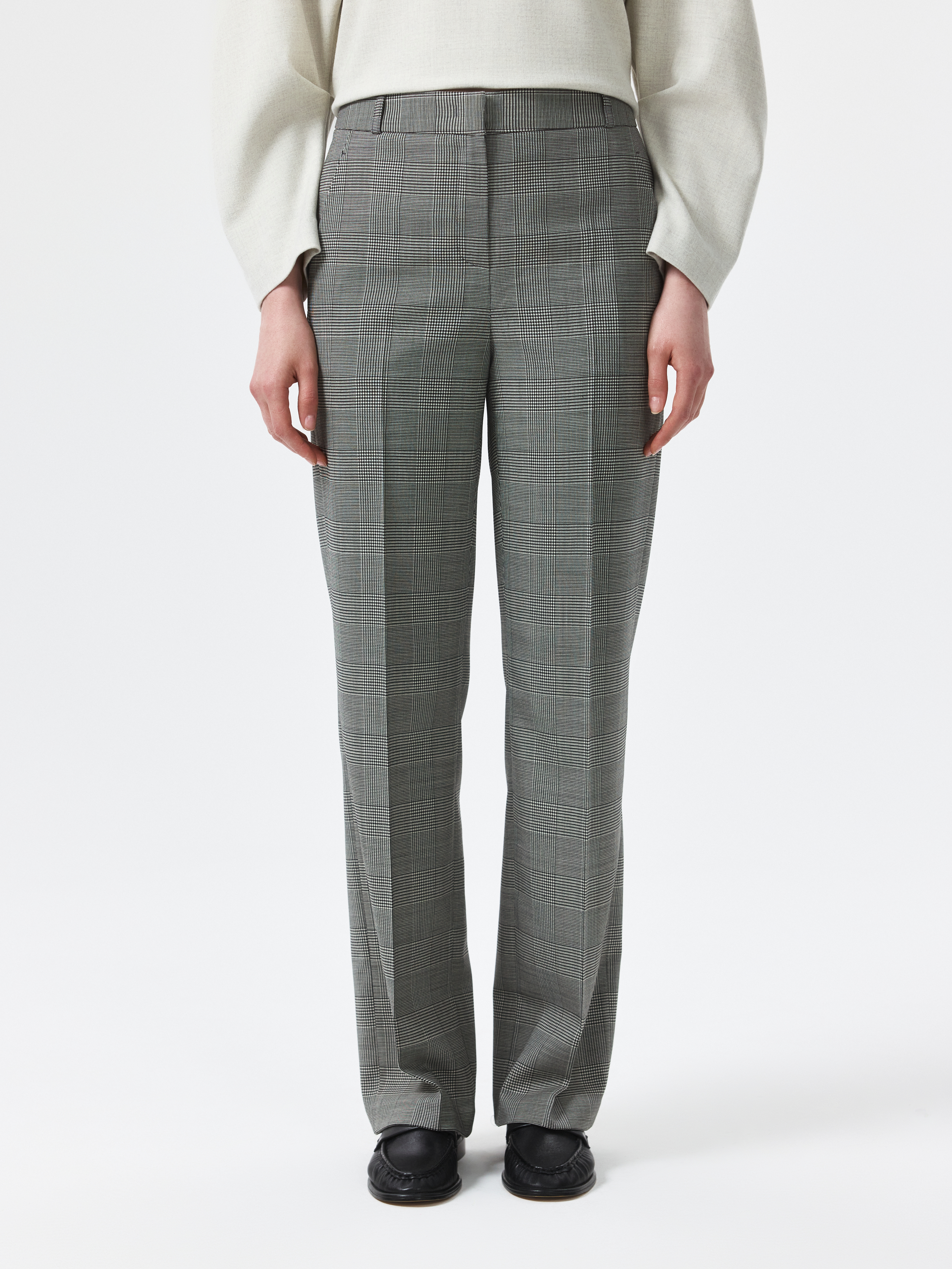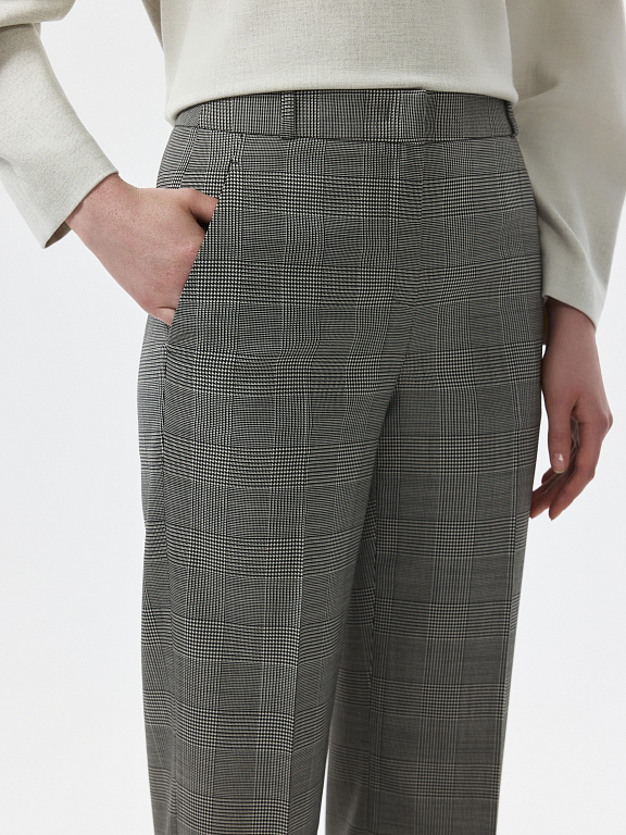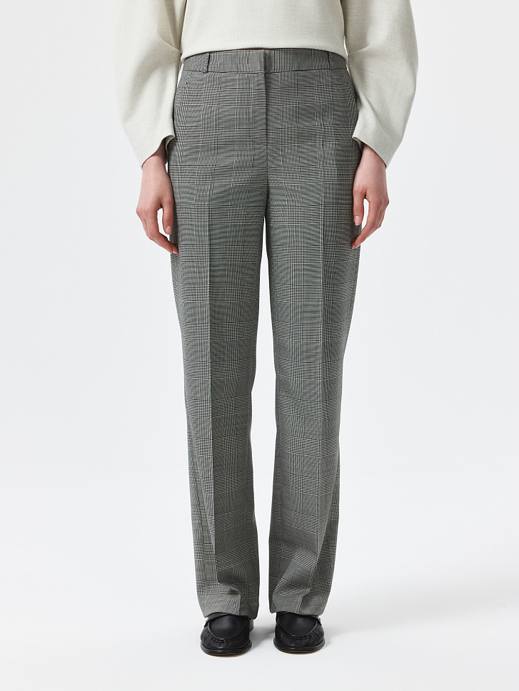 Клетчатые брюки слегка зауженного кроя имеют классический силуэт и четкую посадку. Изящество выверенных линий и внимание к деталям от шлевок до стрелок создают безупречный внешний вид. Облегченный полушерстяной текстиль обладает формоустойчивостью и прочностью.