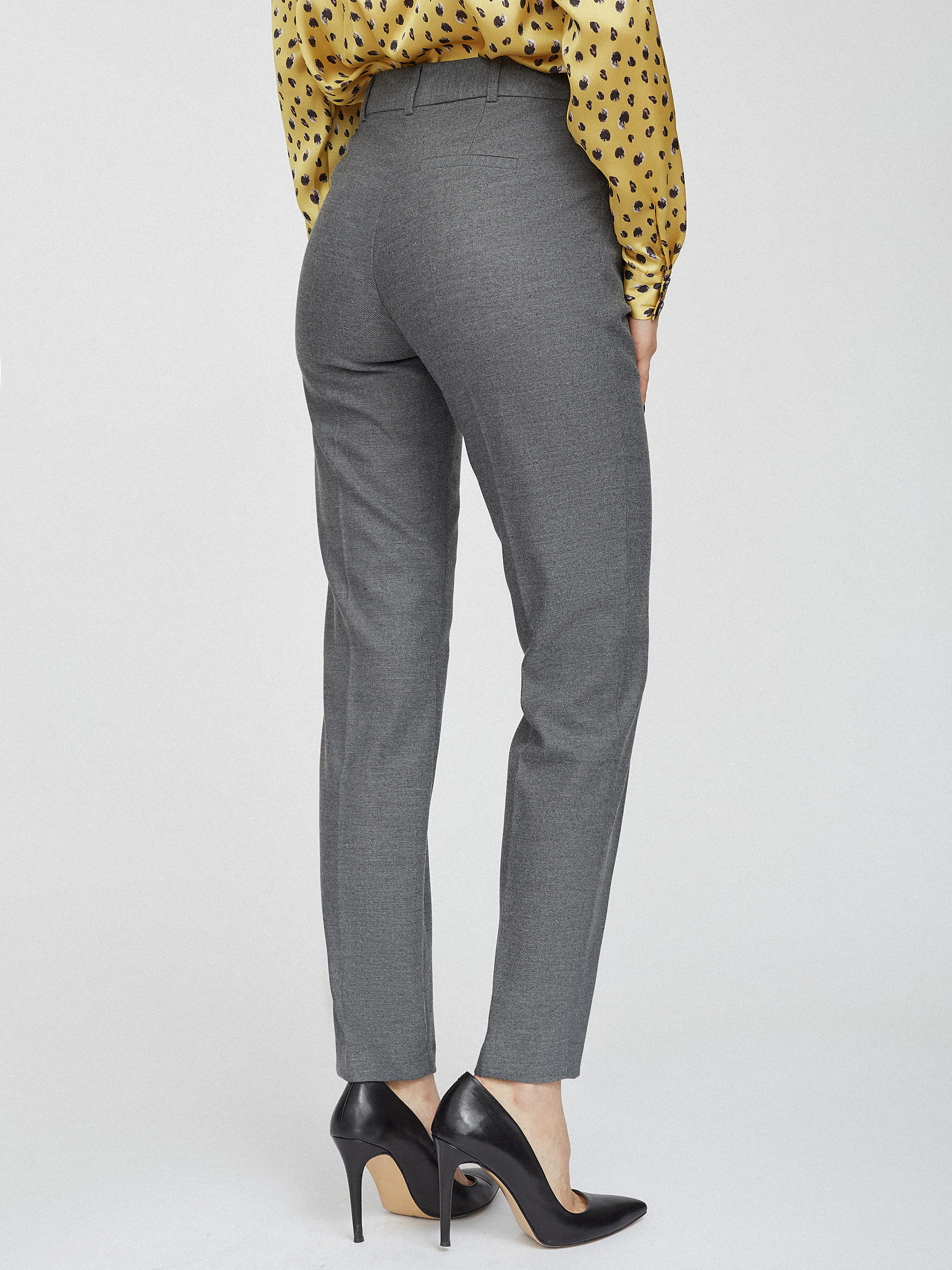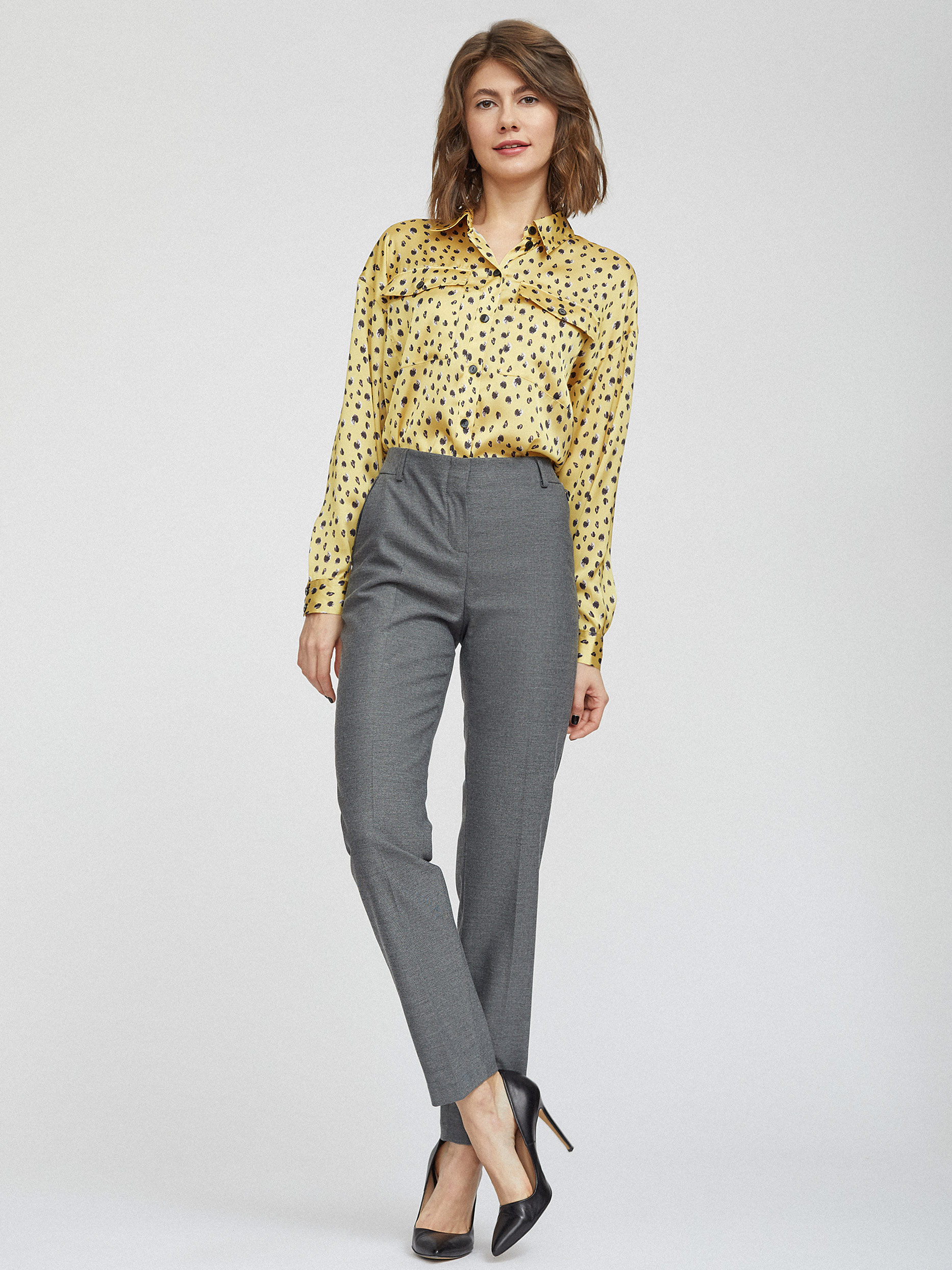 Однотонные брюки прямого кроя из плотной вискозы. Высокая посадка, прошитые стрелки, карманы на молниях по бокам, декоративный карман сзади.