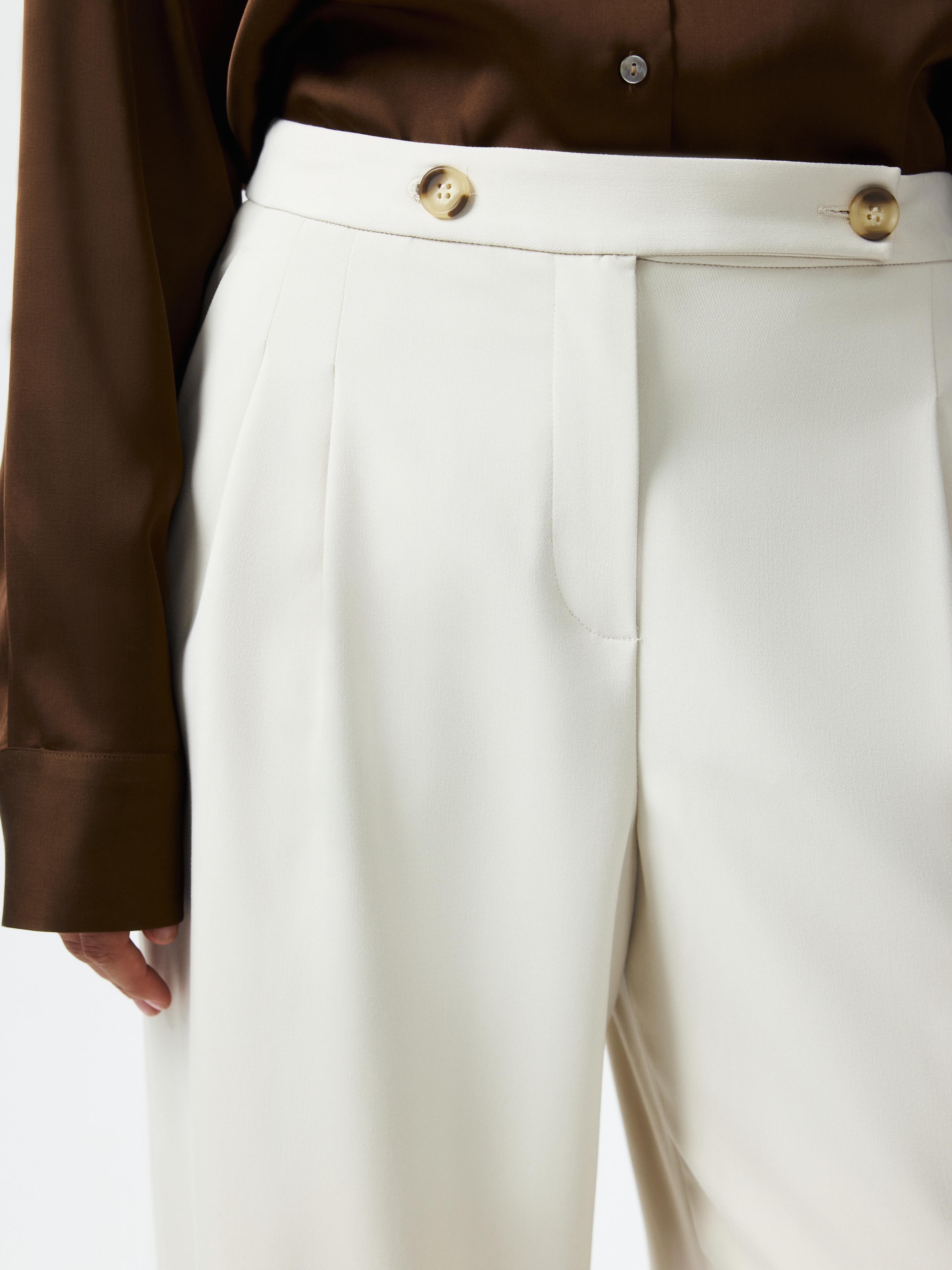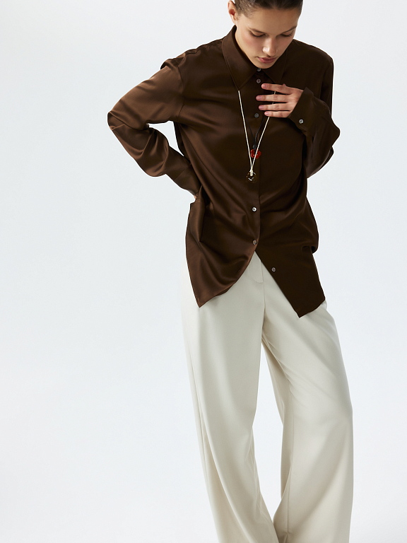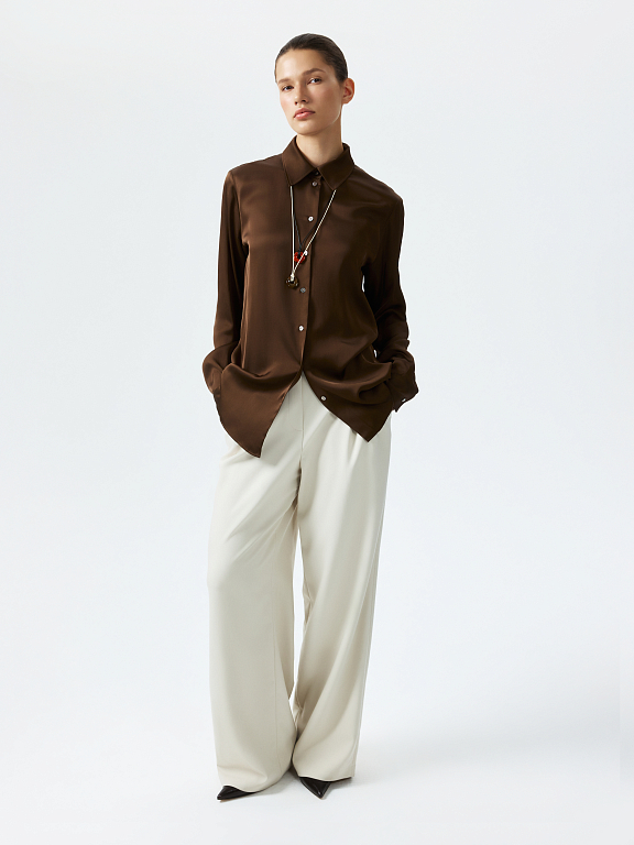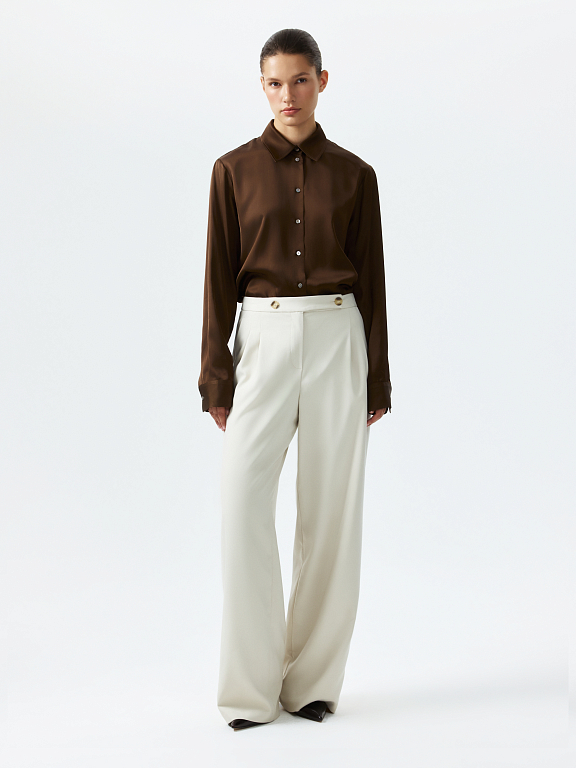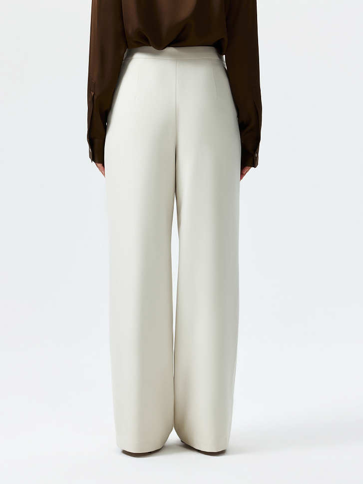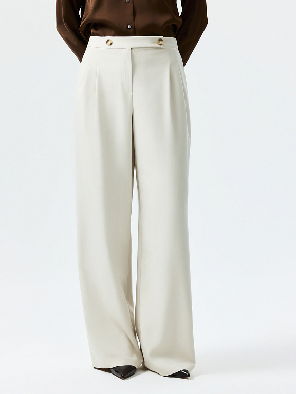 Прямые лаконичные брюки – абсолютная база повседневного гардероба. Плотный текстиль из поливискозы не вытягивается и обладает износоустойчивостью. Секрет успеха – защипы спереди, которые создают мягкие складки, а высокая посадка выгодно подчеркнет талию.