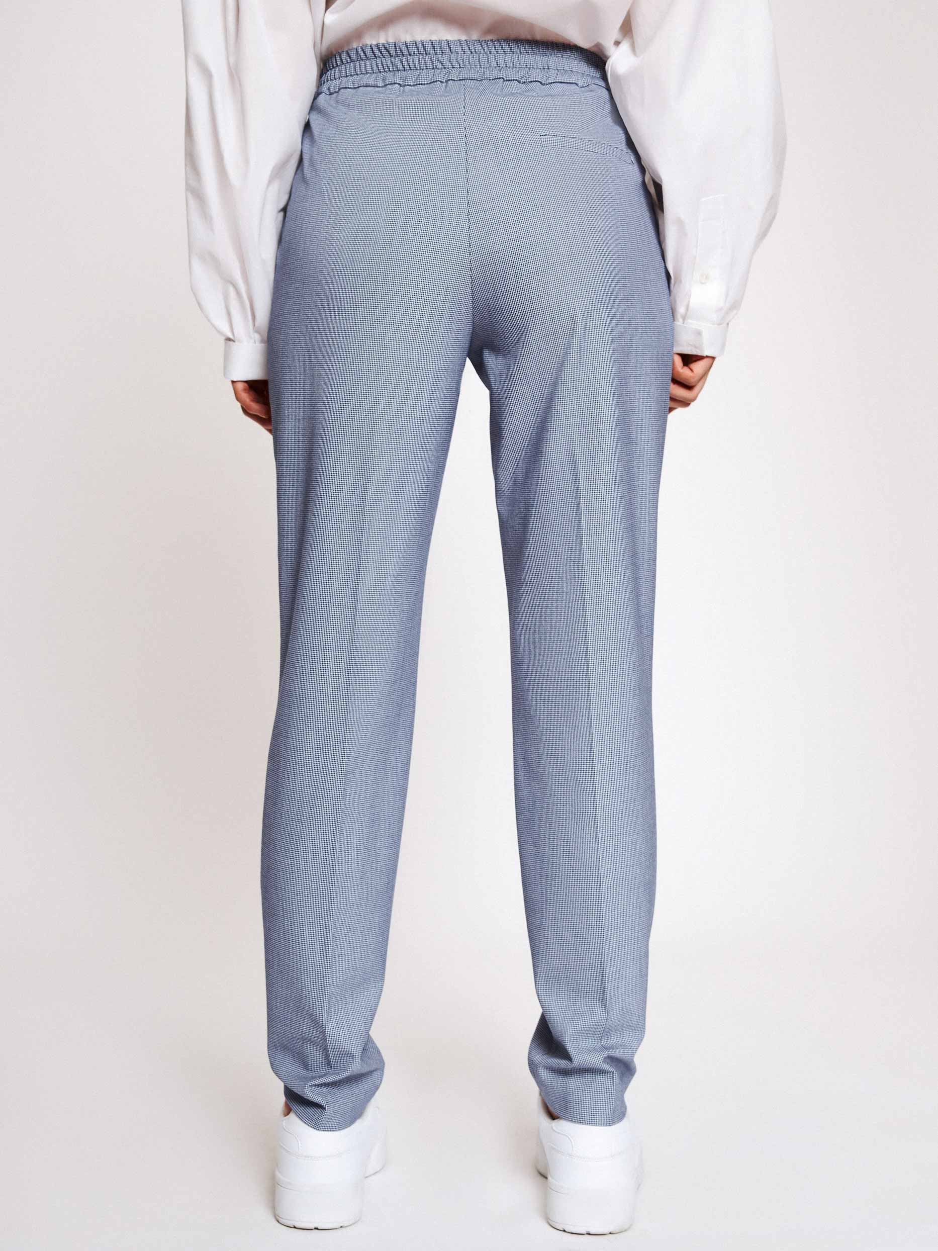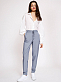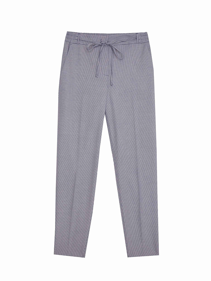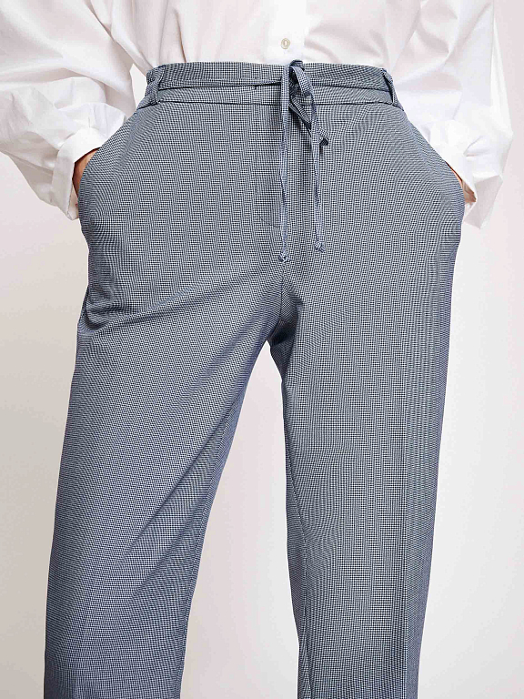 Слегка укороченные брюки зауженного кроя. Средняя посадка, эластичный пояс, завязки, боковые карманы, декоративный карман сзади.