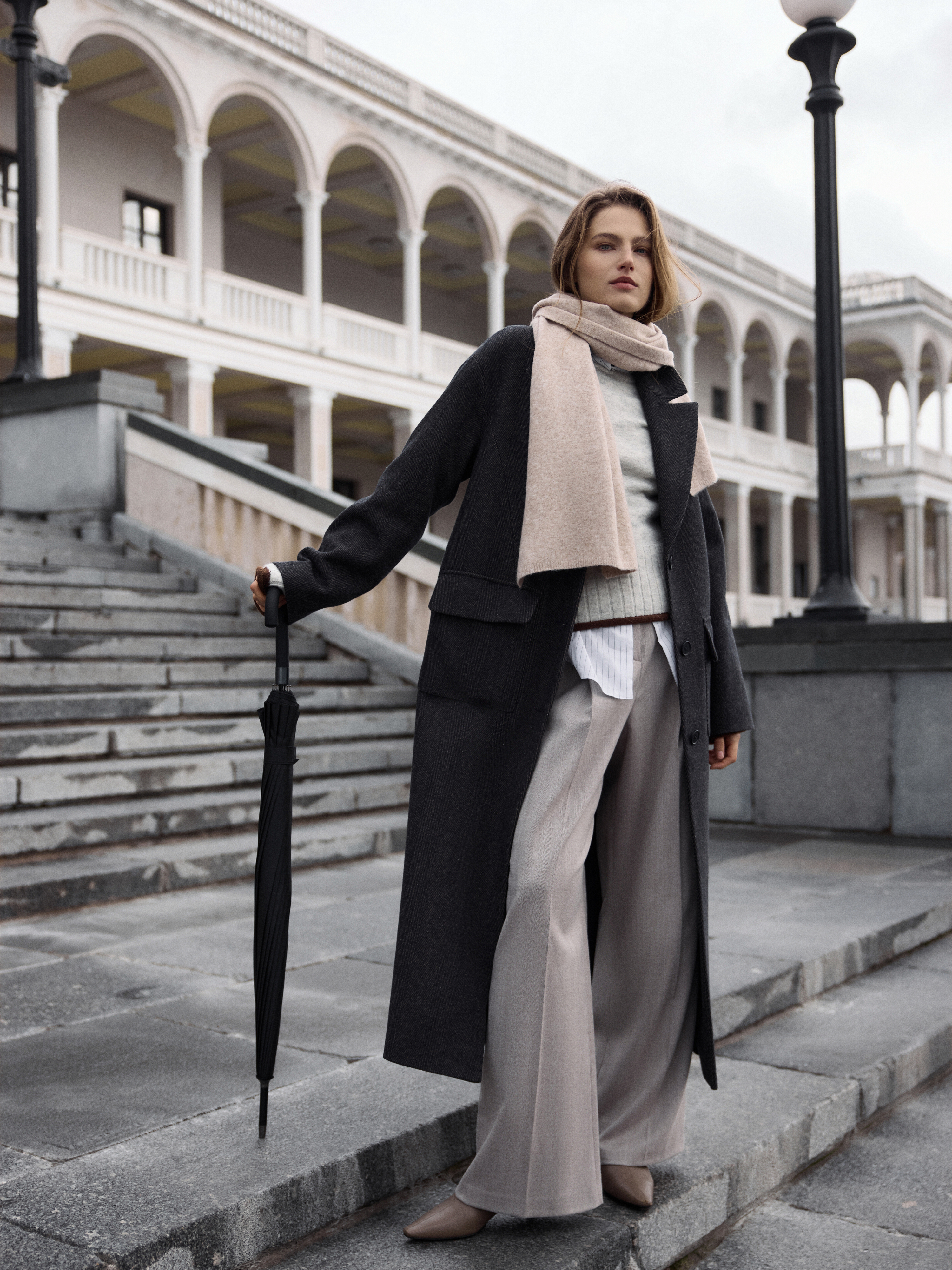 Брюки в расслабленном стиле – абсолютный хит деловой капсулы. Они удобно сидят по фигуре и не сковывают движения. Плотная ткань с содержанием шерсти с узором "в елочку" не вытягиваетс и легко струится. Модель свободного кроя отличают крупные защипы спереди, которые создают мягкие складки.