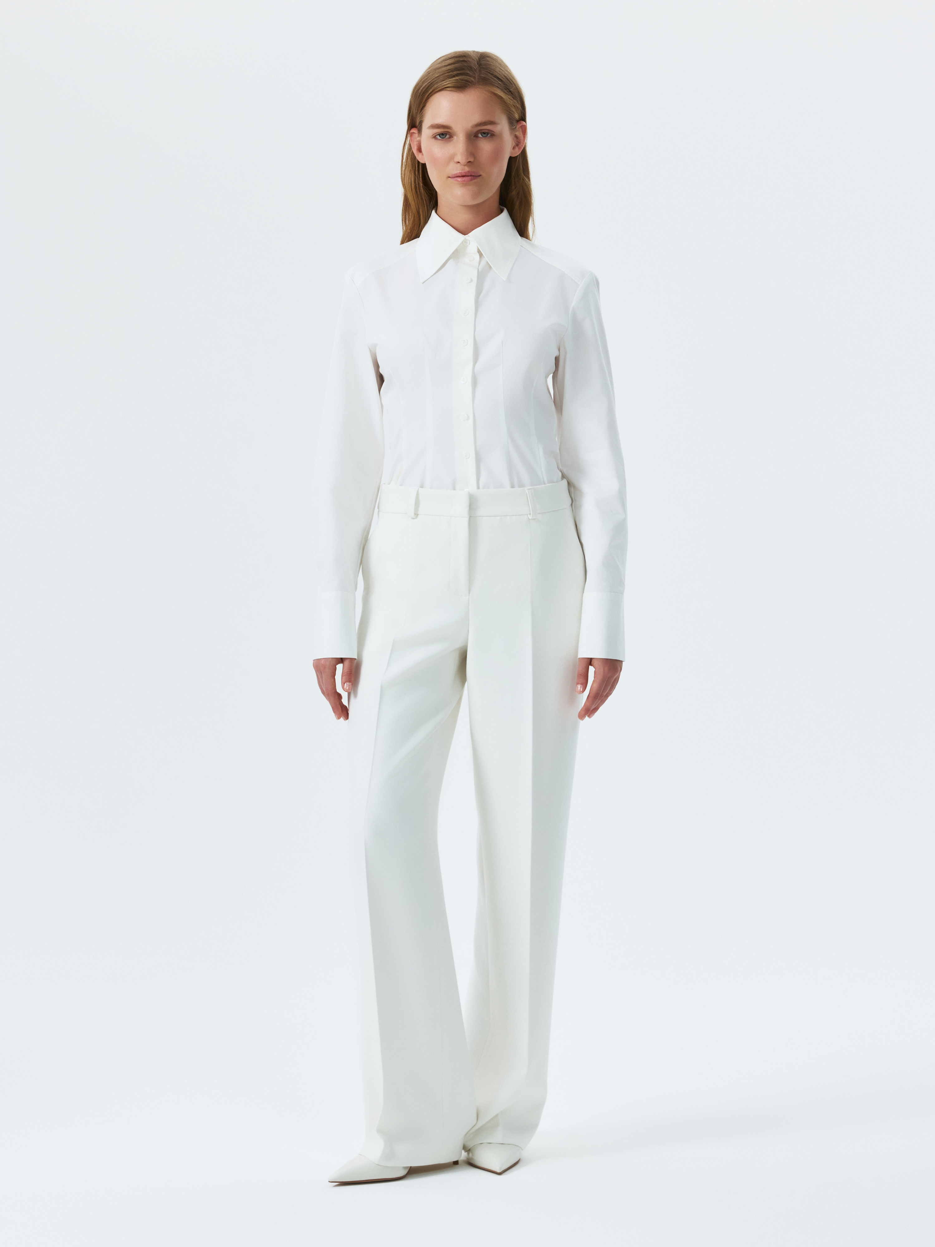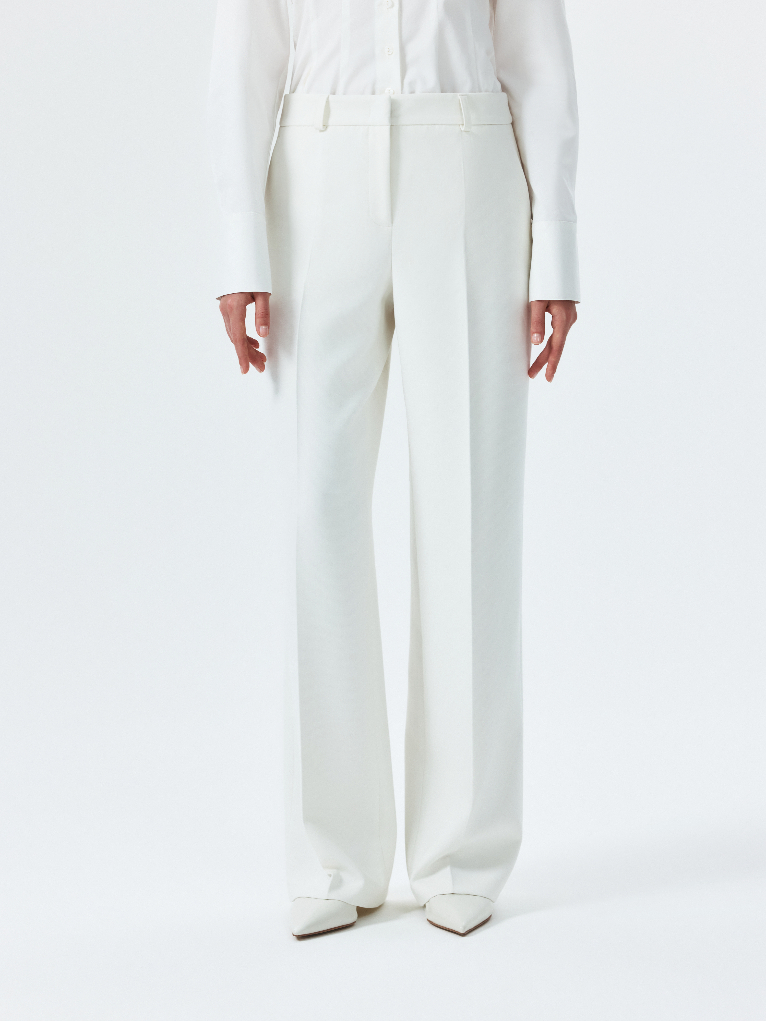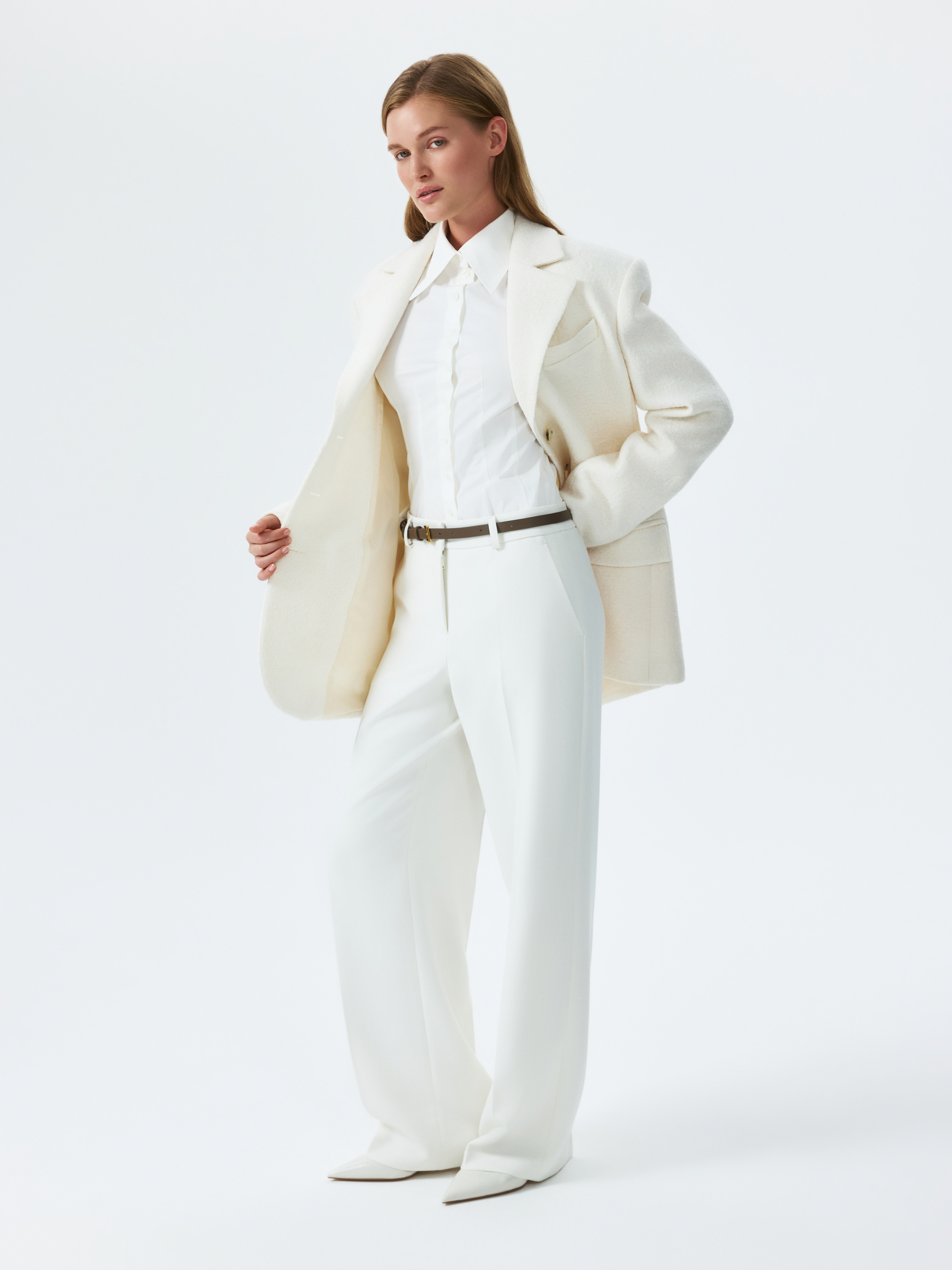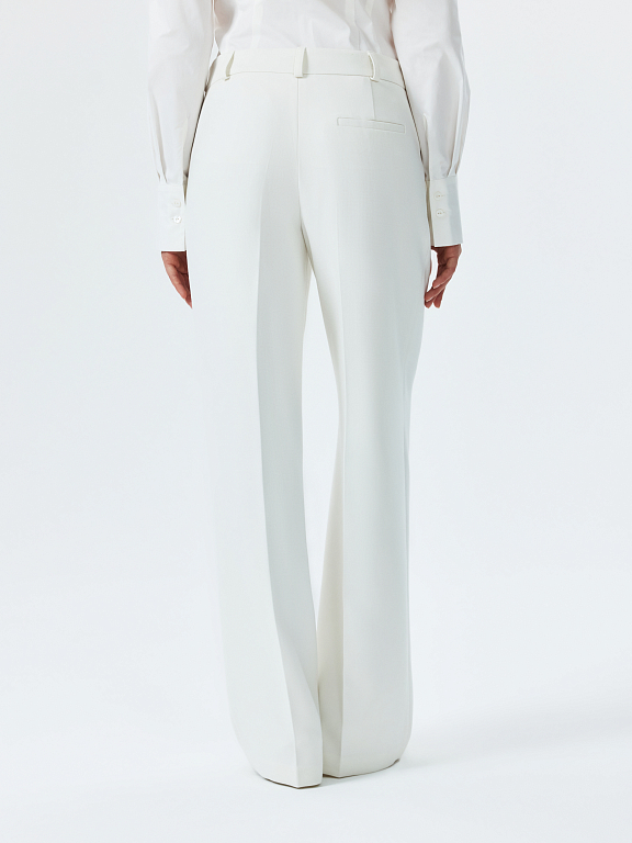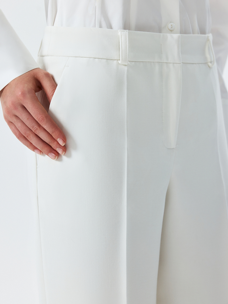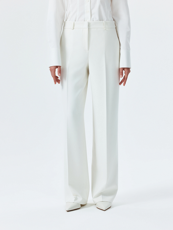 Прямые брюки со стрелками – практичная база на каждый день. Плотный костюмный текстиль из поливискозы не тянется и обладает износоустойчивостью. Собранный и элегантный образ получится с парным жакетом.