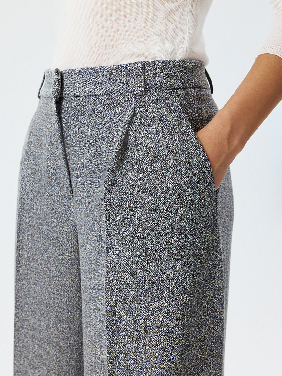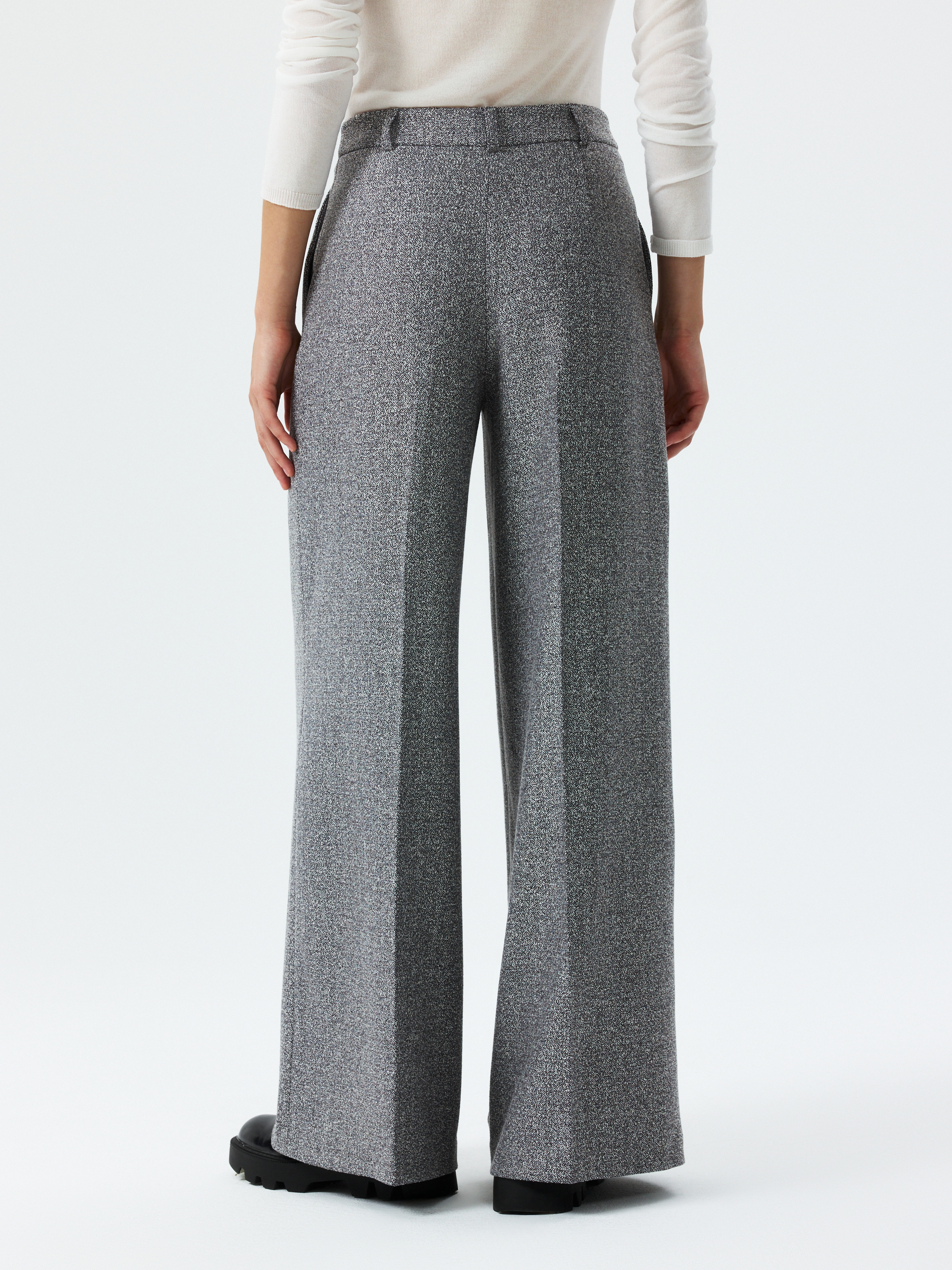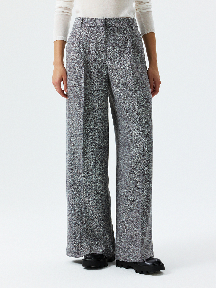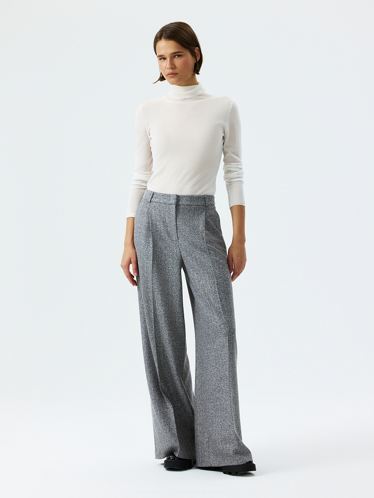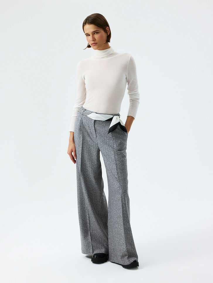 Широкие брюки со стрелками гармонично подстраиваются под разнообразные сочетания. Плотный меланжевый текстиль не мнется и хорошо держит форму мягких складок, он отличается прочностью и износоустойчивостью. Расслабленный крой обеспечивает свободу движений.