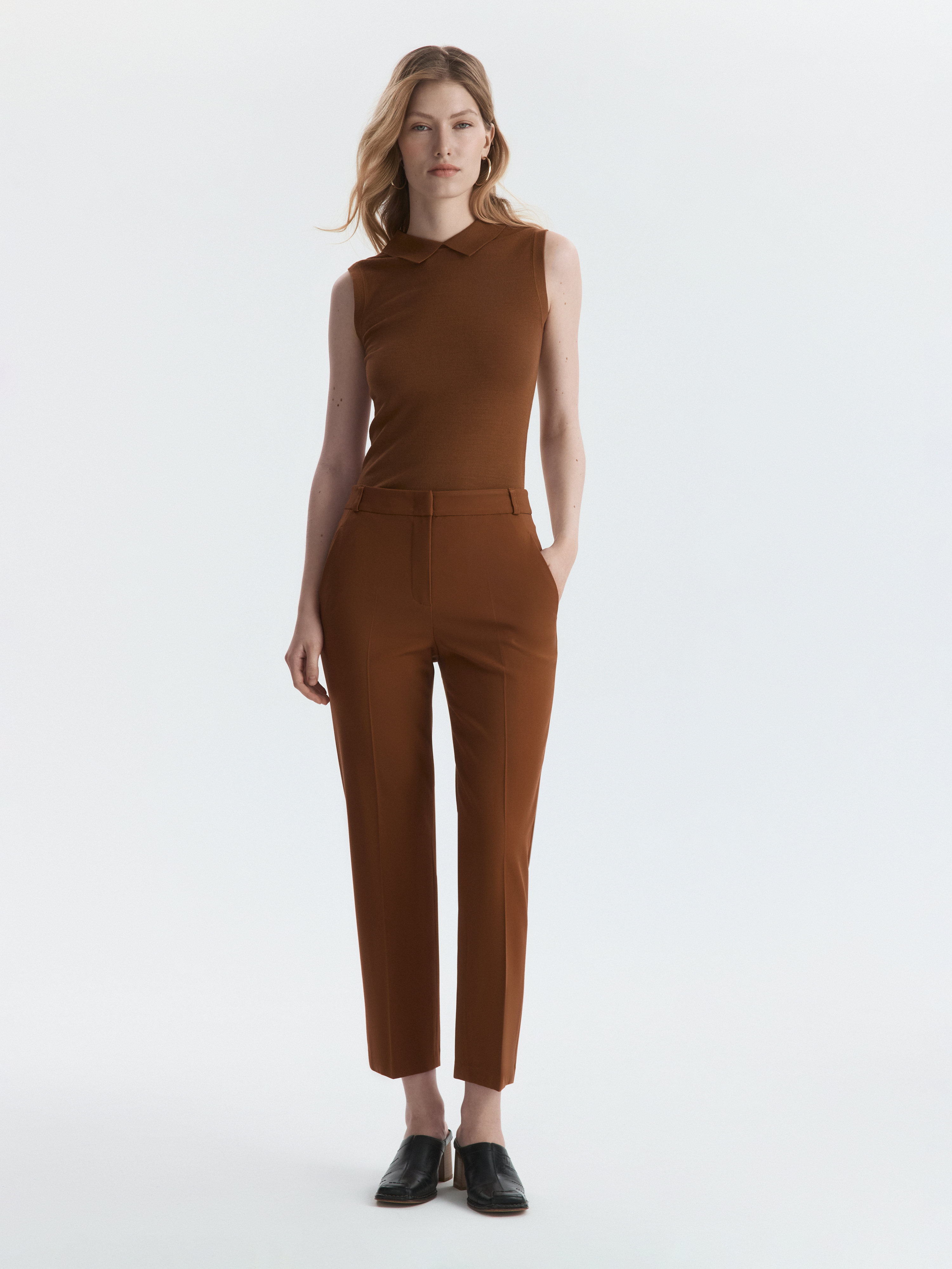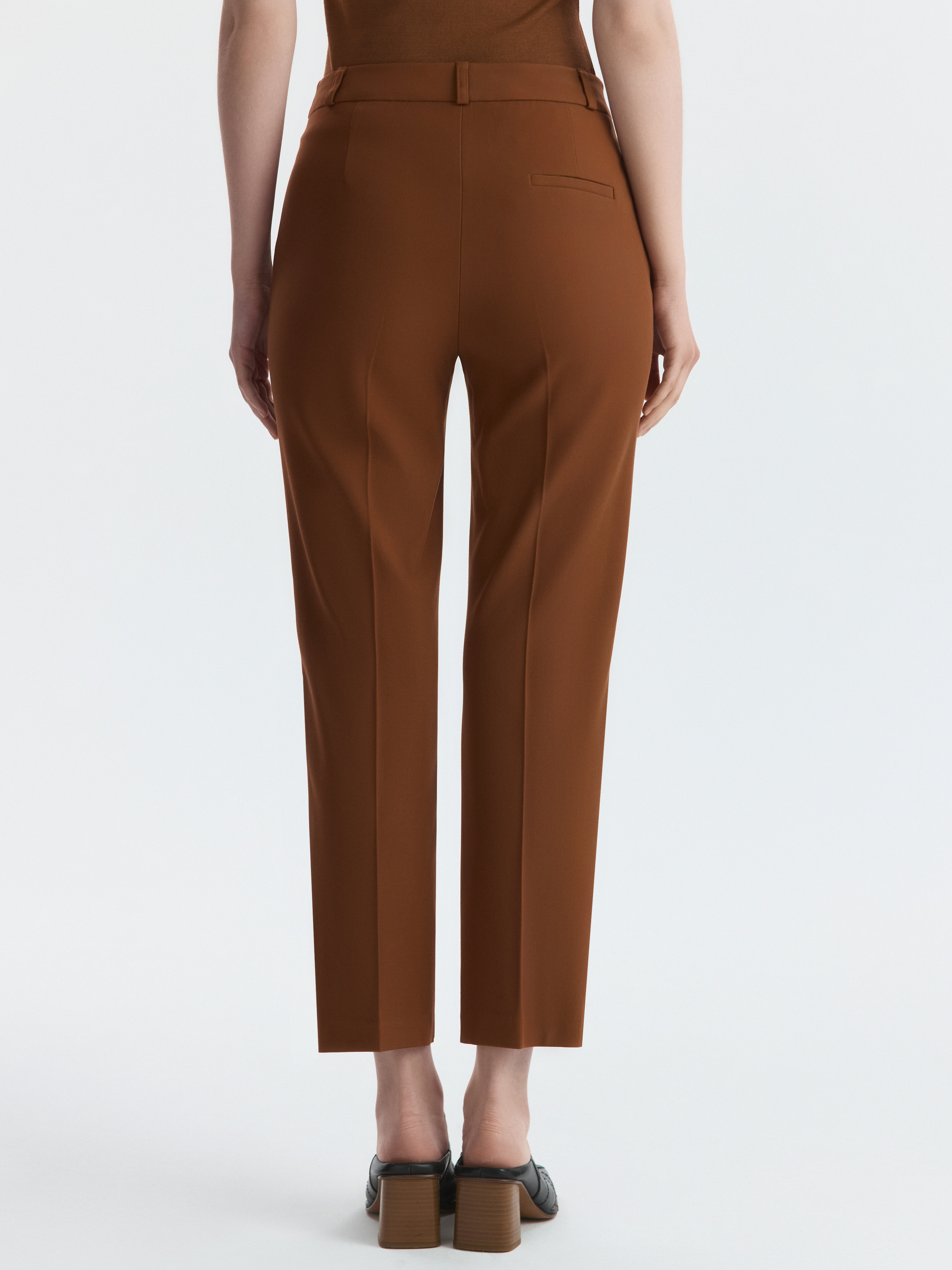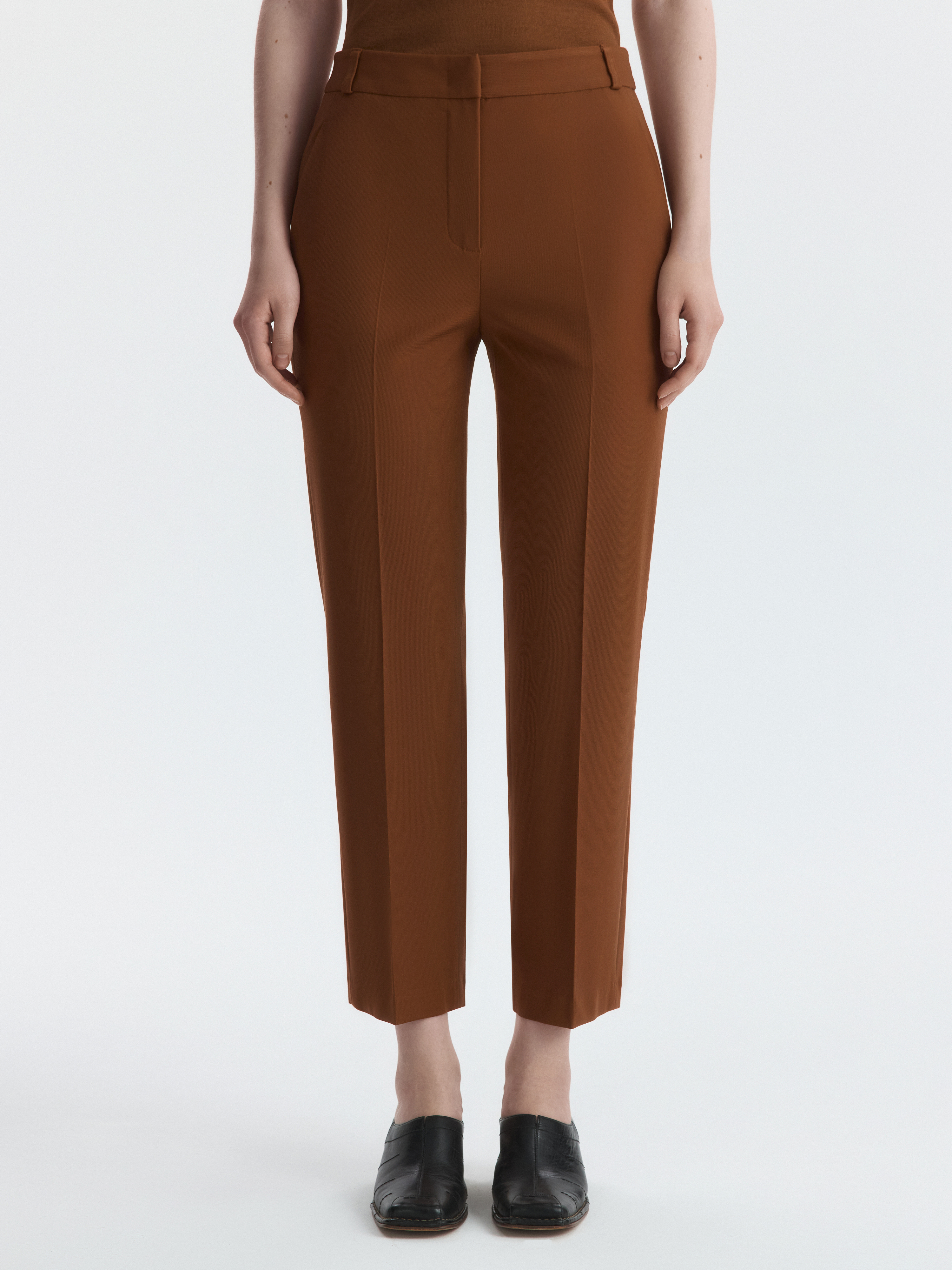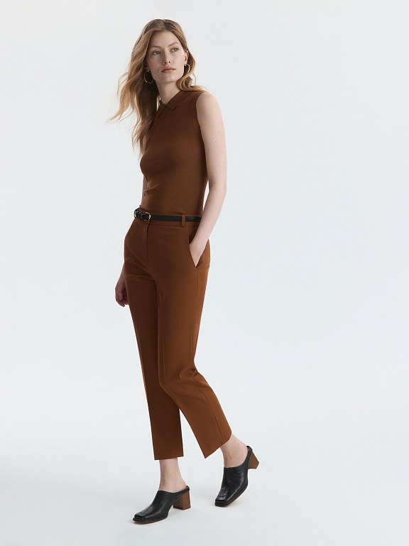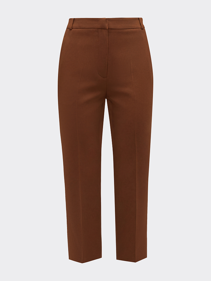 Укороченные брюки станут альтернативой привычной классике. Плотный текстиль из вискозы не тянется и хорошо держит форму заутюженных стрелок. Модель слегка зауженного кроя идеально подойдет для будней в городе или рабочих встреч.