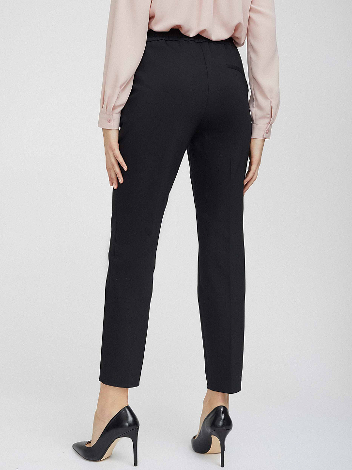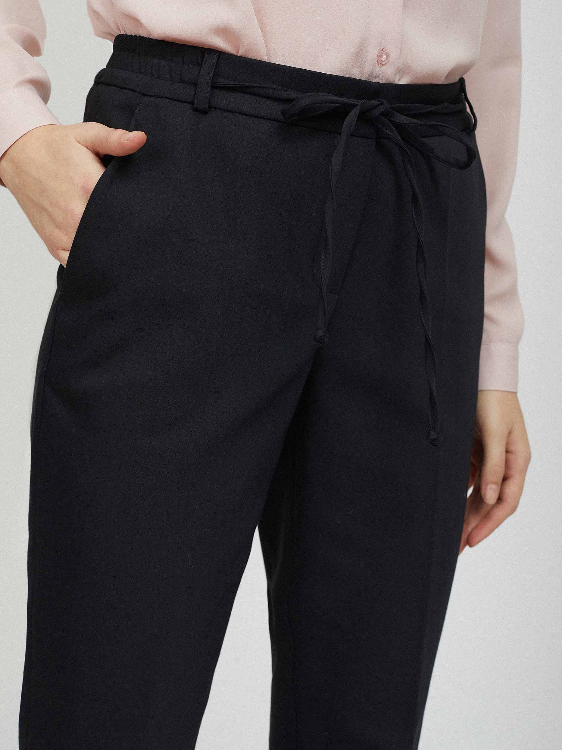 Однотонные брюки зауженного кроя. Средняя посадка, эластичный пояс, прорезные карманы по бокам, декоративный карман сзади, завязки.