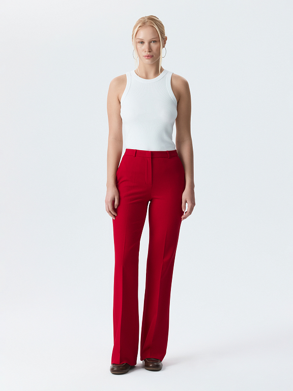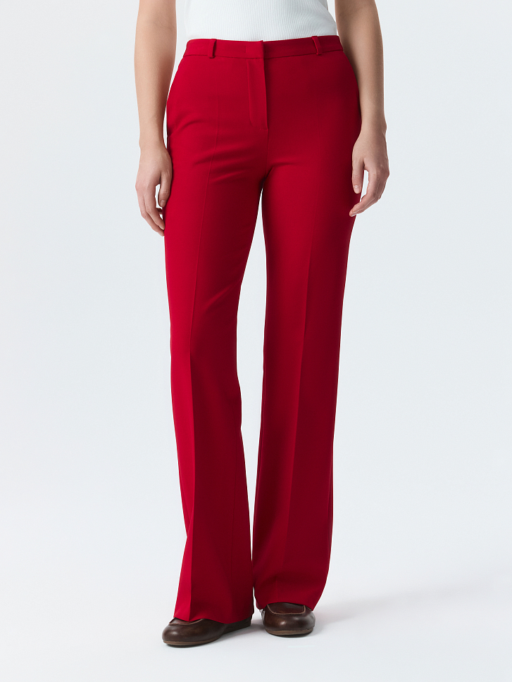 Расклешенные брюки со стрелками – сочетание строгости и элегантности. Плотный текстиль из вискозы не тянется и комфортно сидит по фигуре. Безупречный костюм получится с парным жакетом.