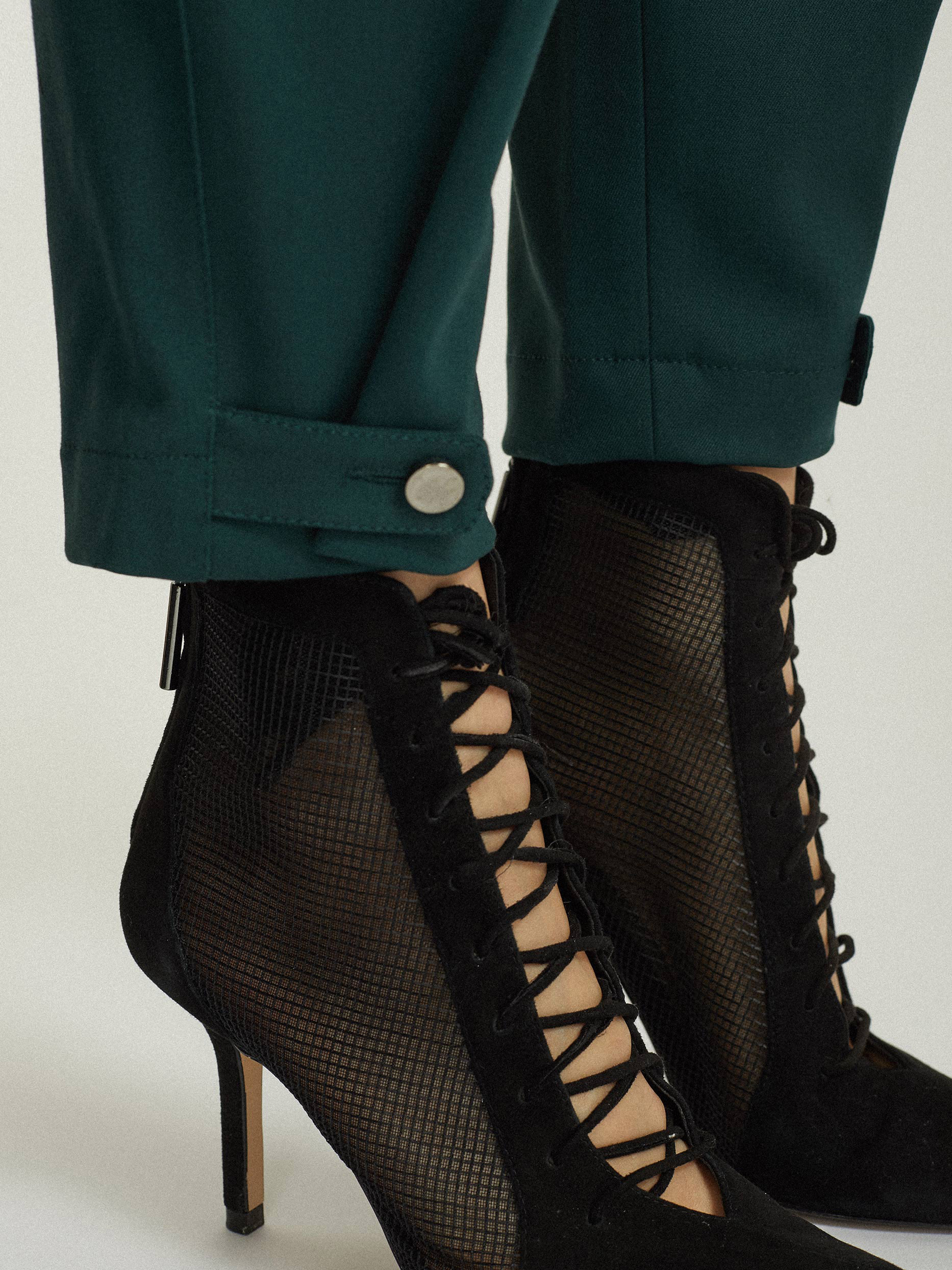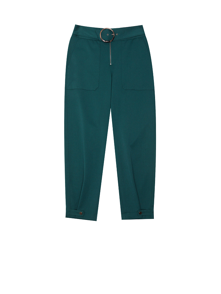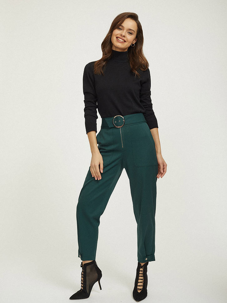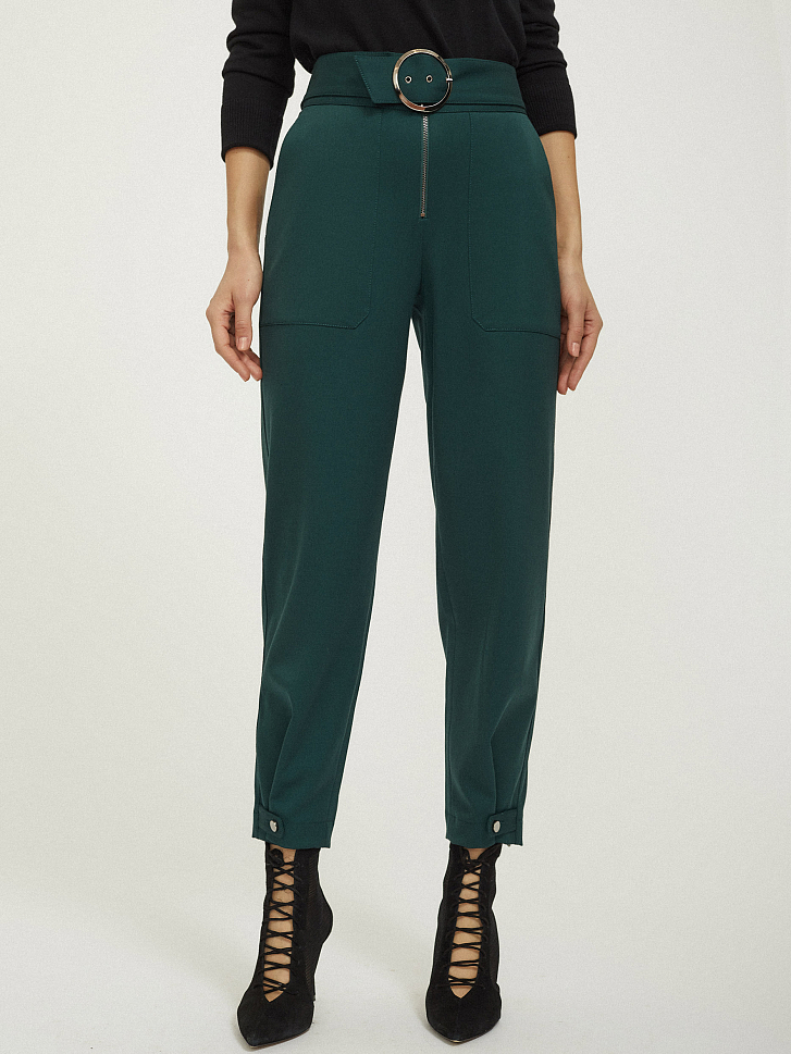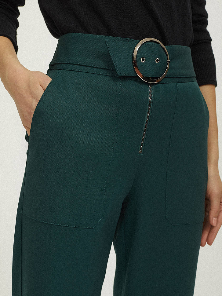 Однотонные брюки прямого кроя. Высокая посадка, накладные карманы по бокам, декоративный карман сзади, паты на пуговицах по нижнему краю.