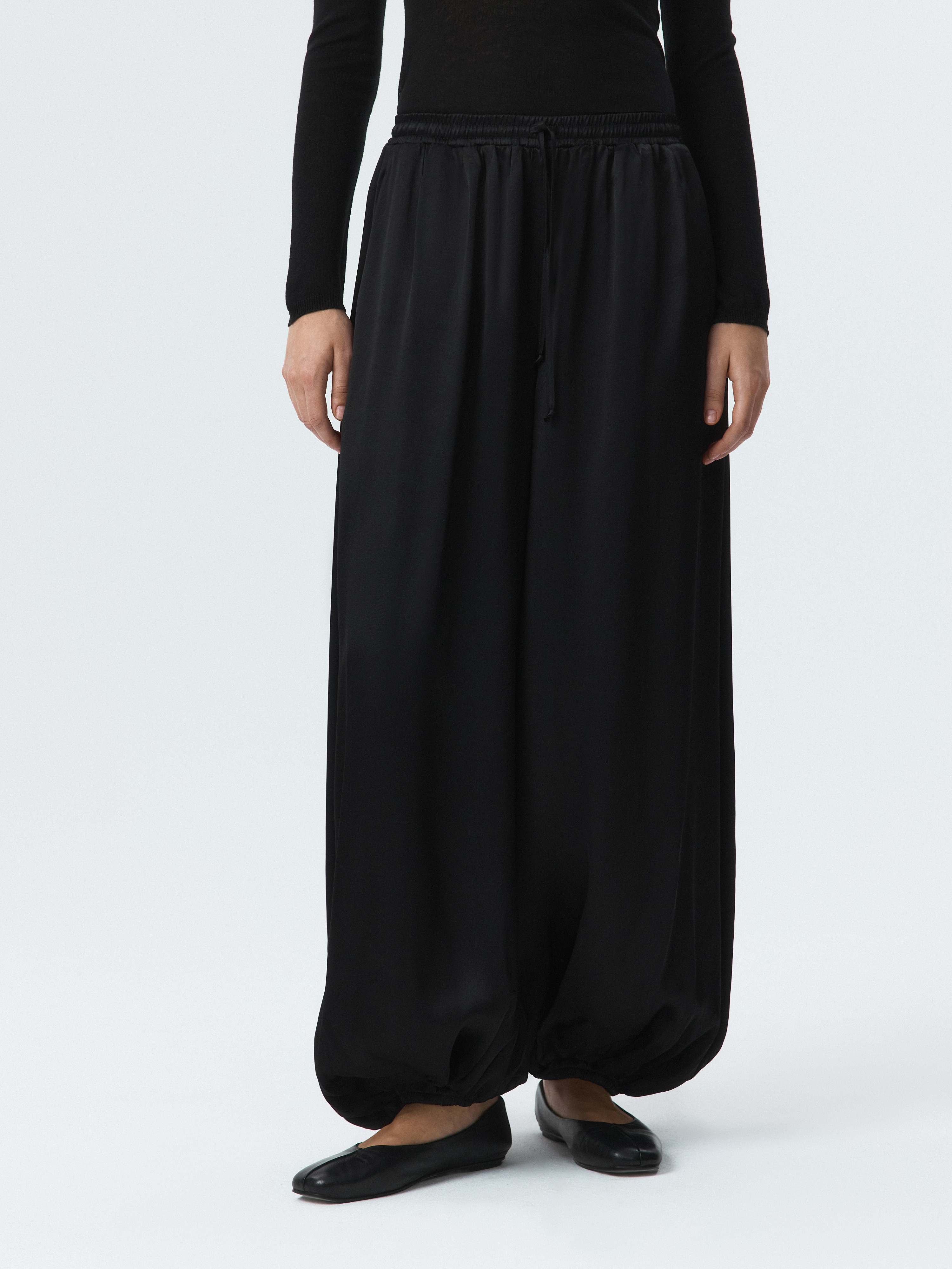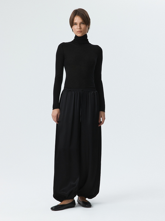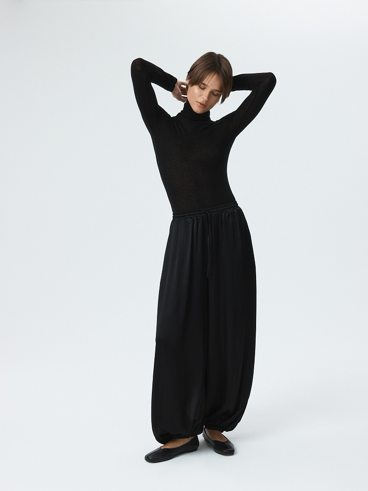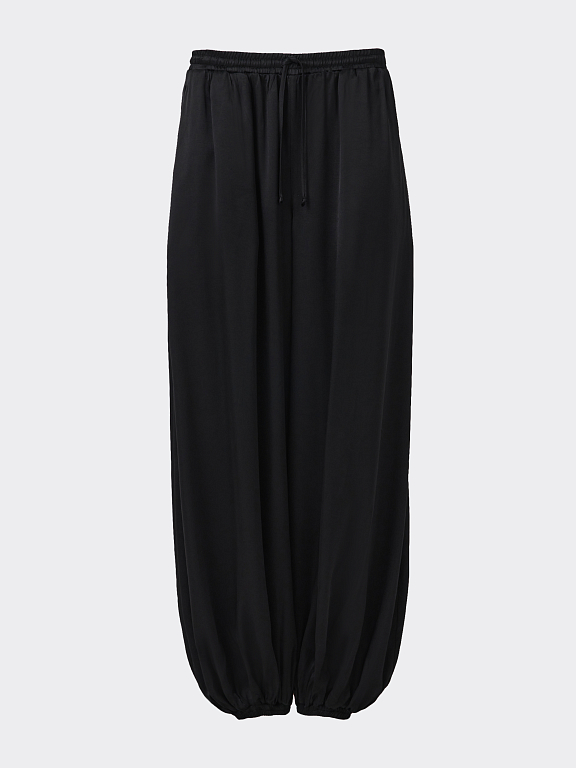 Атласные шаровары – новая версия трендового силуэта. Легкий шелковистый текстиль с приятной на ощупь фактурой струится вдоль тела и не просвечивает. Кулиска позволяет отрегулировать удобную посадку выше или ниже на талии, а низ на резинке комфортно облегает щиколотку.