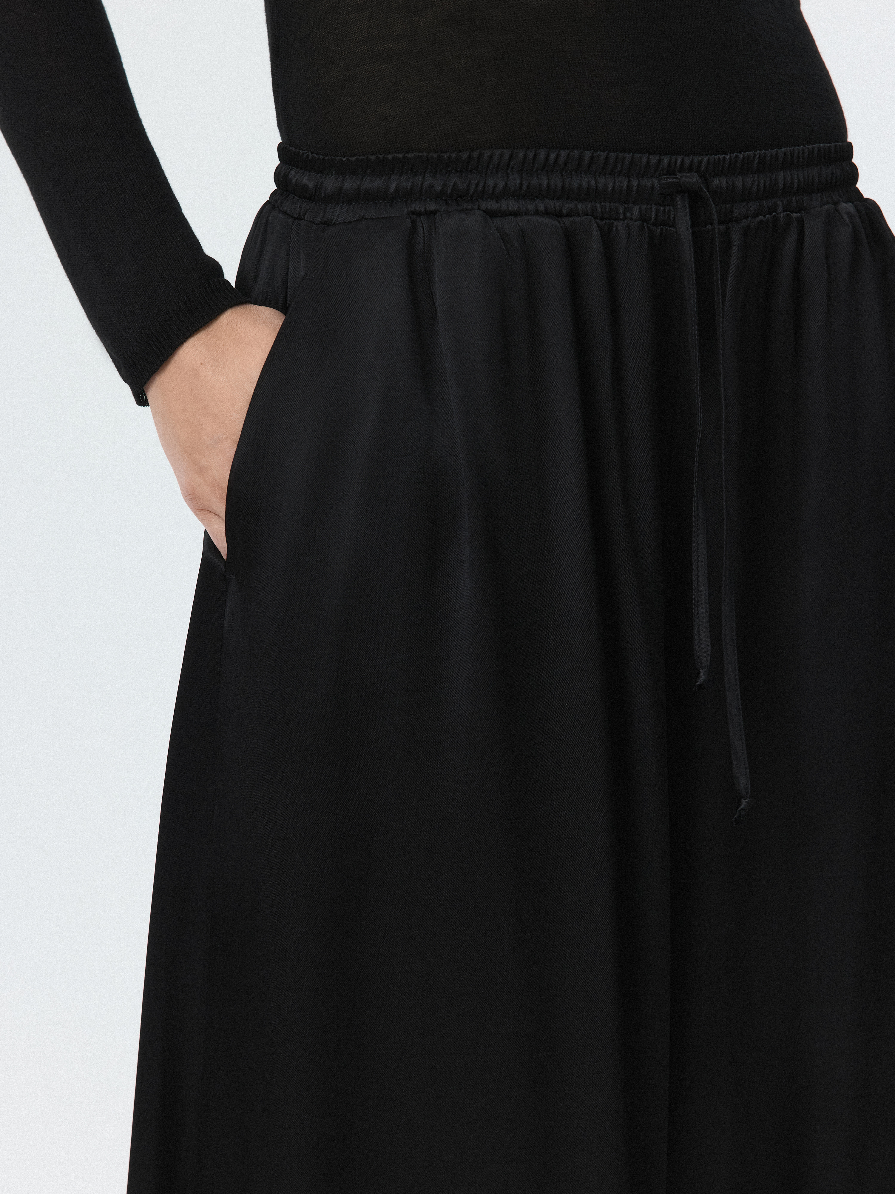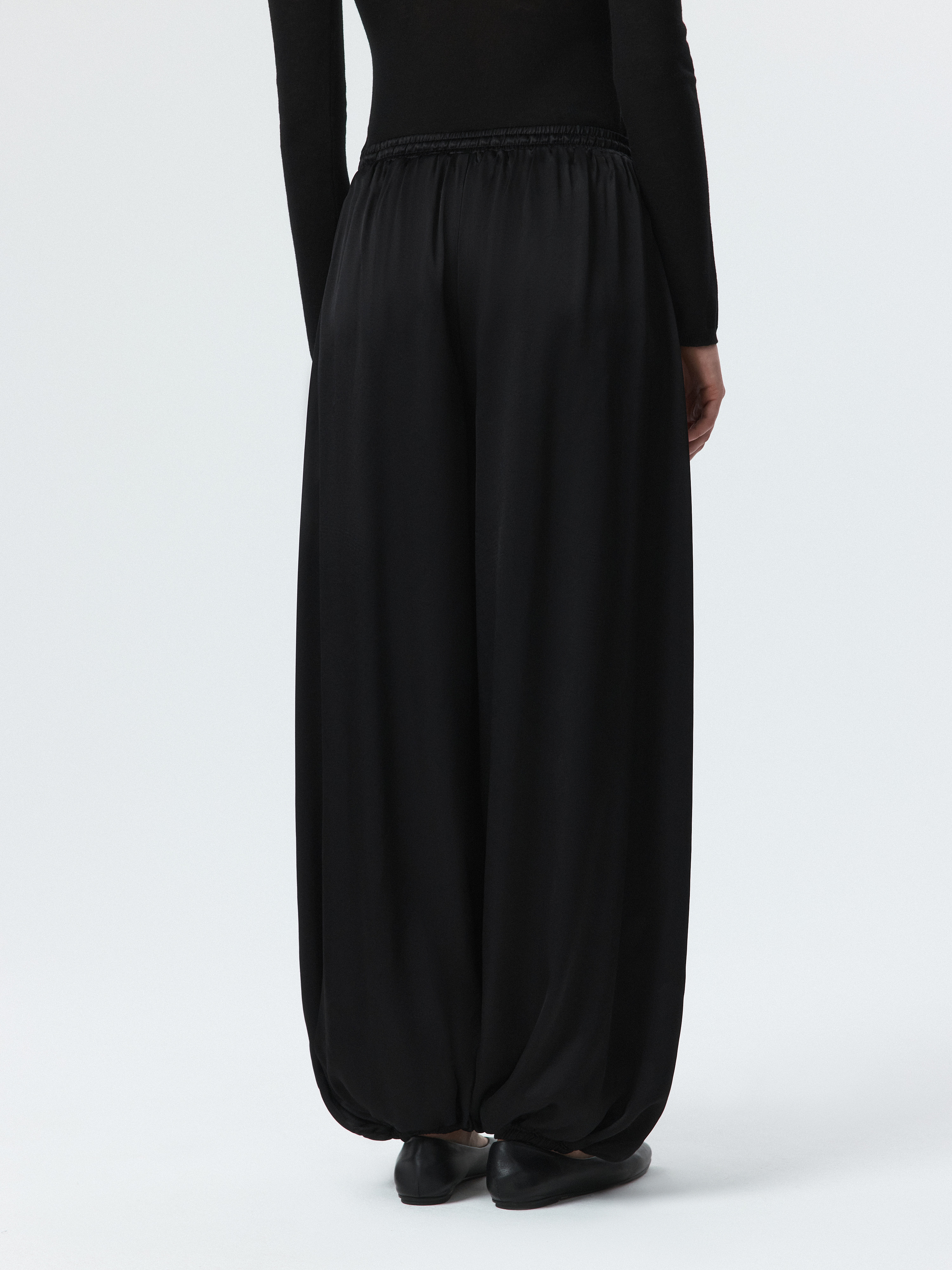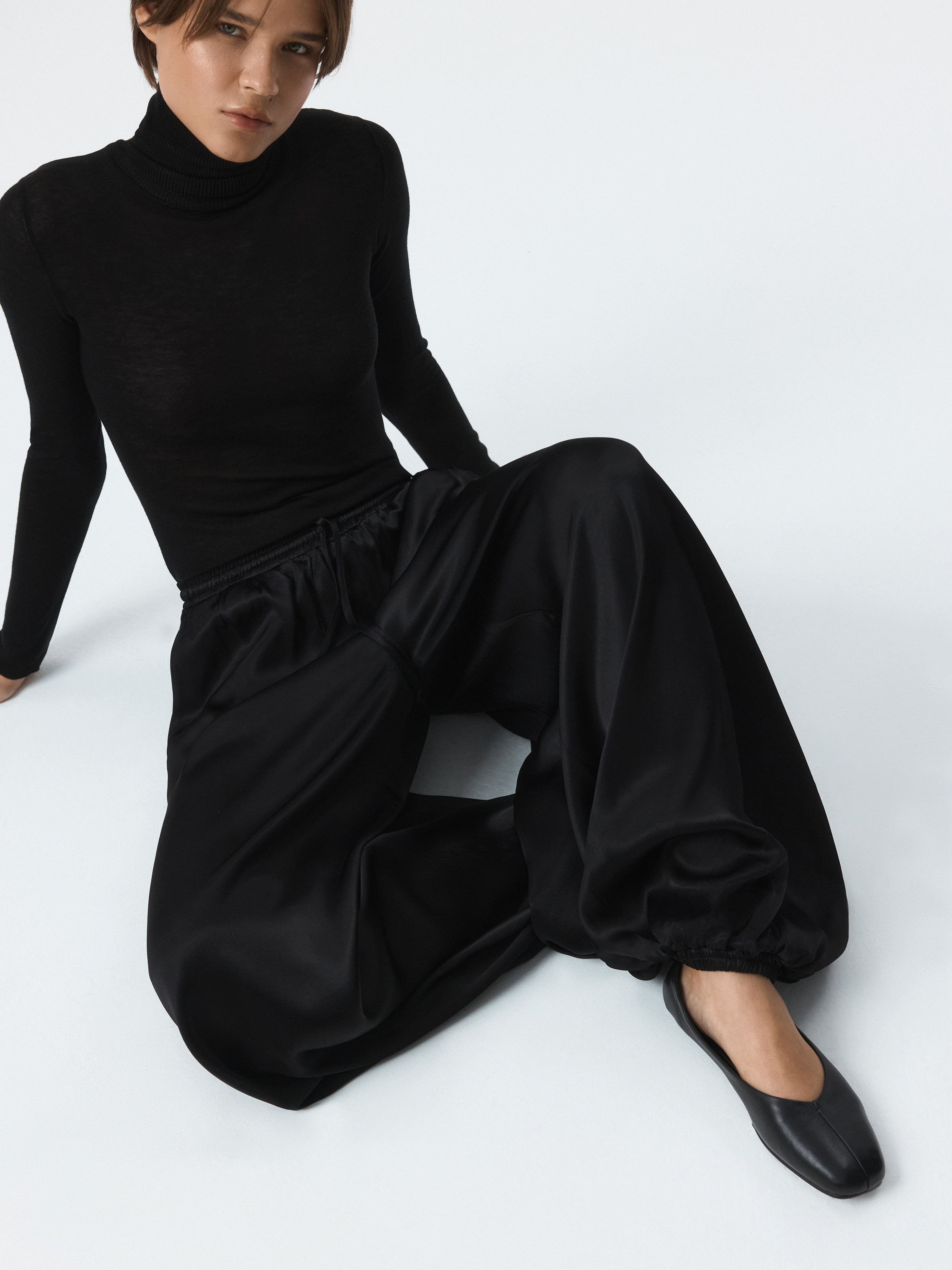 Атласные шаровары – новая версия трендового силуэта. Легкий шелковистый текстиль с приятной на ощупь фактурой струится вдоль тела и не просвечивает. Кулиска позволяет отрегулировать удобную посадку выше или ниже на талии, а низ на резинке комфортно облегает щиколотку.