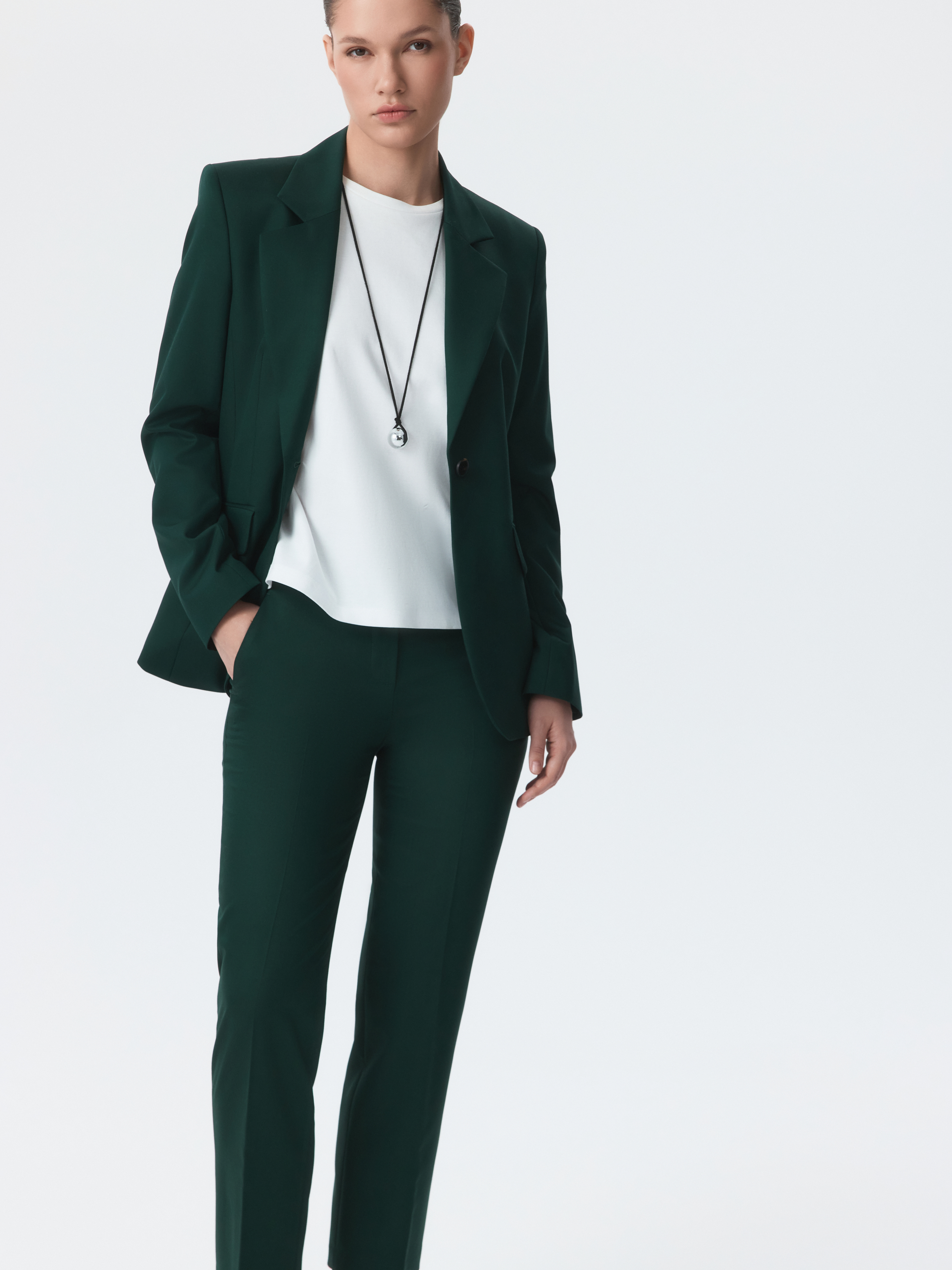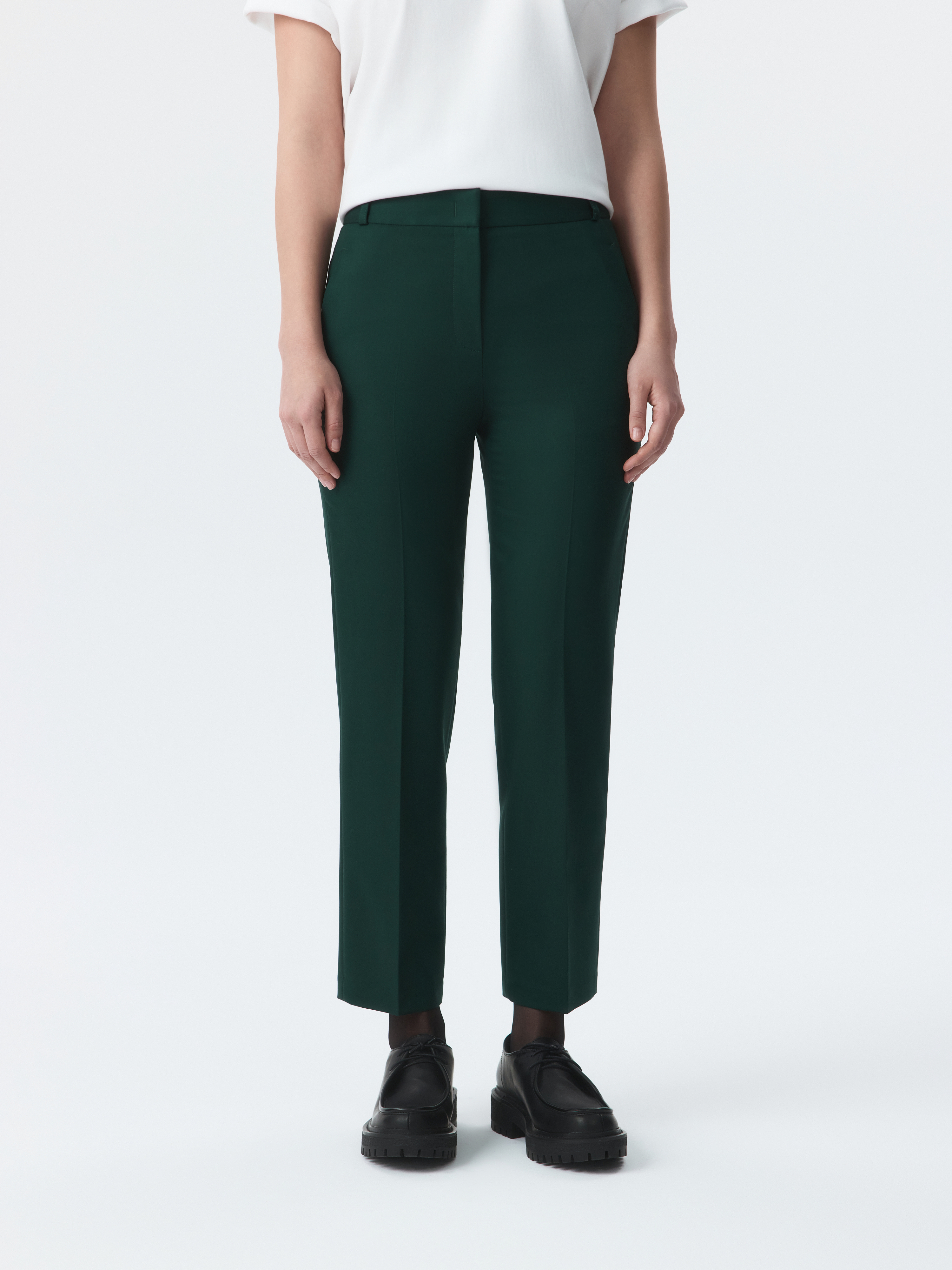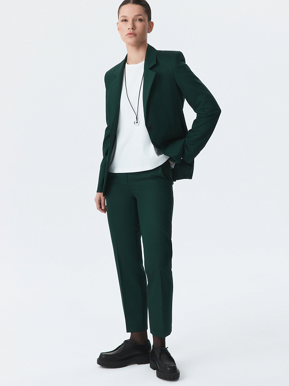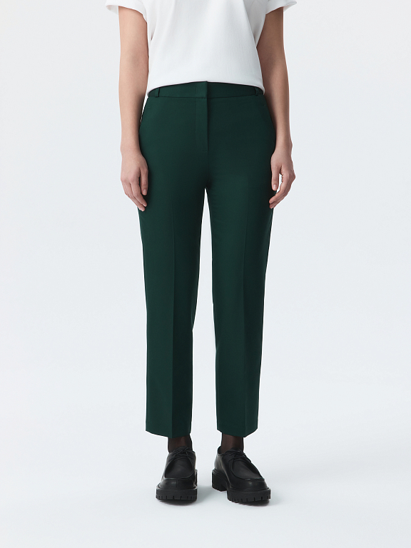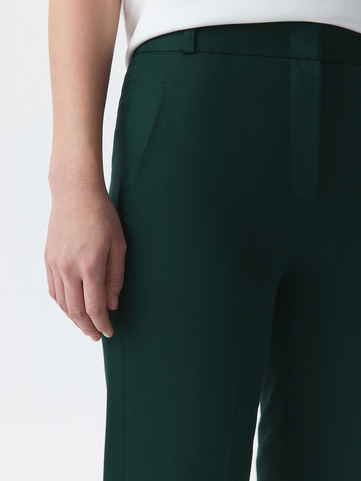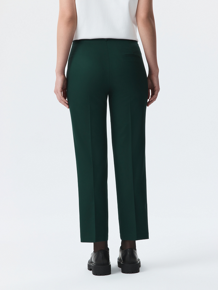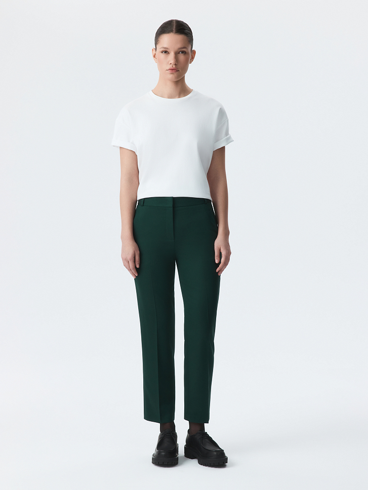 Облегающие брюки в классическом стиле будут актуальны на все случаи жизни. В меру плотный костюмный текстиль на основе вискозы не тянется и комфортно сидит по фигуре, аккуратно подчеркивая силуэт. Укороченная модель 7/8 сочетается с обувью на каблуке и на плоском ходу.