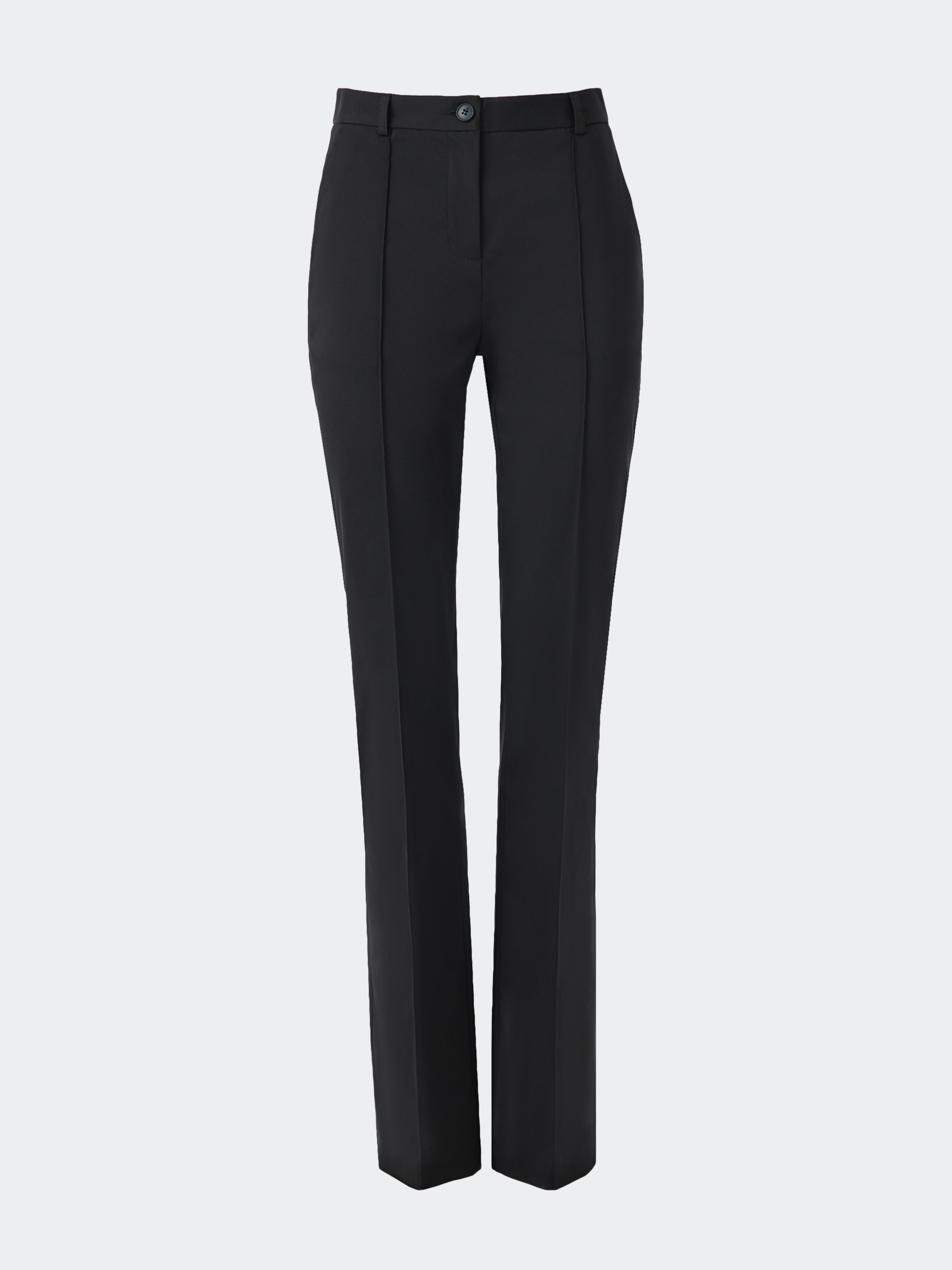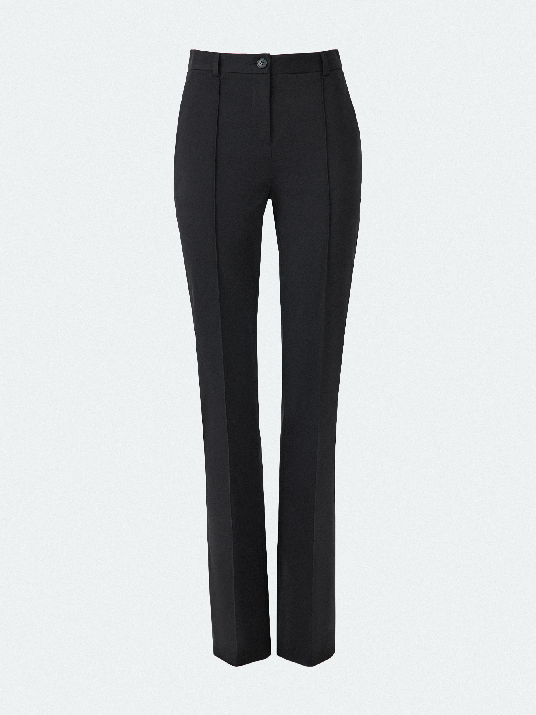 Лаконичные брюки – модель для любого случая и под любое настроение. В меру плотный гладкий текстиль на ощупь напоминает плащевку – он не тянется, не мнется и не требует особого ухода. Брюки облегают в бедрах и расклешаются от колена.