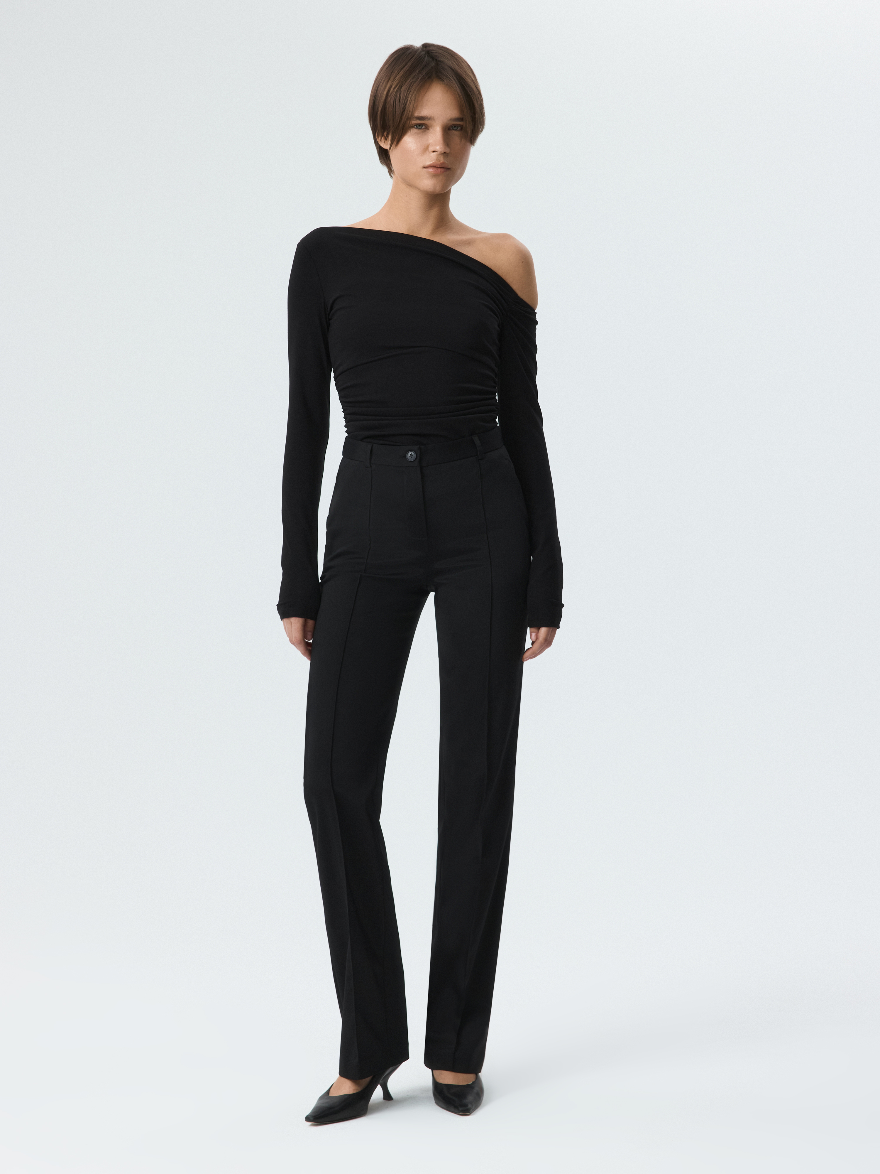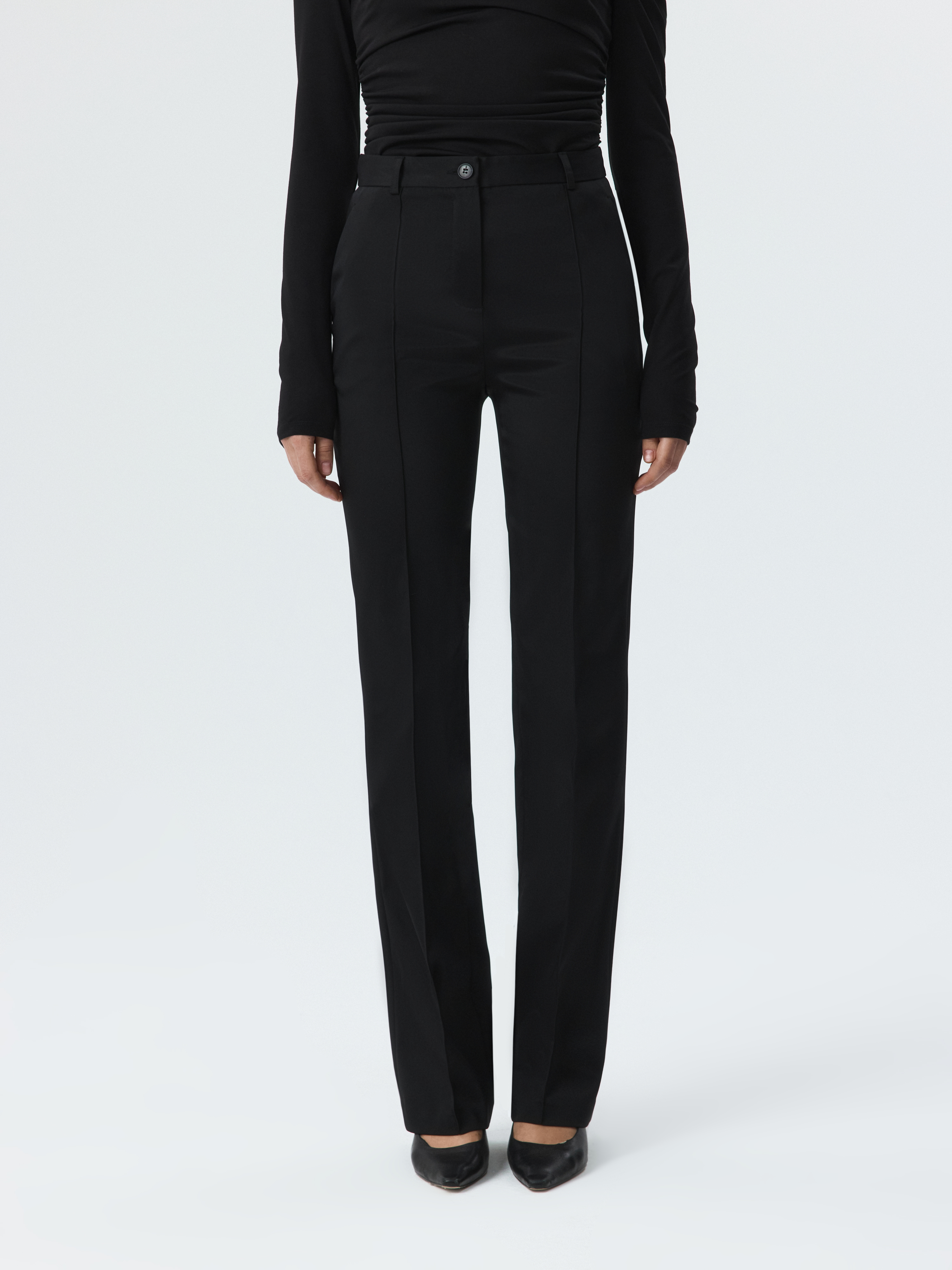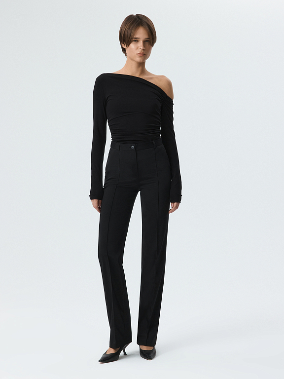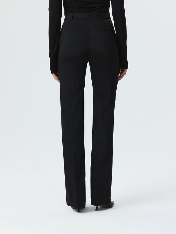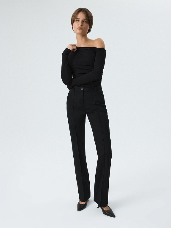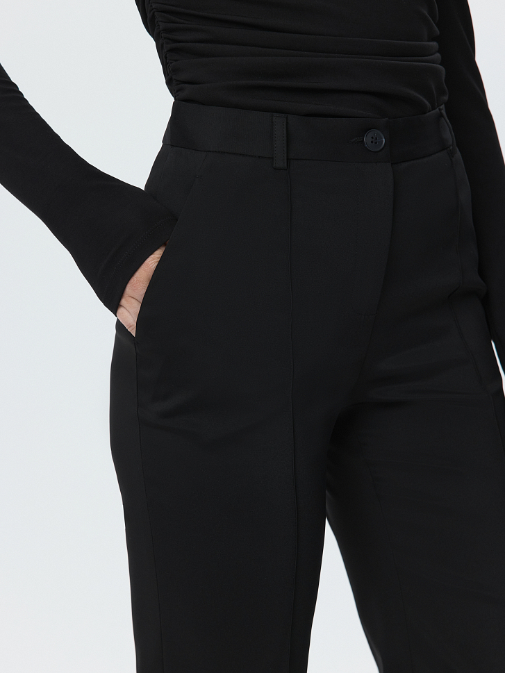 Практичные брюки слегка расклешенного фасона – актуальный предмет гардероба на каждый день. В меру плотный гладкий текстиль на ощупь напоминает плащевку – он не тянется, не мнется и не требует особого ухода. Простроченные стрелки останутся безупречно ровными.