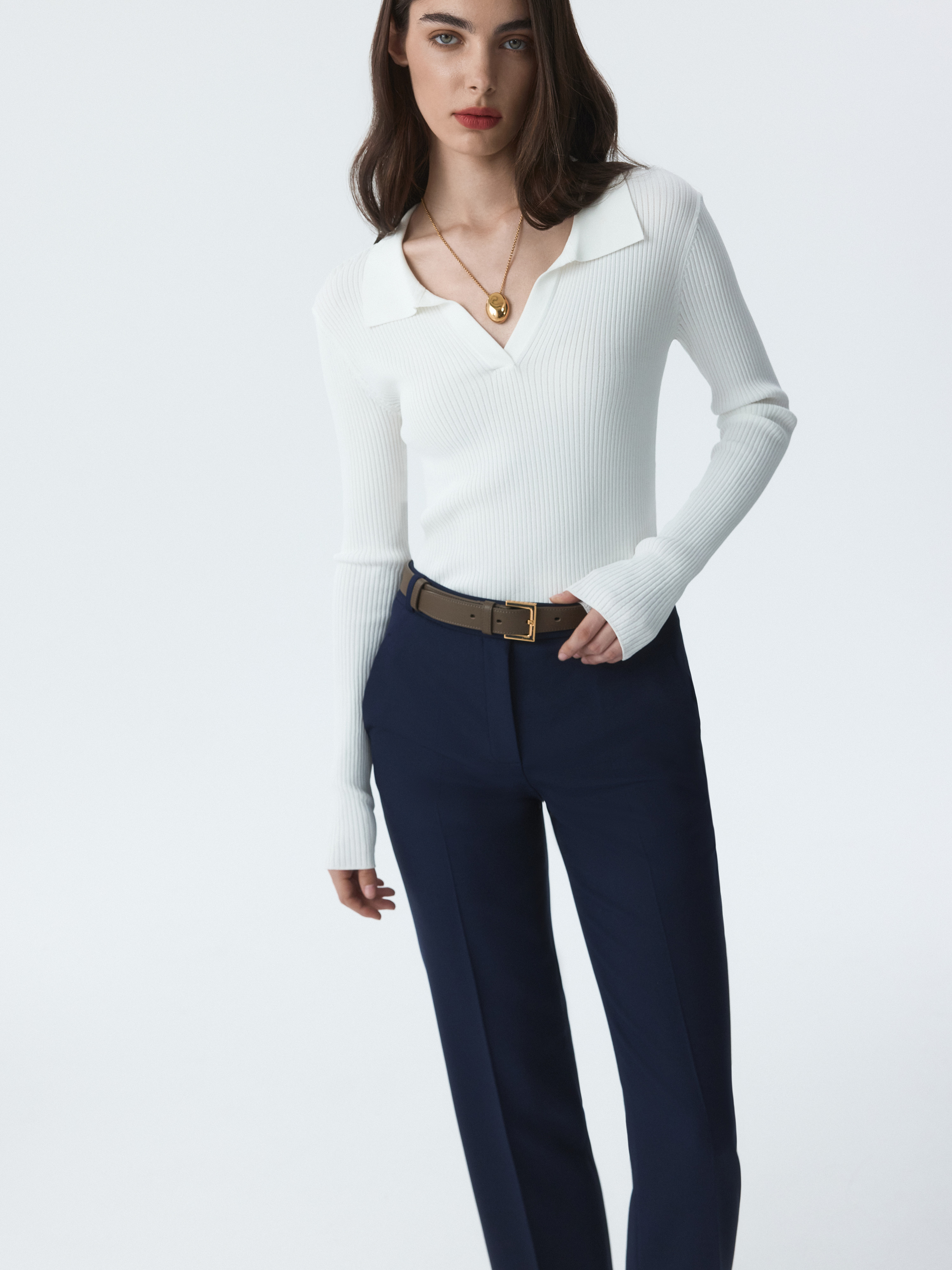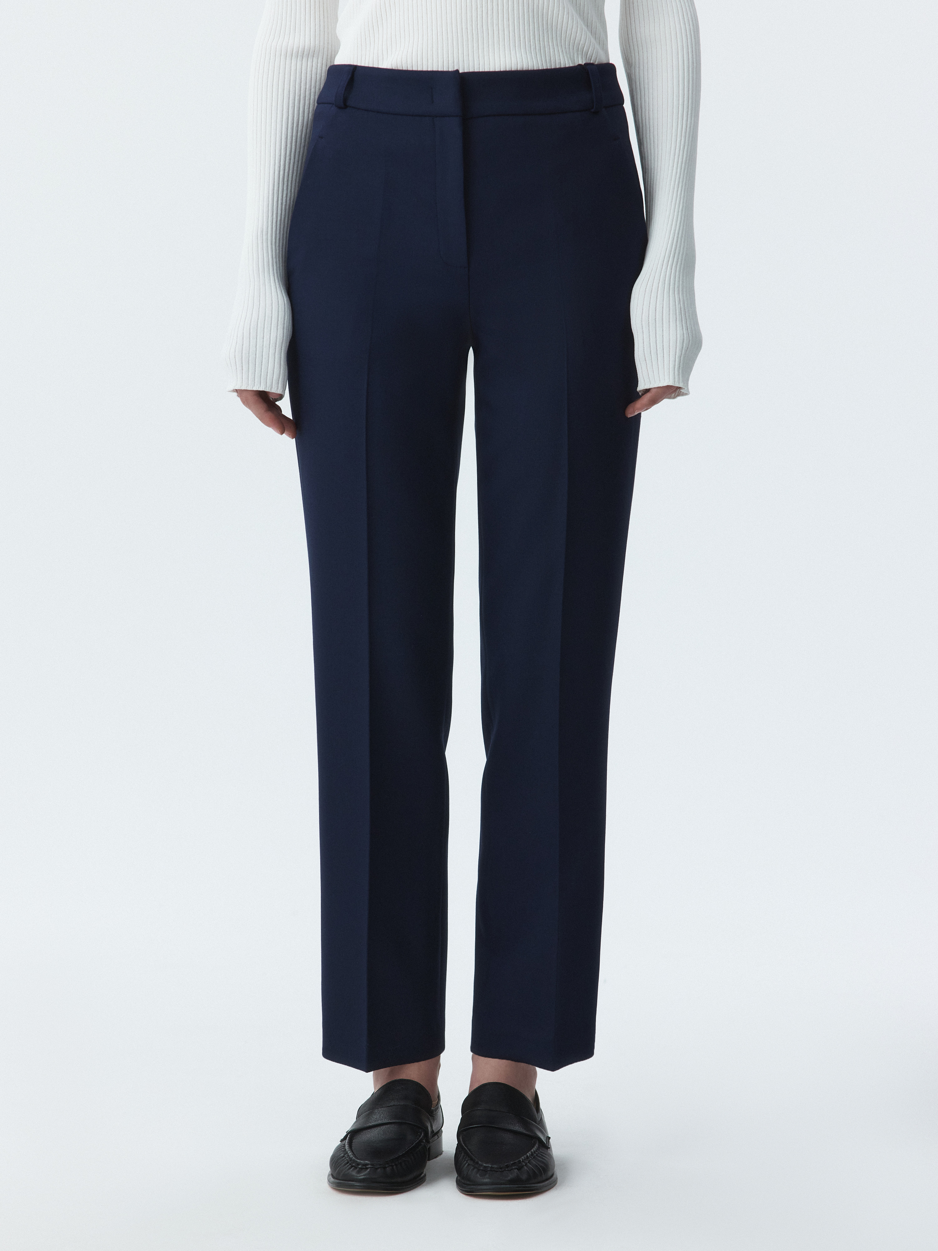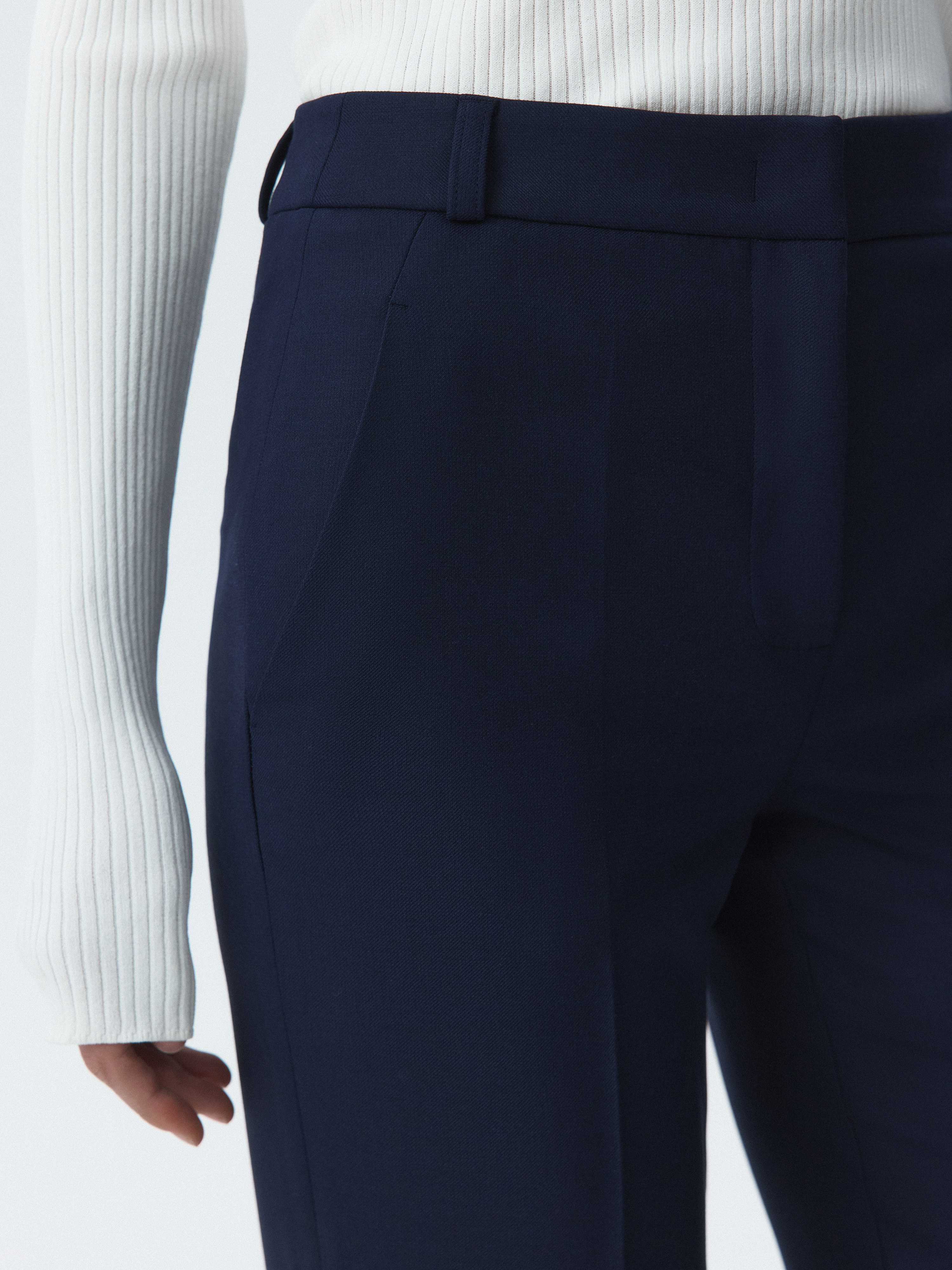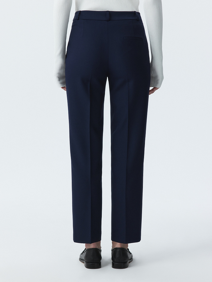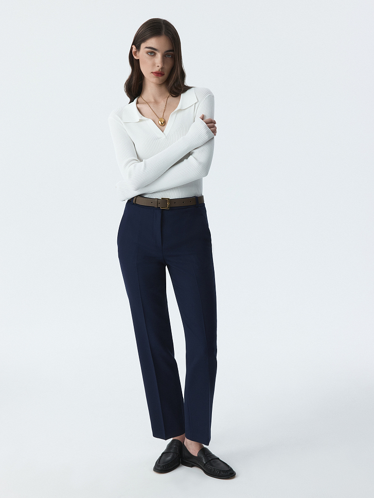 Брюки зауженного кроя станут базой для офиса и за его пределами. Фактура плотной костюмной ткани обладает формоустойчивостью, а способность слегка тянуться благодаря эластичным волокнам создаст комфортную посадку в бедрах.